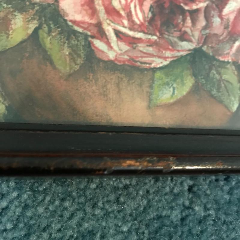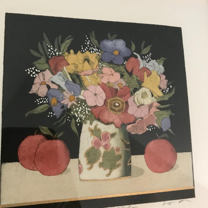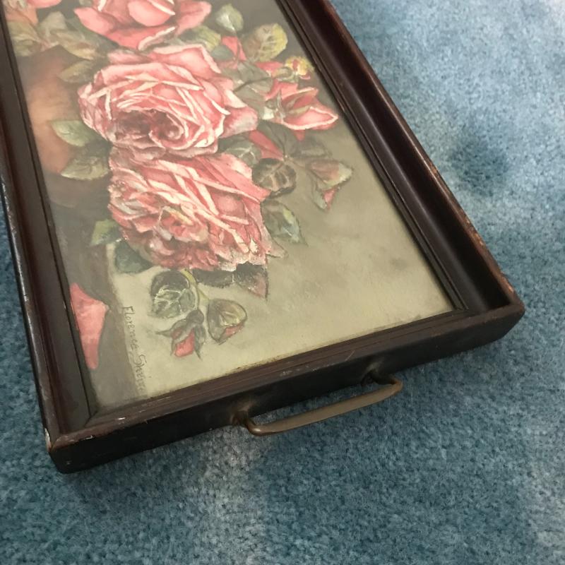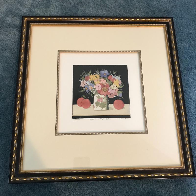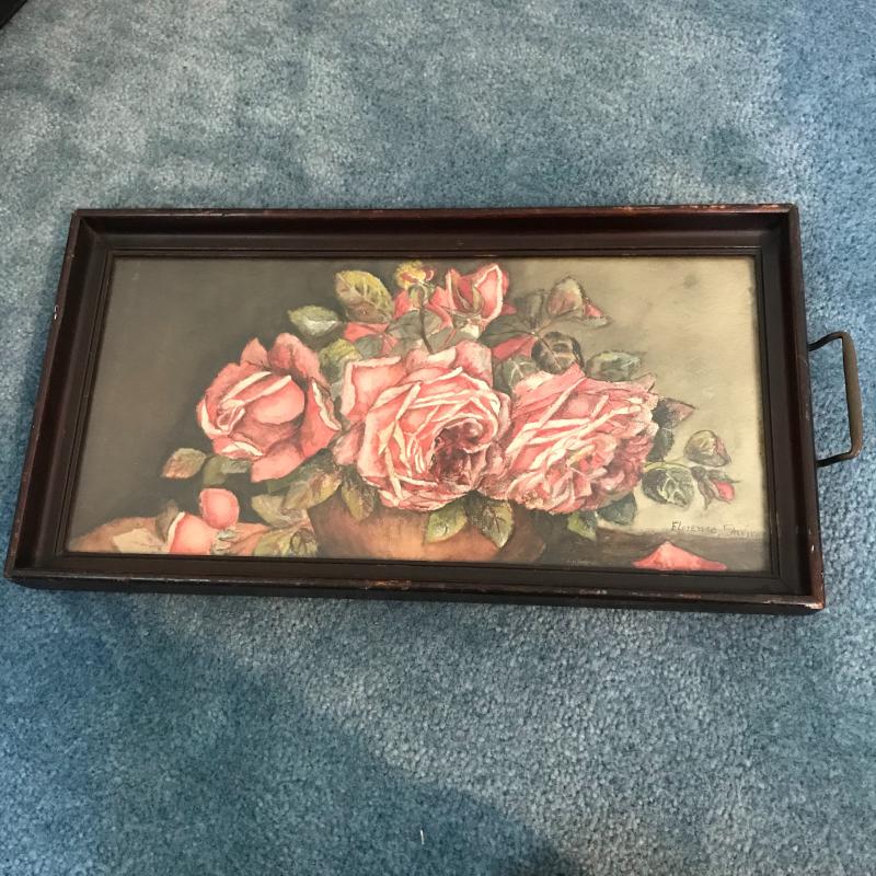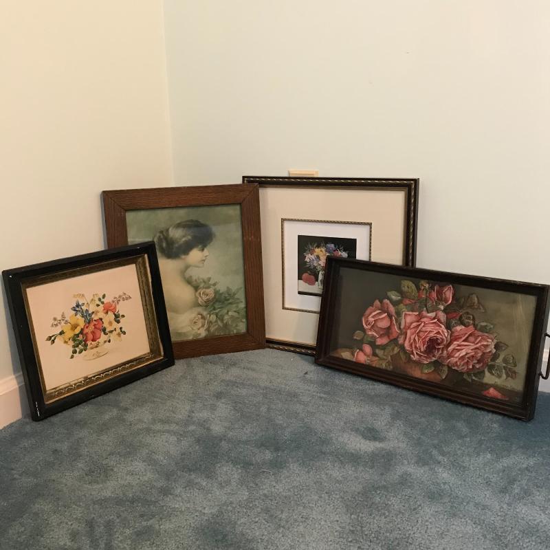 Four delicately themed pieces of art, three signed and one numbered. The numbered piece measures approx. 15.25”x15.5”. The long one with pink flowers has a handle and glass top and can be used as a tray. Some wear and damage noted in photos, but in nice shape. Local pick up only in Arden, NC.