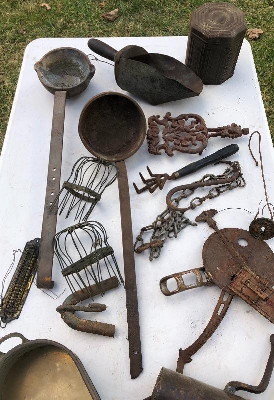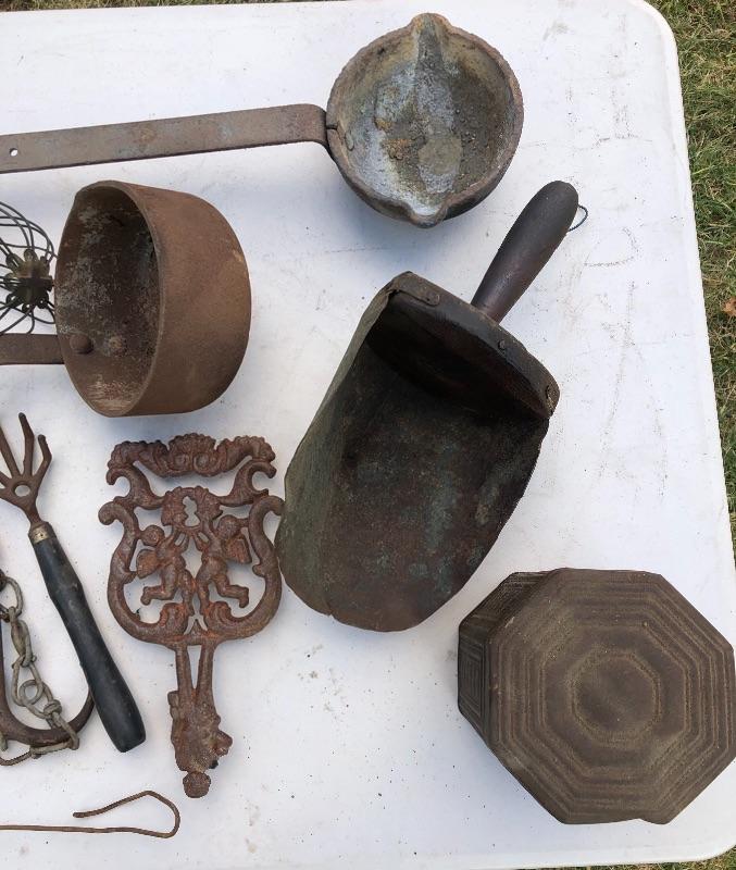 Assorted Vintage and Metal Primitives, including antique grains scoops and cast iron labels. A very old primitive punched tin with lid, and more. MM Please see all pictures for content of the lot, condition of the lot, and measurements if taken. Pictures are the best representation of the items listed and items are untested unless indicated in description. Thank you for looking and have fun bidding!
