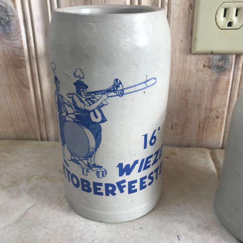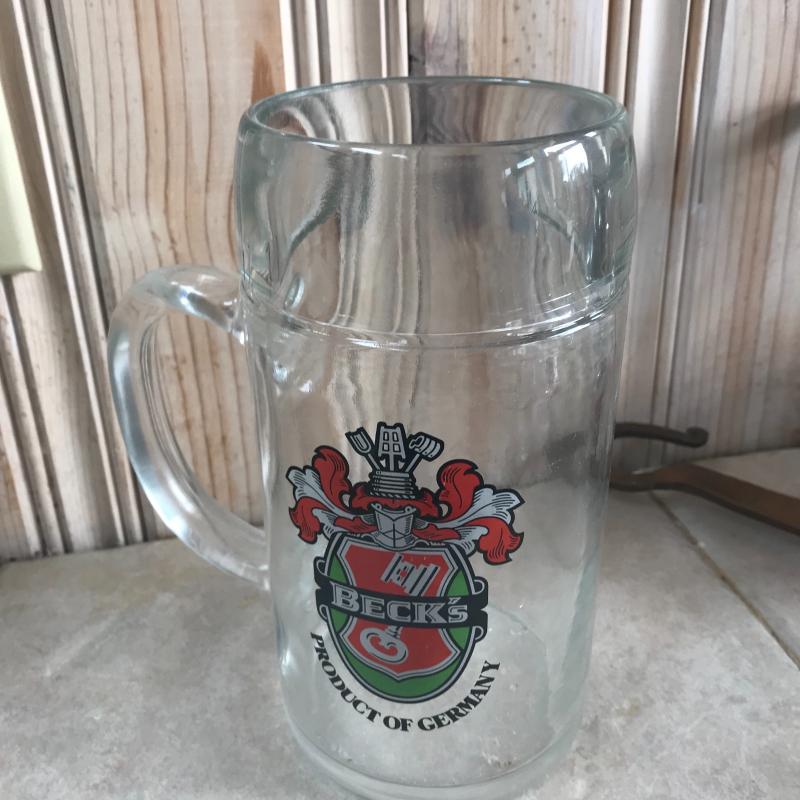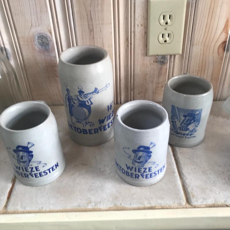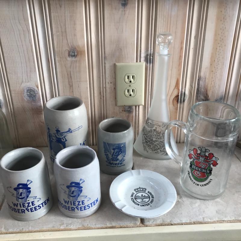 Four Stoneware Octoberfest Steins and one Beck’s Glass Stein. Lot also includes a decanter with city map on it as well as ash tray which has a crack. Local pick up only.