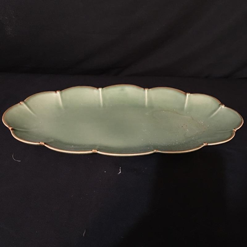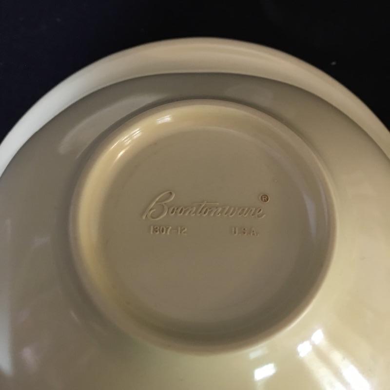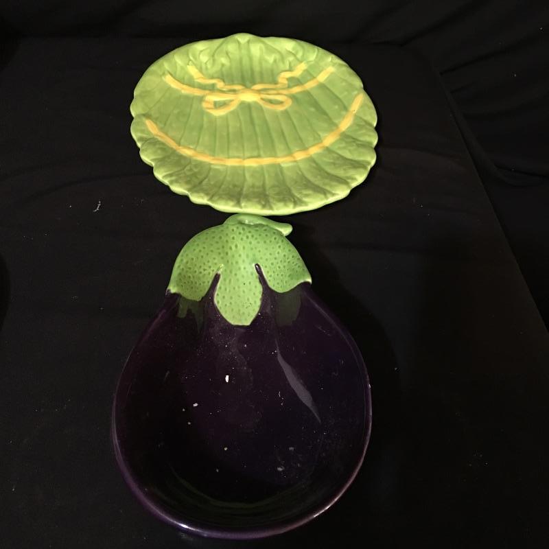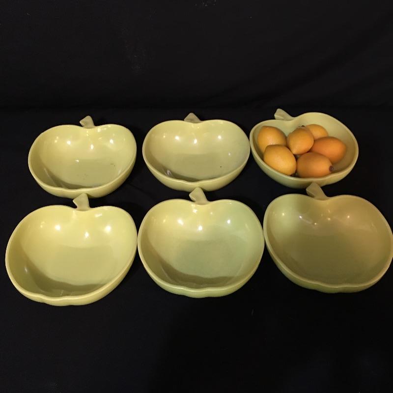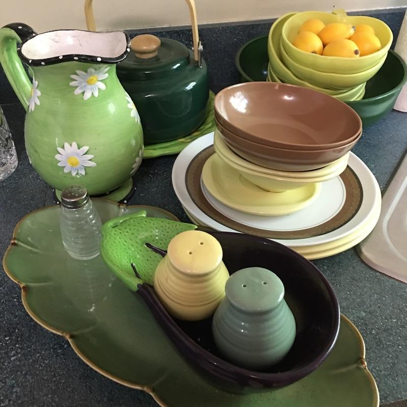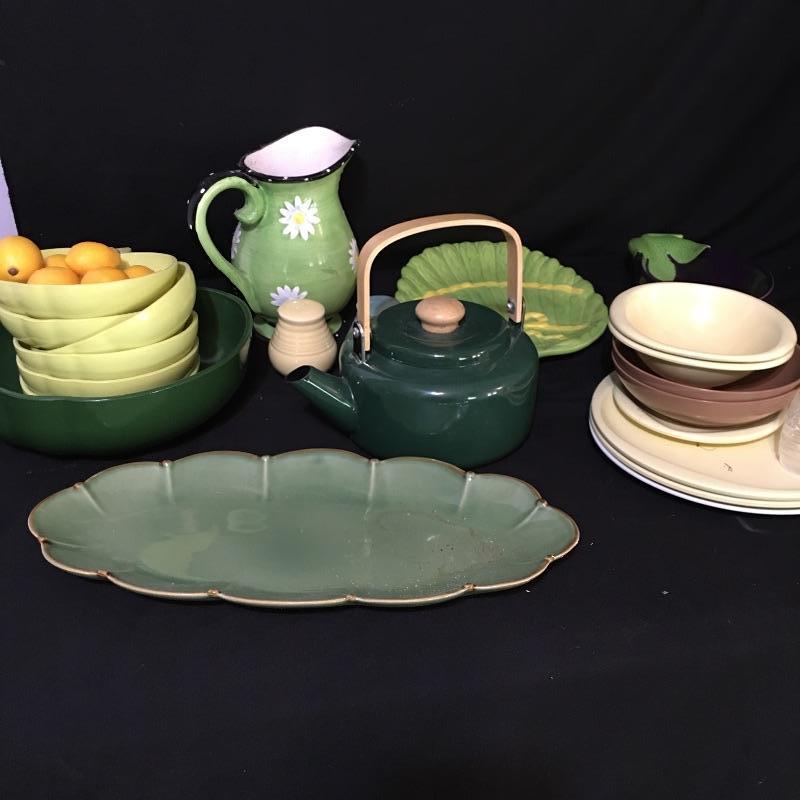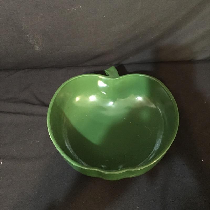 Green apple bowl and more. Lot include green apple bowl with six smaller apple bowls, vase with flower design, eggplant bowl, green serving dish, assortment of Boontonware and more. This lot will remind you of the good old days with its unique collection of dishes. Large apple bowl measures 10” x 11” x 3.25”.