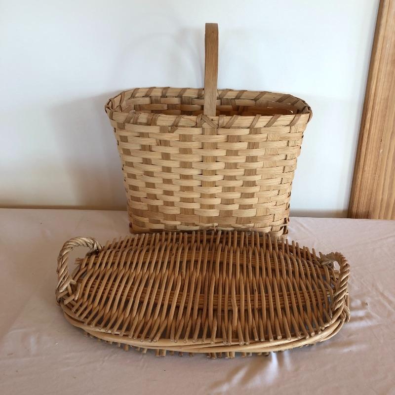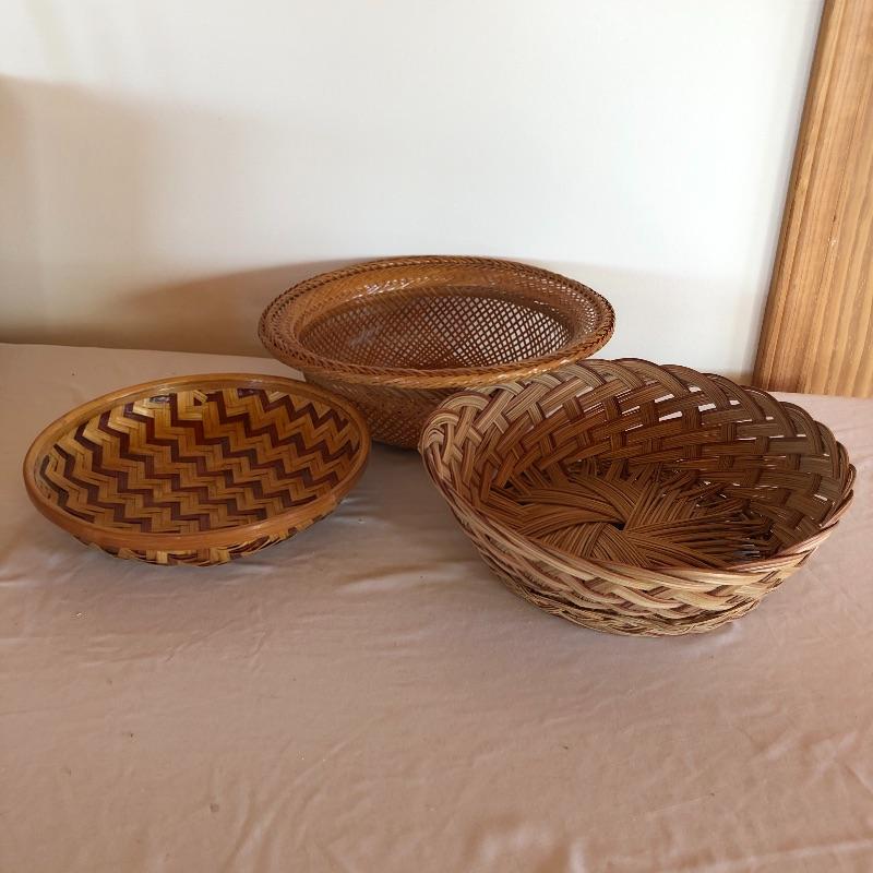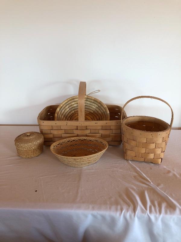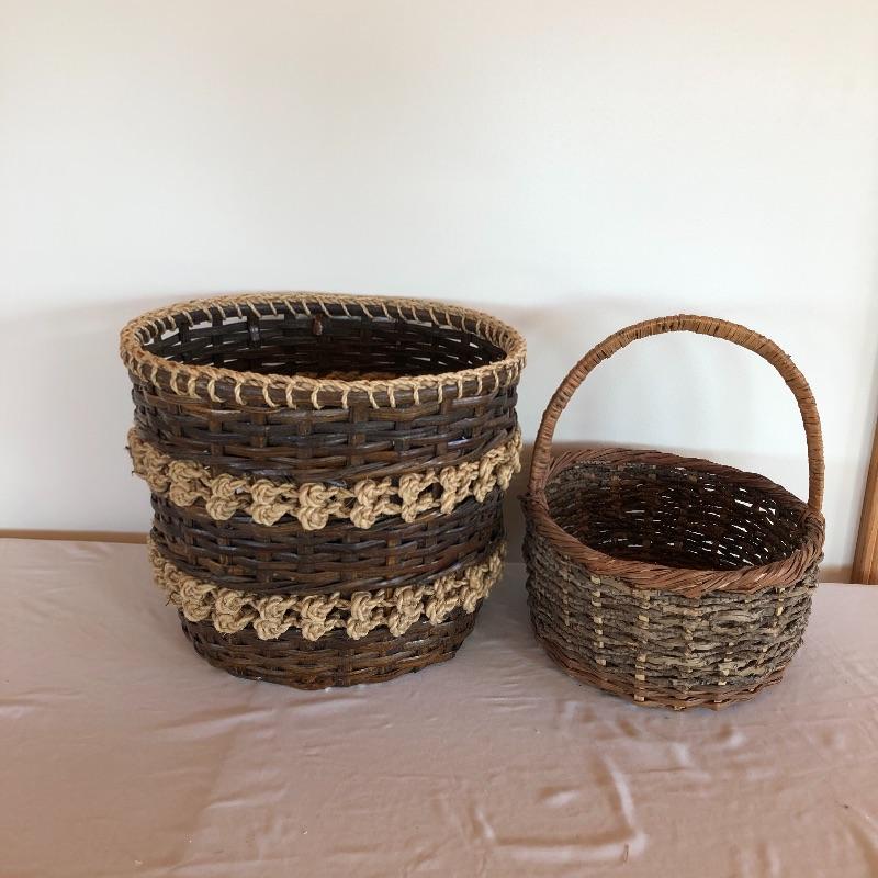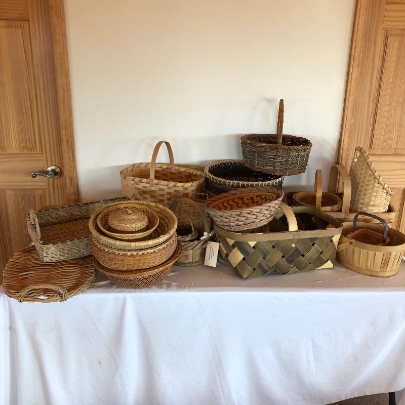 Over twenty baskets in a variety of sizes, styles and materials are included in this lot. Be ready for your next day out with these handy baskets. Dark circular basket measures 13.5”D x 11” tall.