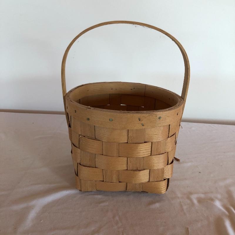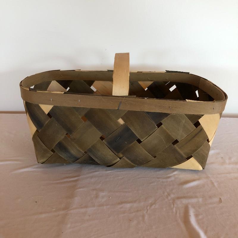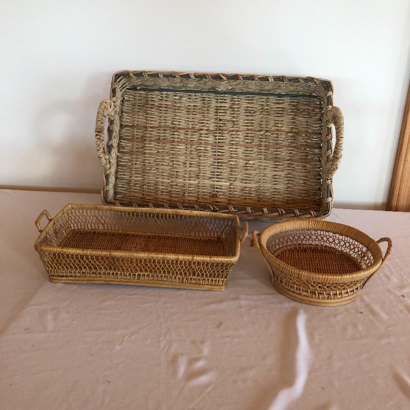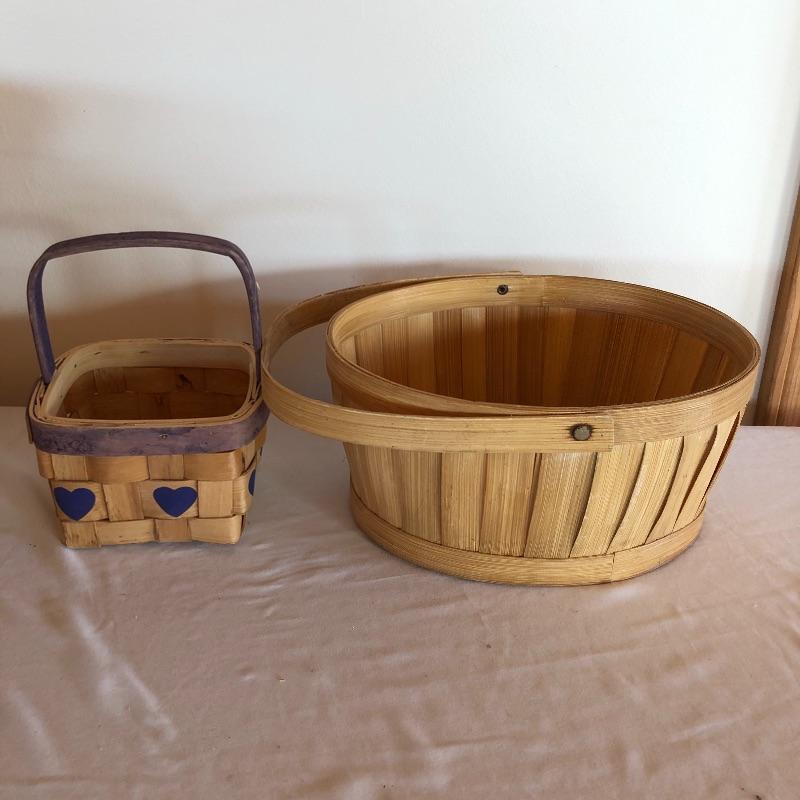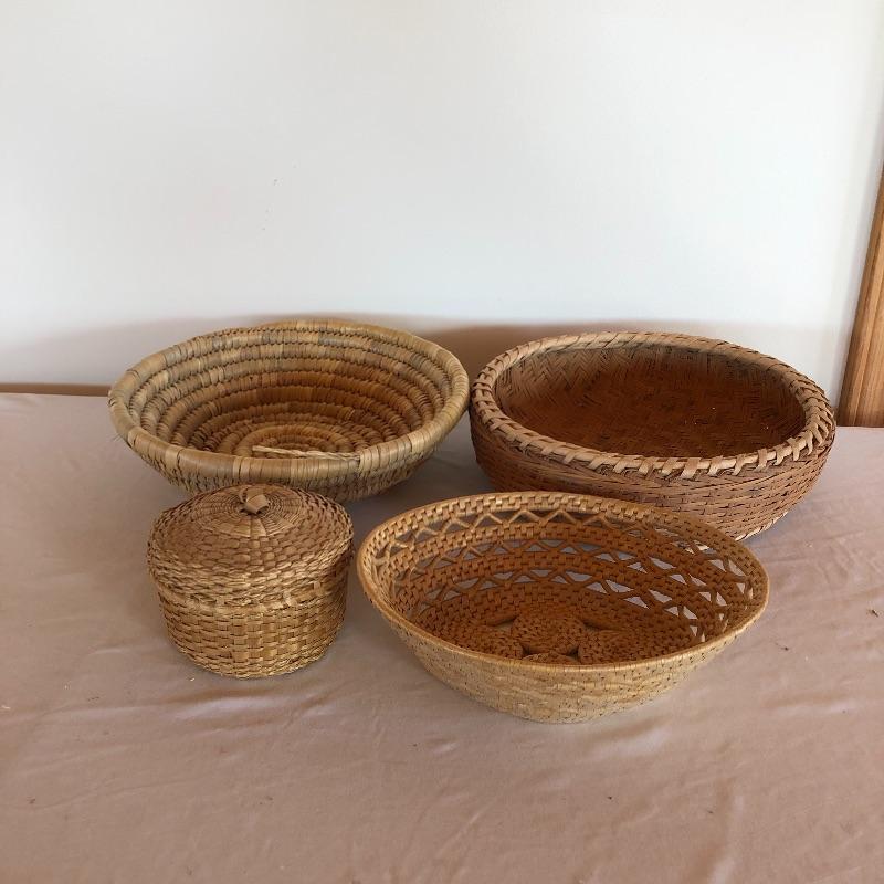 Over twenty baskets in a variety of sizes, styles and materials are included in this lot. Be ready for your next day out with these handy baskets. Dark circular basket measures 13.5”D x 11” tall.