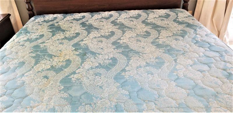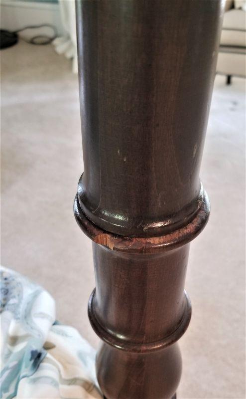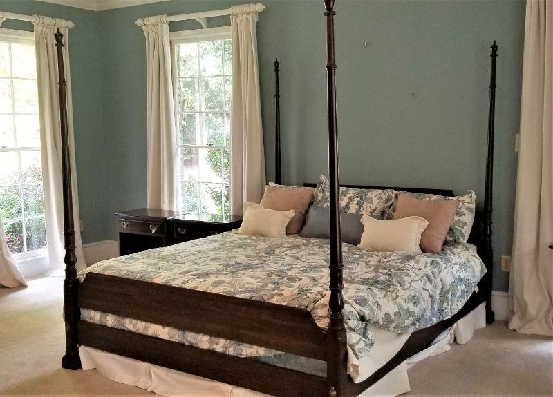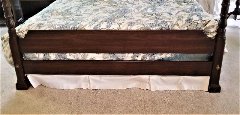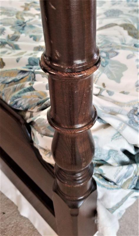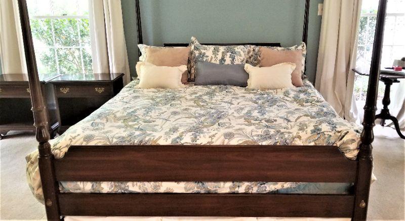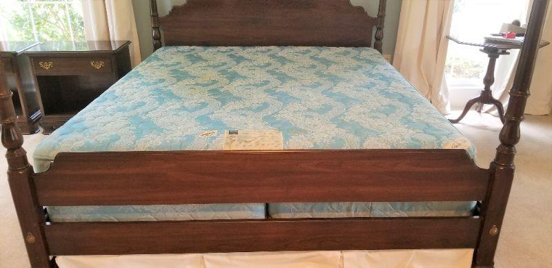 Classic 4 poster King bed - older mattress (shows use) - Posts lift off for easy moving. Some scuffs on one post (see photos). 81" tall, 6 feet across. You get all the matching bedding with it.