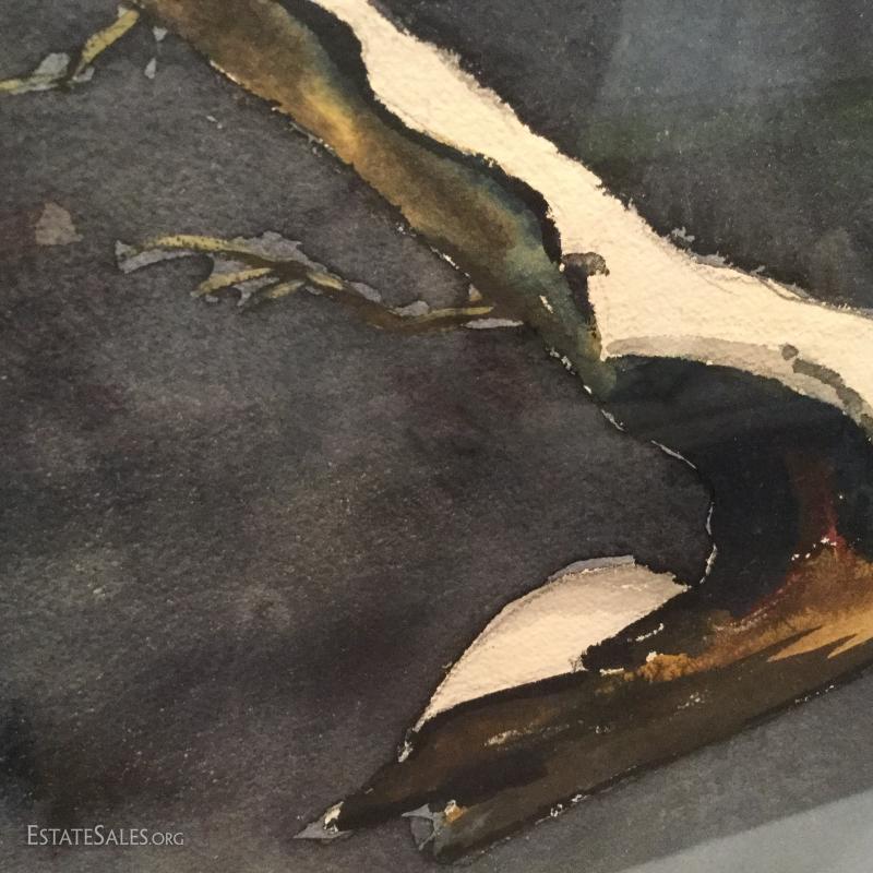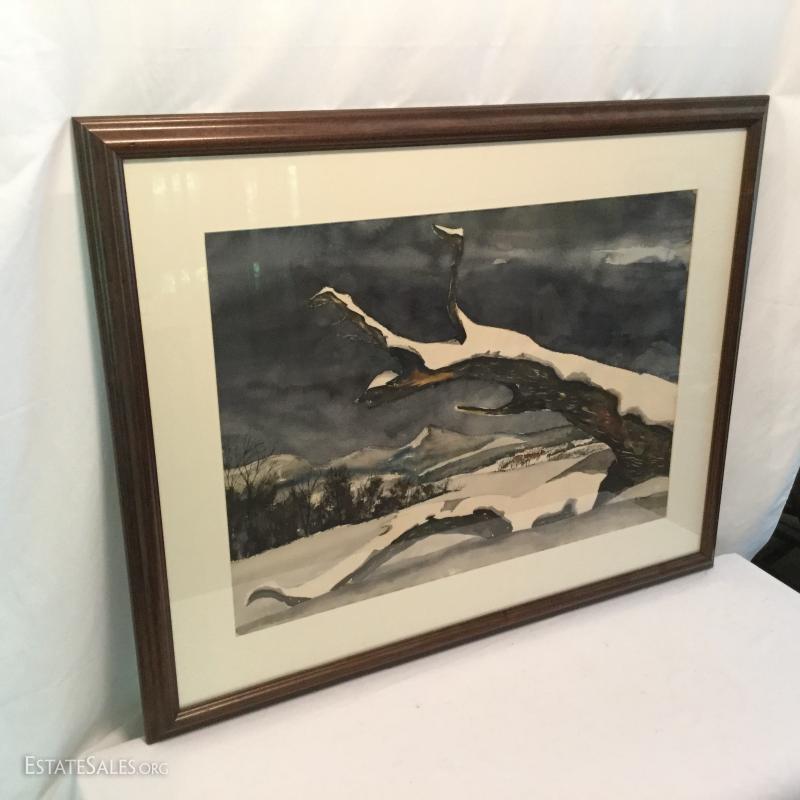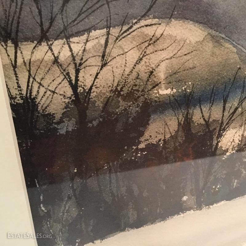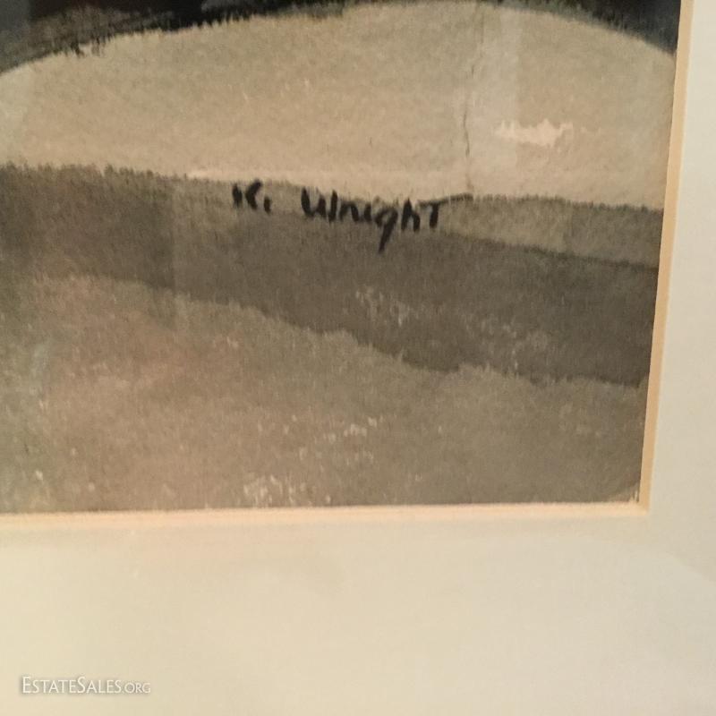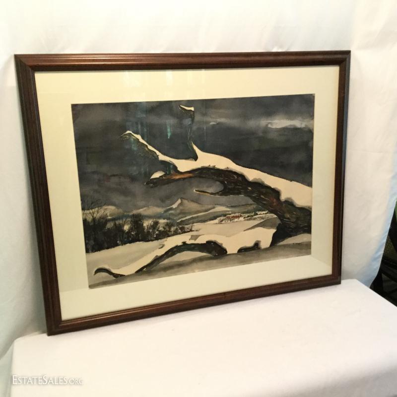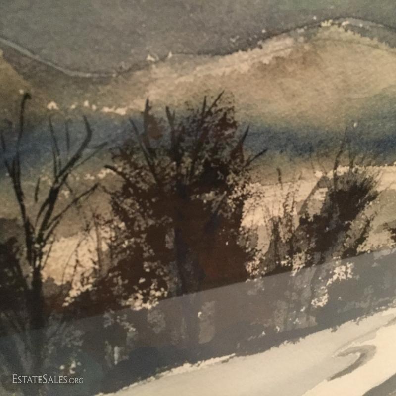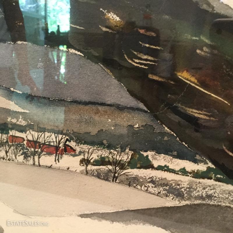Framed winter landscape watercolor by K. Wright. She was the spouse of Stanley Marc Wright and also a collected artist. 39.5"l x 31.5"w