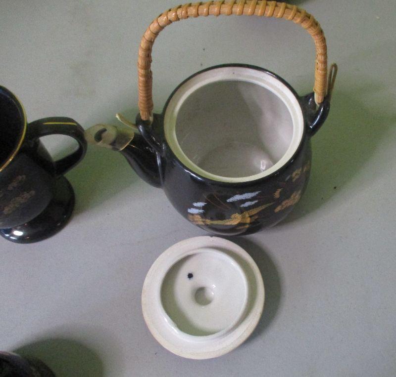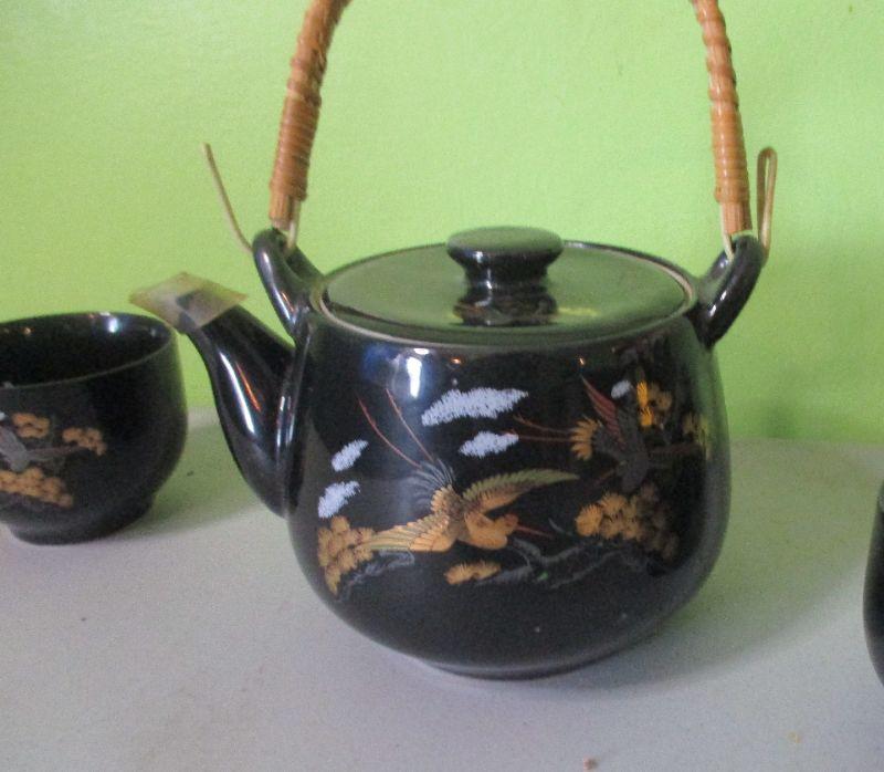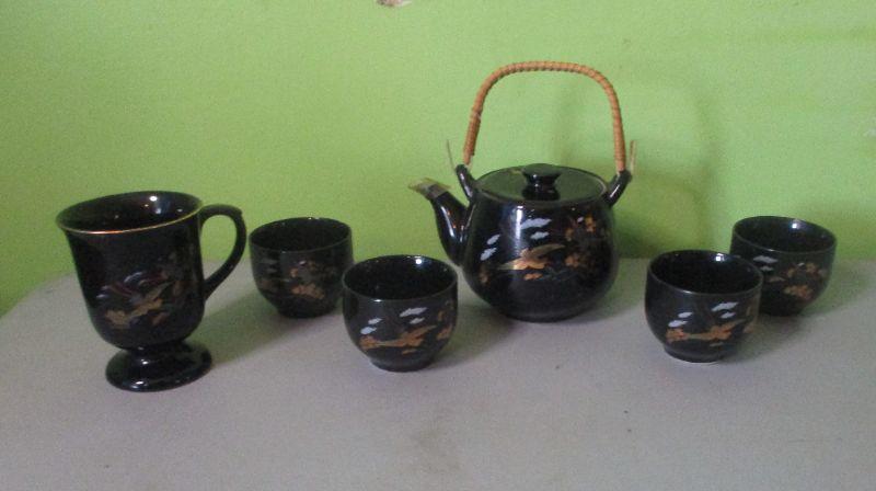 This tea set is marked Japan on the base of the cups. There is an extra mug that was found that matches the set, but we couldn't find any other mugs. The only issue is a small chip on the rim of one of the small cups, otherwise this set is in excellent condition.