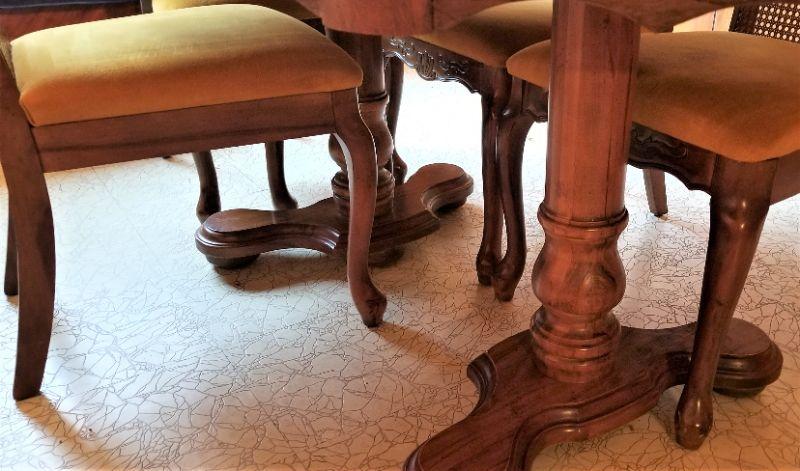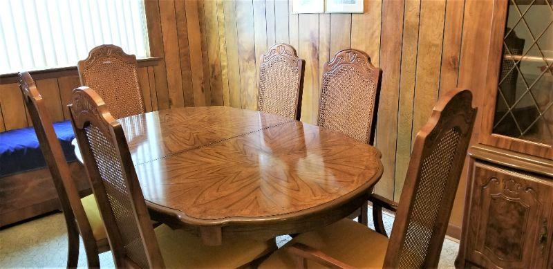 Mid century, early 1970's Cane Back Dining Room Set - Table and 6 chairs (two are Captain's Chairs) - pedestal table - has a leaf (leaf has a scratch) - 64" long, 42" wide, 29.5" tall. Chairs are 20" across, 20" deep, 44" tall and in good vintage condition. Leaf is 18" across and 42" wide. Cane in good condition. Table has a couple of small rubbed spots (see photo). A solid set.