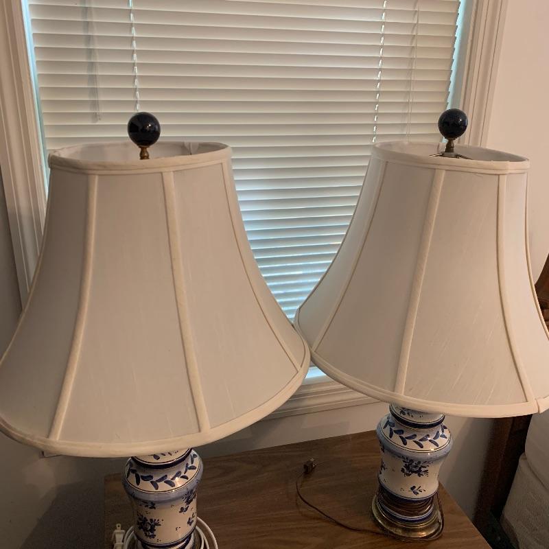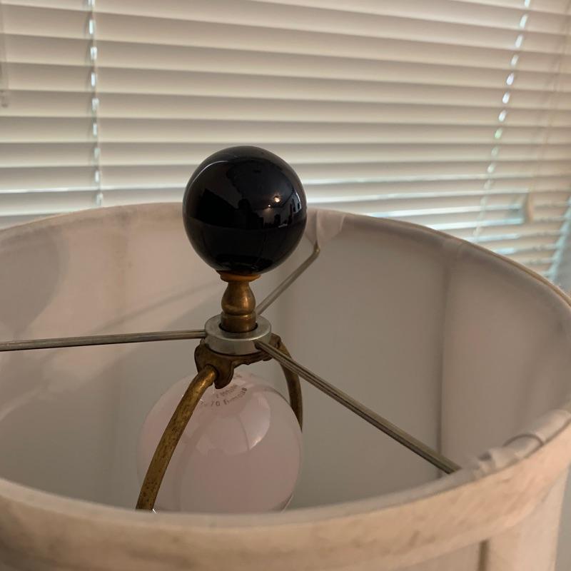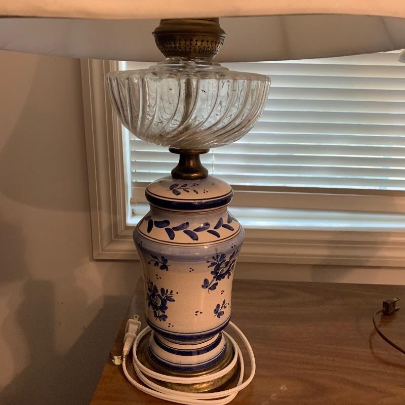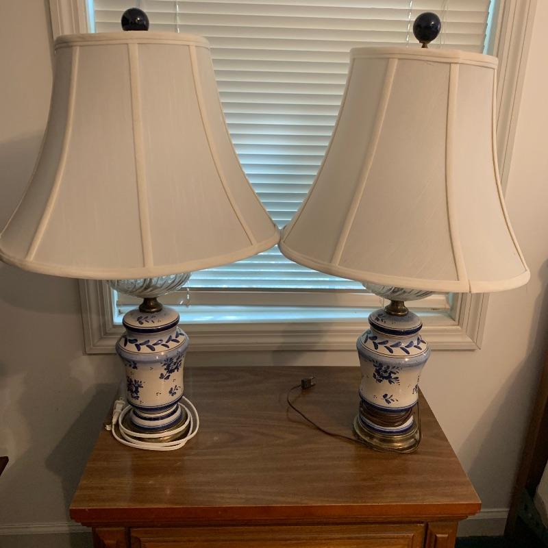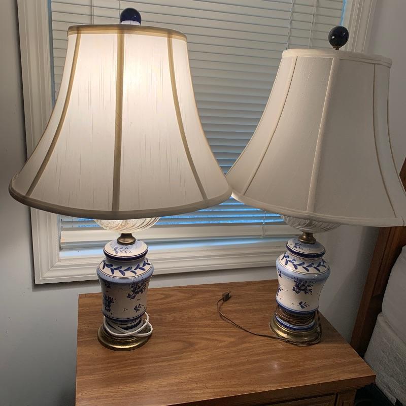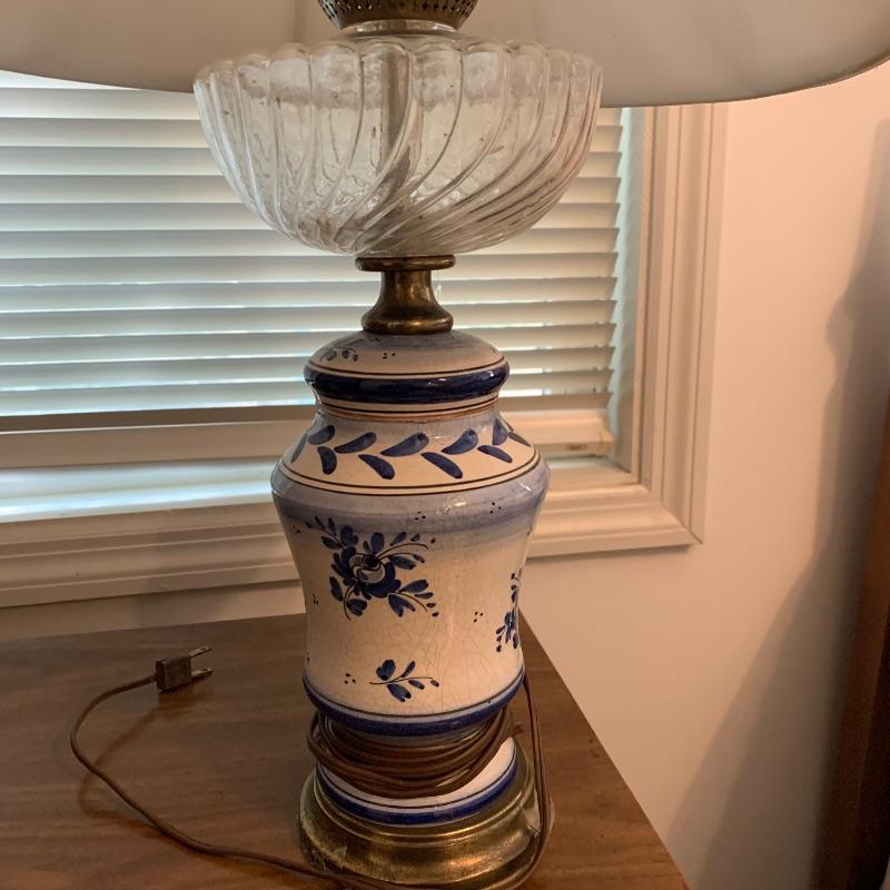These Glass and Ceramic lamps are three way with one lamp having new wiring. Both have shades that are still in good shape. Each stands aprox. 27” tall to top of finial. The glass globes have some