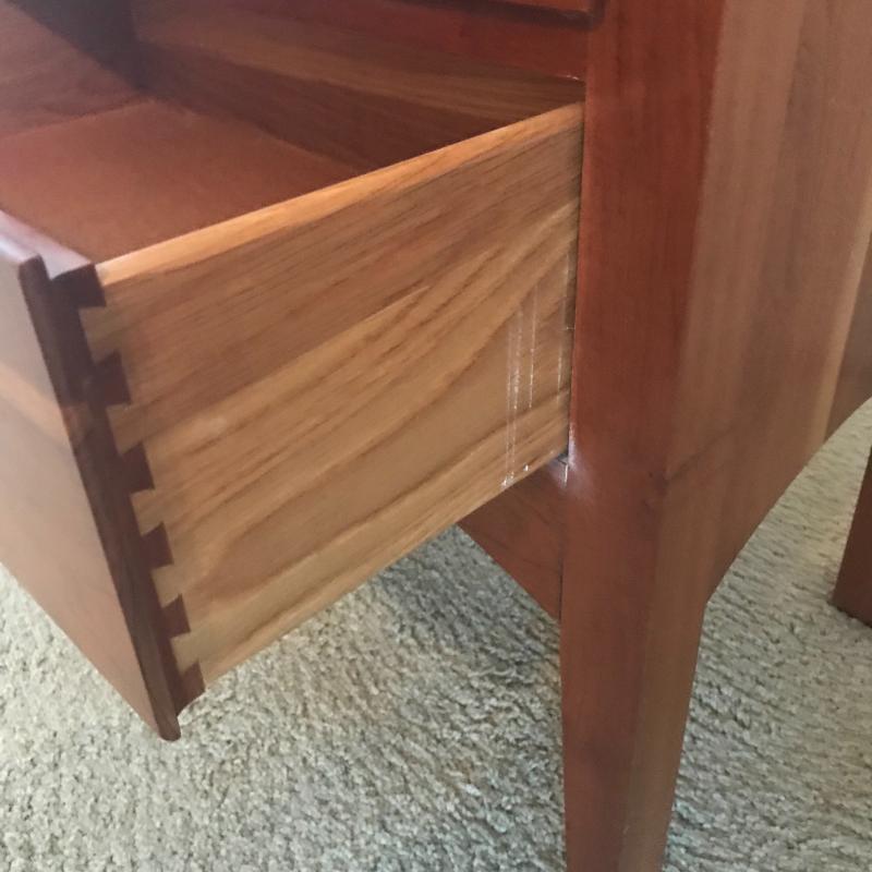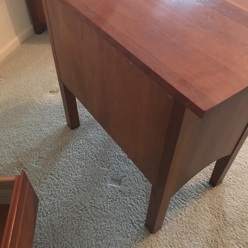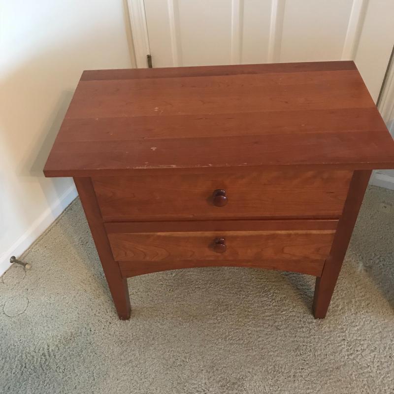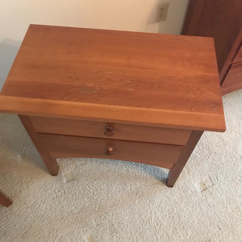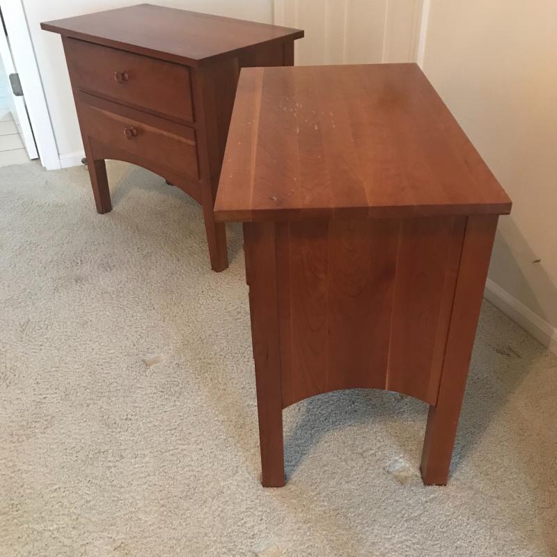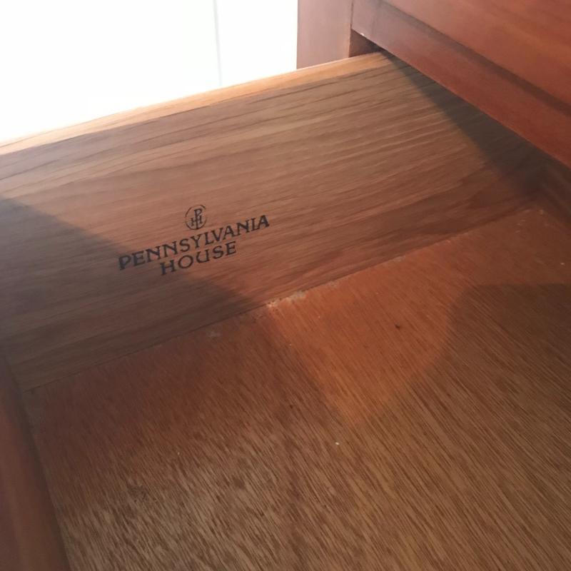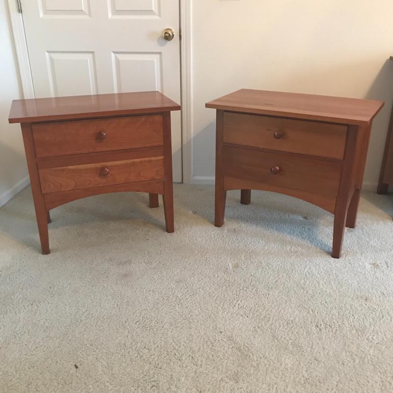 A pair of cherry colored side tables by Pennsylvania House that match items in lots 68 & 69. Each measures 28” x16” x26” and have two drawers. Tops have a bit of wear on them but overall in good shape. This lot is avaialable for local pick up in Asheville, NC only.