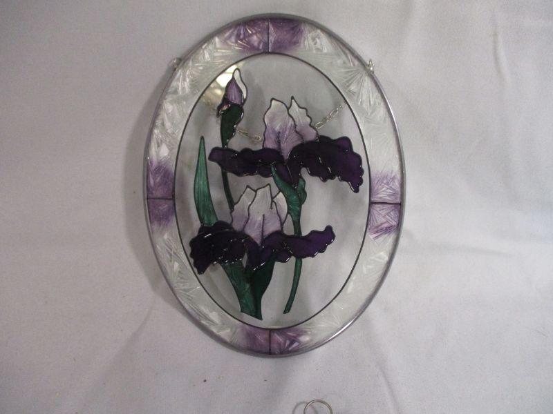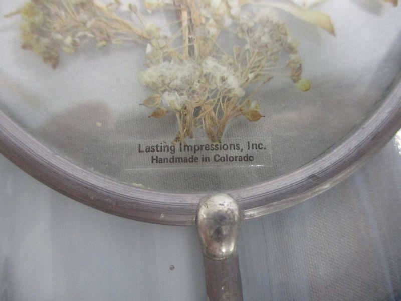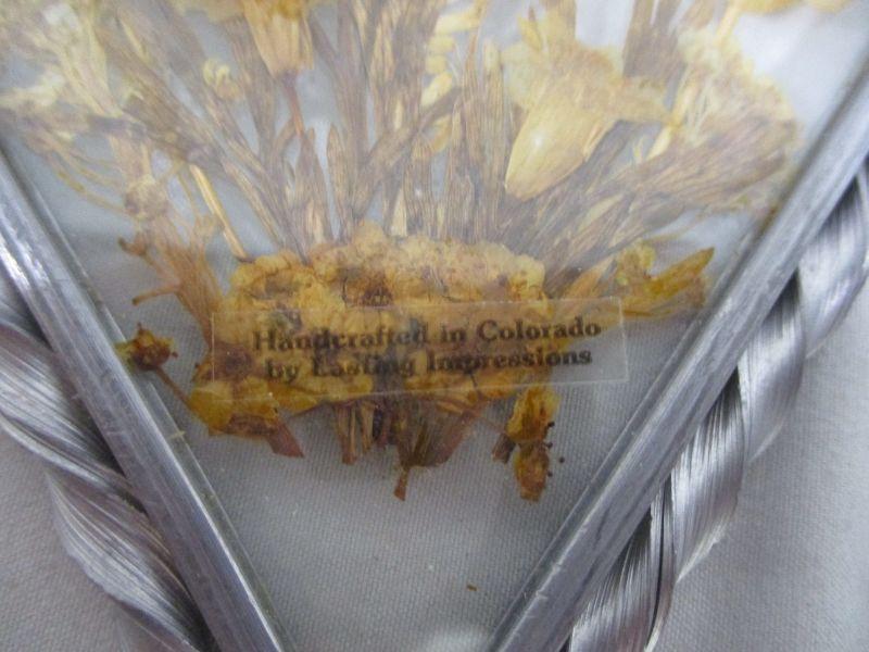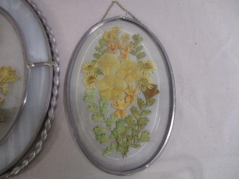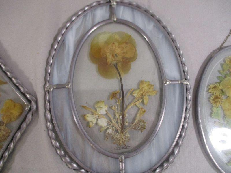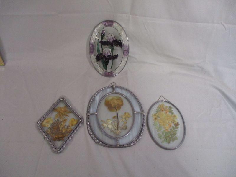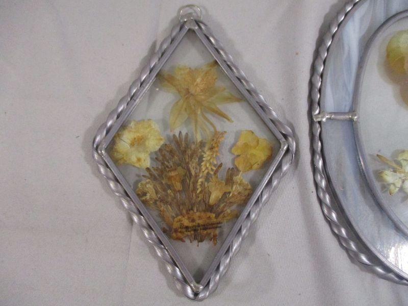 The smallest of these is just over 6" long while the largest is about 8.25". Three have what look like real flowers pressed between two panes of glass, while the fourth is painted glass. All are in excellent condition. The largest one and the diamond shaped one (they have matching frames) are from Lasting Impressions in Colorado.