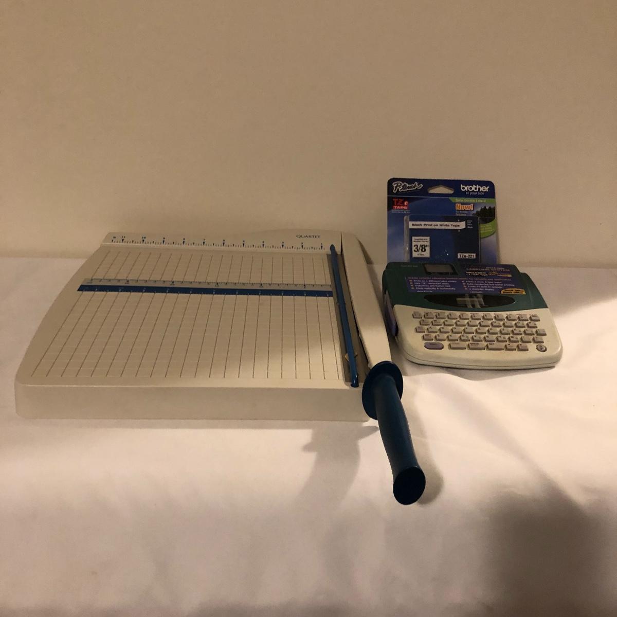 For the OCD in you label everything with this Brother P-Touch labeling system model # PT-1700 with one extra tape. Also includes guillotine style Quartet paper cutter. Labeling system was not tested as it has no batteries.