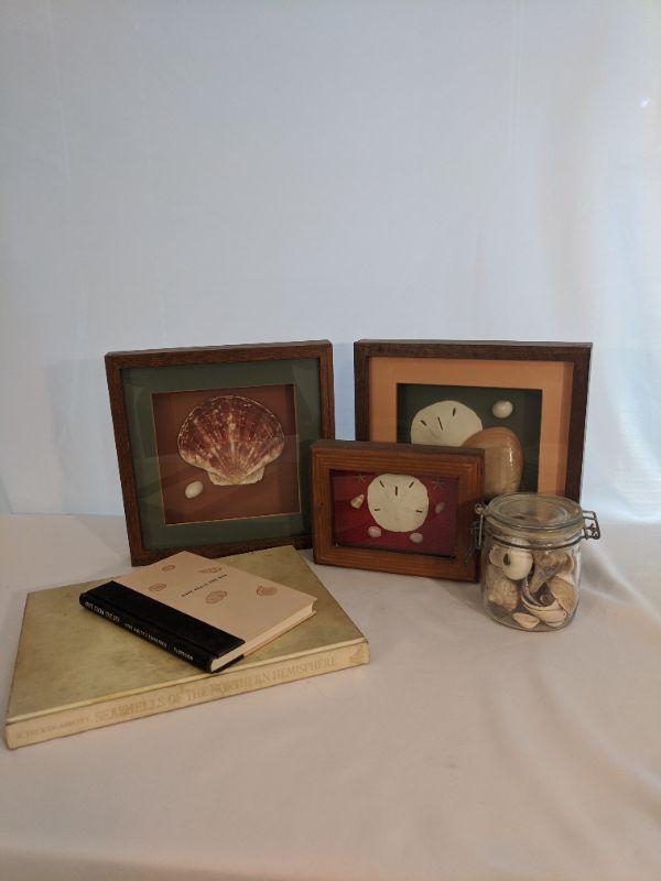 The book title for one of the two books here is titled Gift of the Sea and what a perfect title for this little lot of treasures that includes three shadow boxes with beautiful shells including a couple of sand dollars. A jar full of an assortment of shells and two books all about the ocean complete this lot.