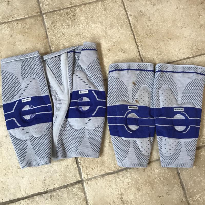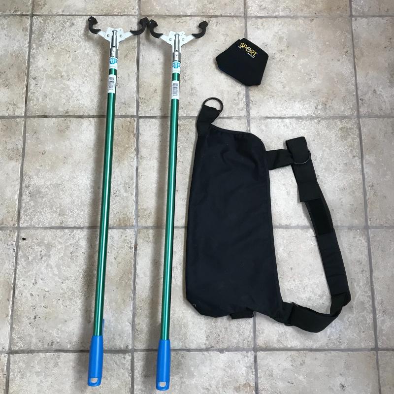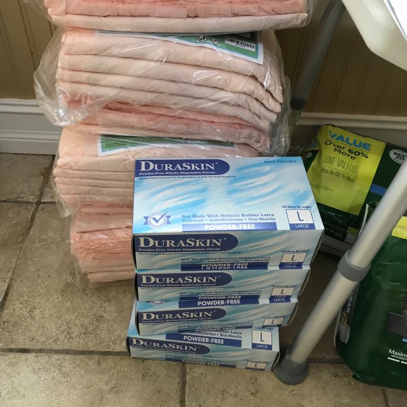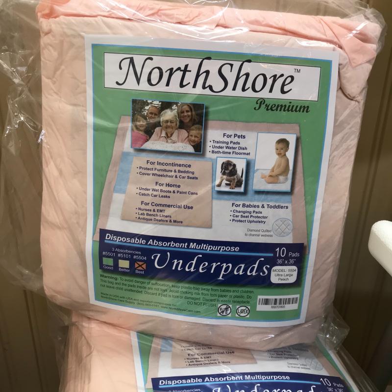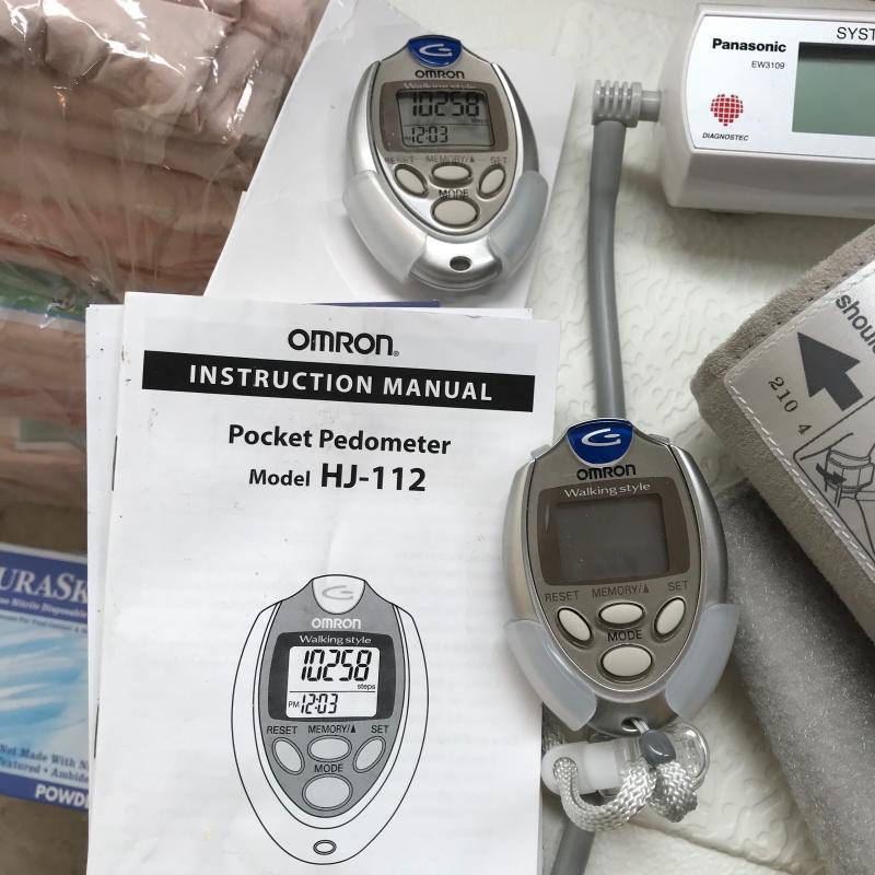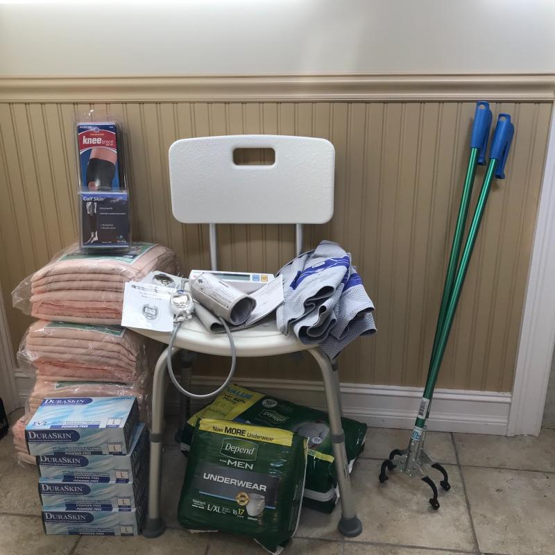 In home health accessories including a clean plastic shower seat, Panasonic blood pressure monitor, two Omron pedometers, one never used. Lot also includes four packs of ten each Northshore 36” x 36” premium underpads, twelve packs of ten each Supreme Northshore 23” x 36” pads, four boxes of 100 each DuraSkin nitrile disposable gloves. Also included are various braces, Depends and two Nifty Nabbers by Unger. See photos for entire lot inventory. No shipping.