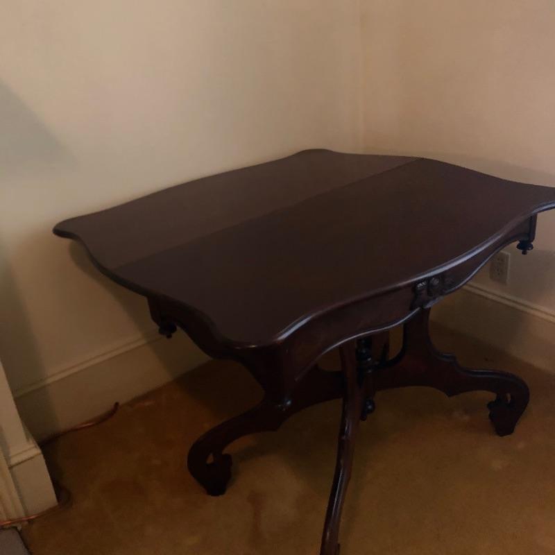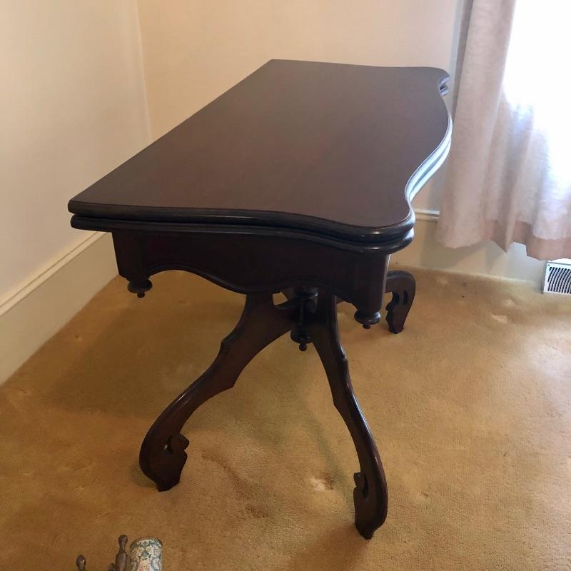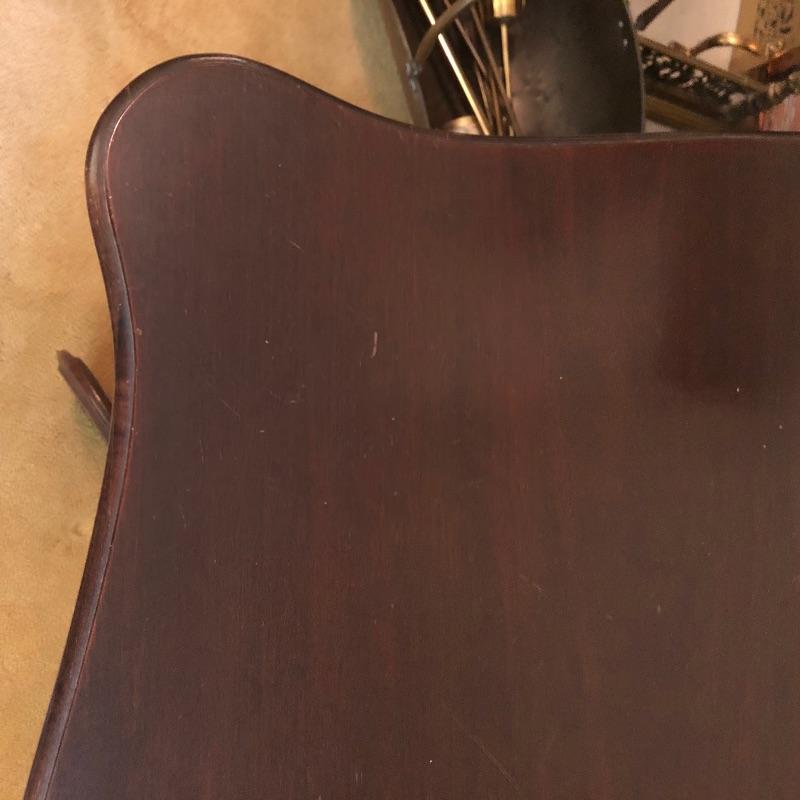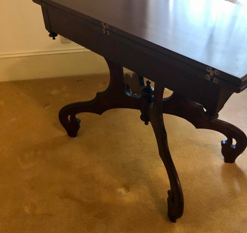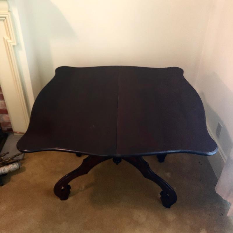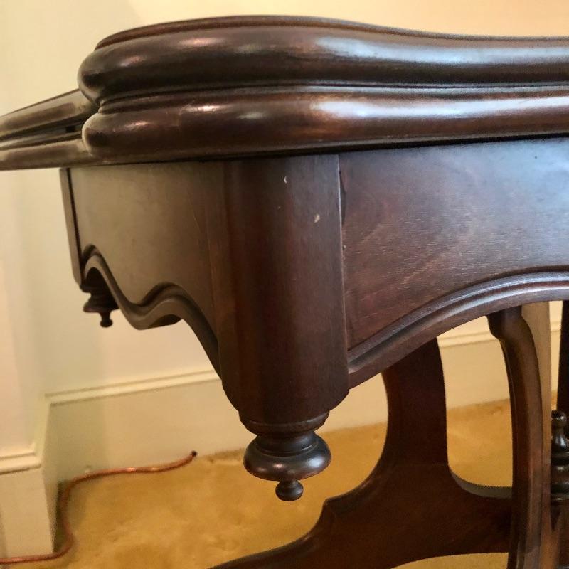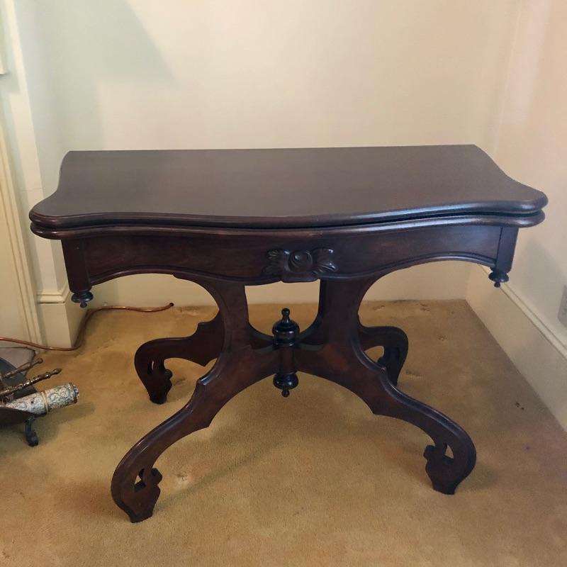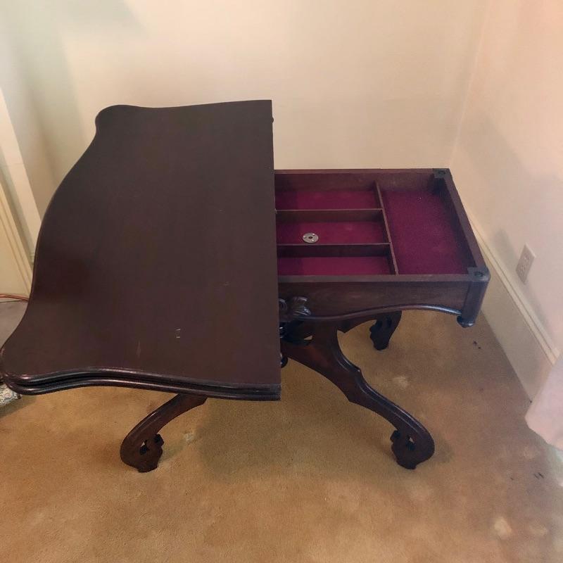 This stunning solid card table is mahogany or mahogany like. Everything about this piece screams quality craftsmanship with the most attractive of details that include the curved and scallop like carved legs and sweet details in the flower and leaf design on the front and finial style embellishments. Highly versatile this table folds effortlessly in half by way of quality brass hinges. When fully open it becomes the classiest of card tables that contains compartments under the leaves on the right half, to store your game pieces. The top of this piece is a veneer and it has come loose on the corner as shown in the last image; this would be a quick fix with some glue. There are some minor scratches, mostly on the surface that are shown in images.