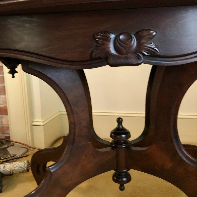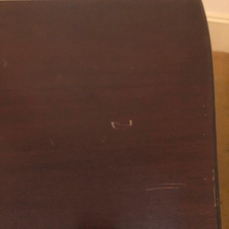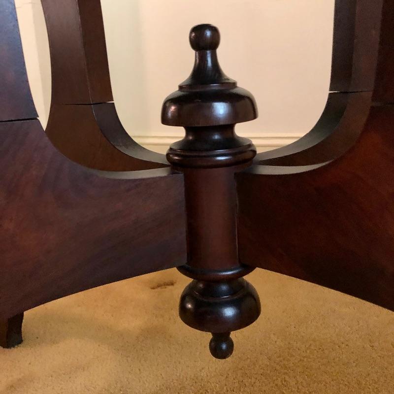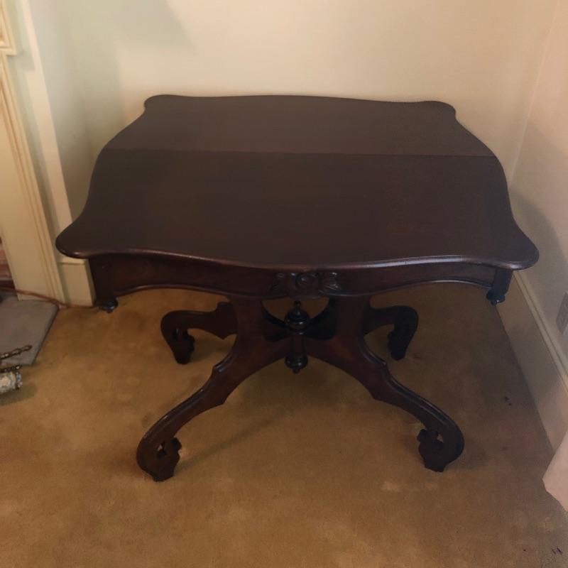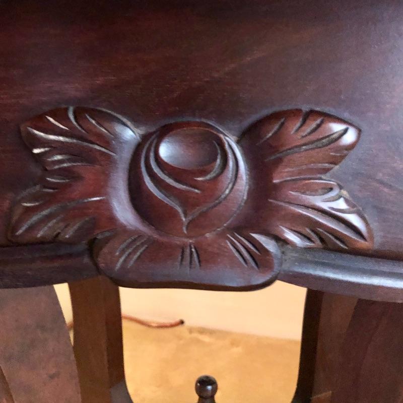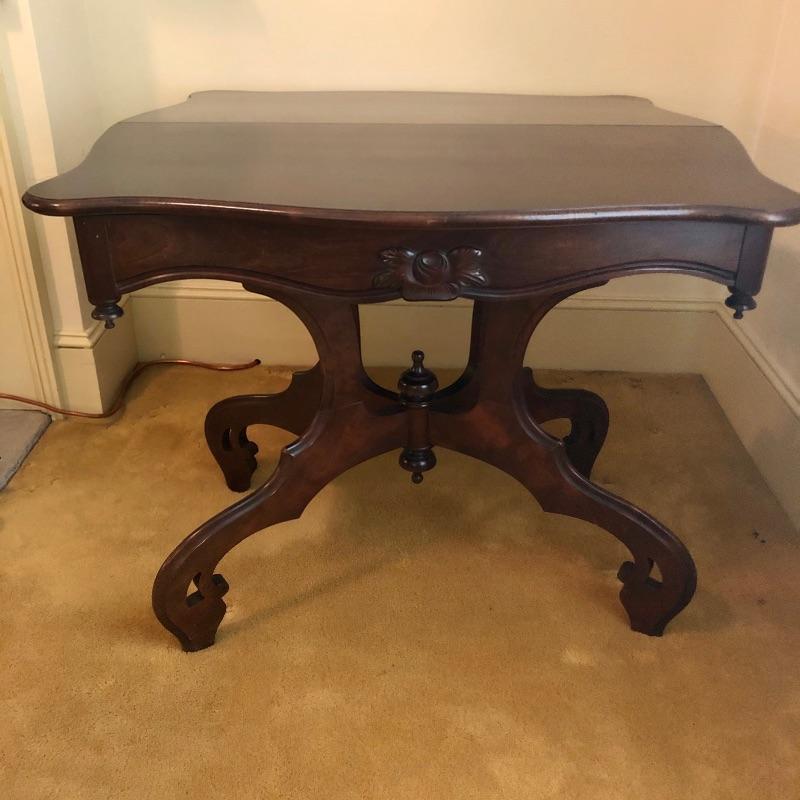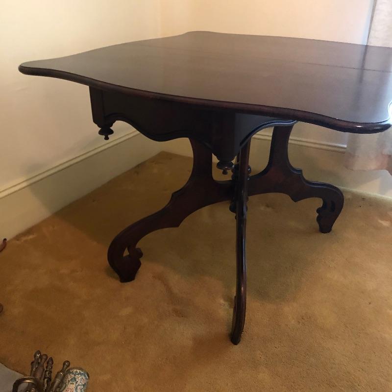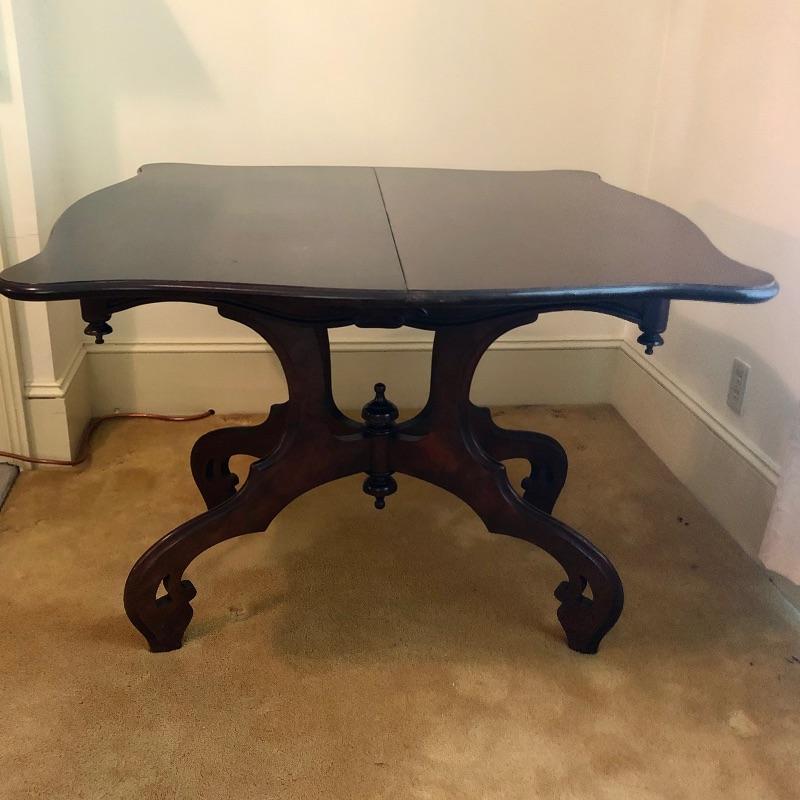 This stunning solid card table is mahogany or mahogany like. Everything about this piece screams quality craftsmanship with the most attractive of details that include the curved and scallop like carved legs and sweet details in the flower and leaf design on the front and finial style embellishments. Highly versatile this table folds effortlessly in half by way of quality brass hinges. When fully open it becomes the classiest of card tables that contains compartments under the leaves on the right half, to store your game pieces. The top of this piece is a veneer and it has come loose on the corner as shown in the last image; this would be a quick fix with some glue. There are some minor scratches, mostly on the surface that are shown in images.