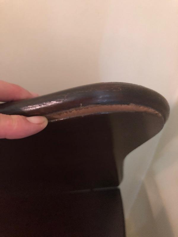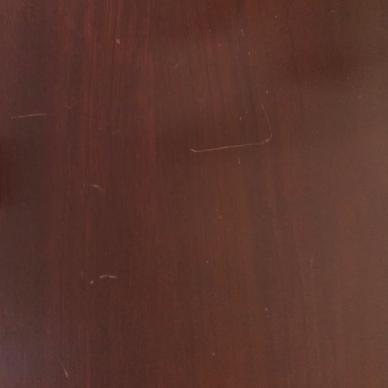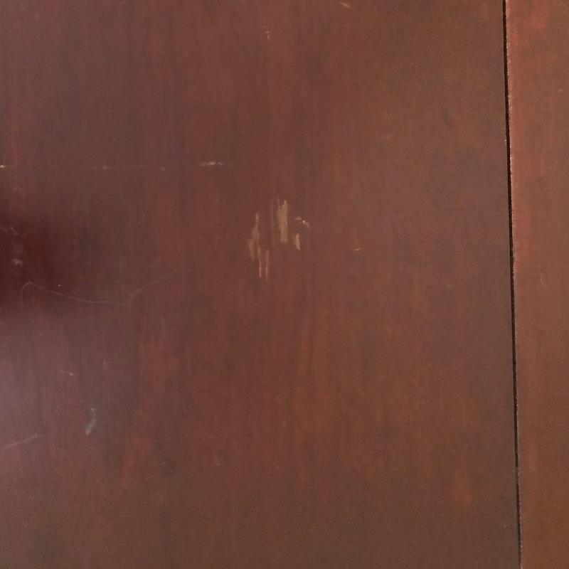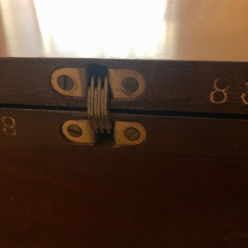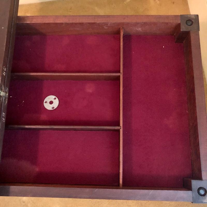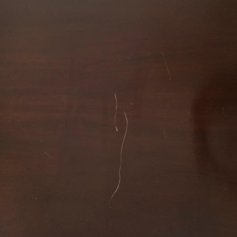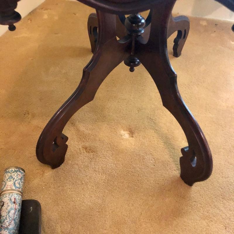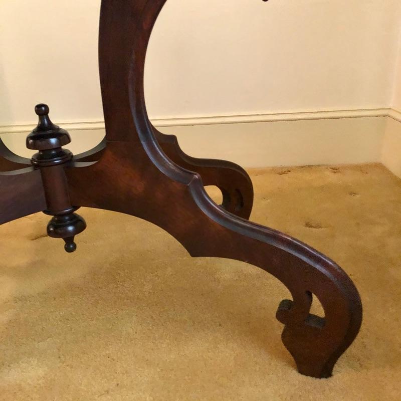 This stunning solid card table is mahogany or mahogany like. Everything about this piece screams quality craftsmanship with the most attractive of details that include the curved and scallop like carved legs and sweet details in the flower and leaf design on the front and finial style embellishments. Highly versatile this table folds effortlessly in half by way of quality brass hinges. When fully open it becomes the classiest of card tables that contains compartments under the leaves on the right half, to store your game pieces. The top of this piece is a veneer and it has come loose on the corner as shown in the last image; this would be a quick fix with some glue. There are some minor scratches, mostly on the surface that are shown in images.