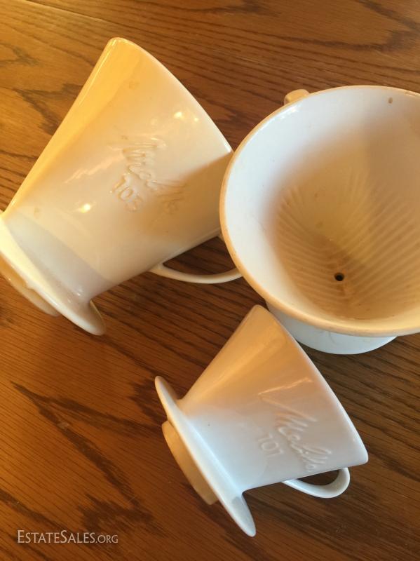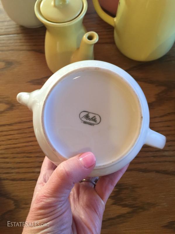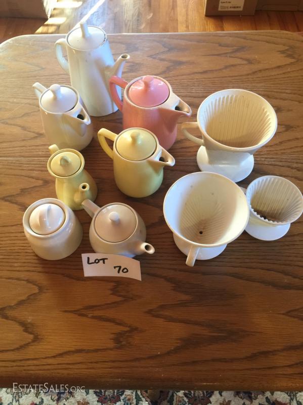 Ten Assorted tea and coffee pots and cream and sugar service pieces. Melitta individual brewers