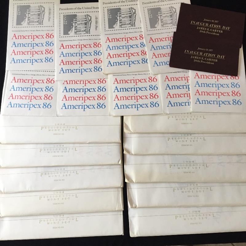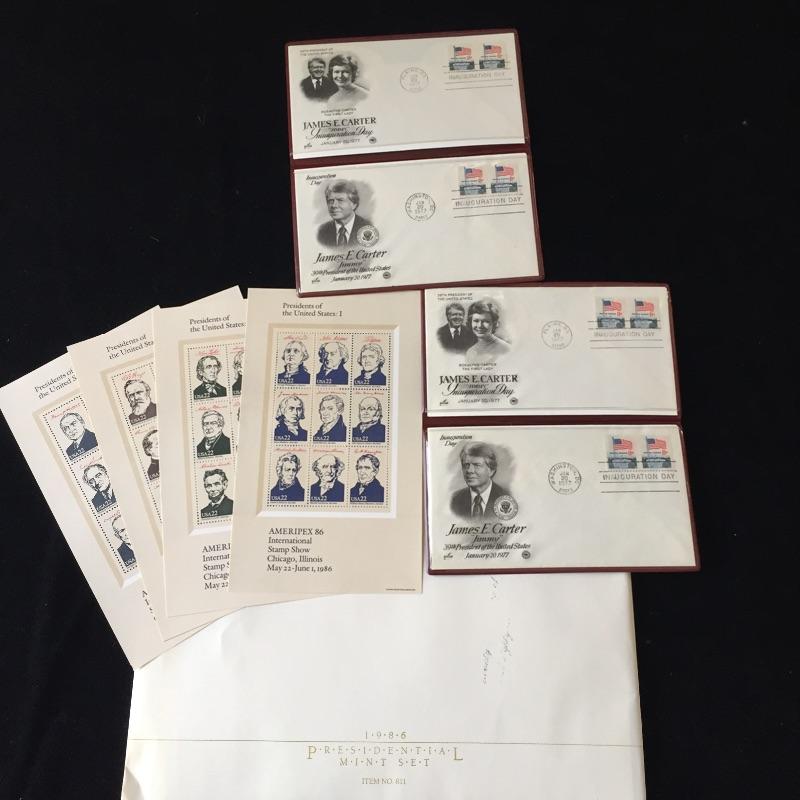 Ten Presidential mint sets, nine envelopes of the Presidential stamps and four Jimmy Carter Inauguration Day stamped cards. Item no. 811 in great shape and never hinged.