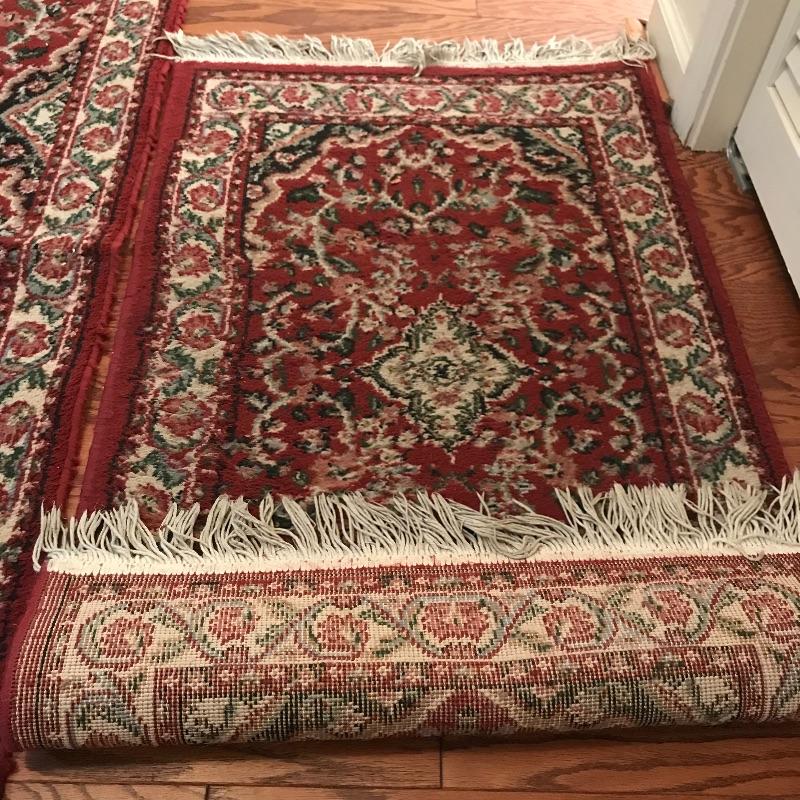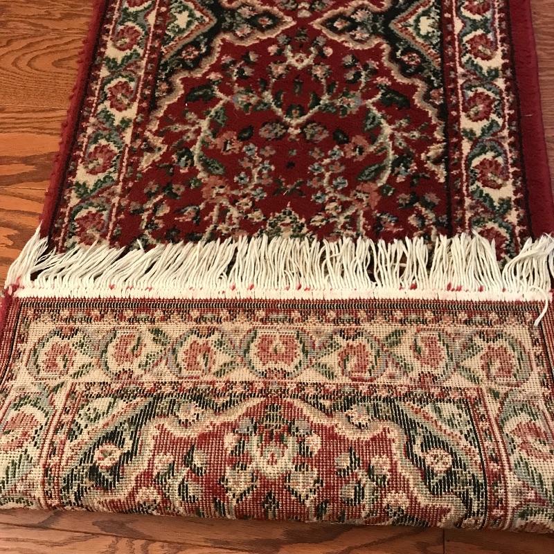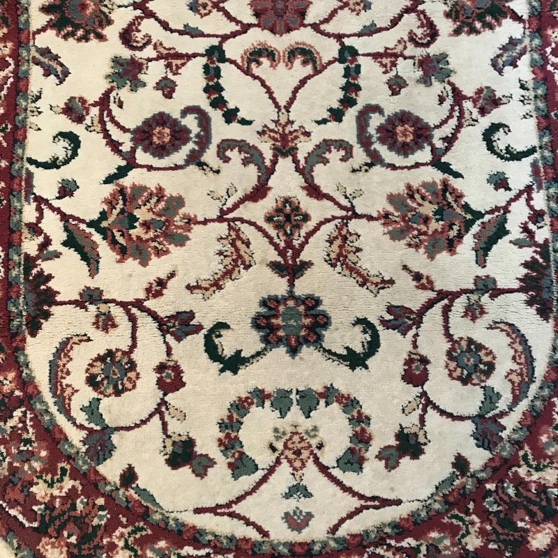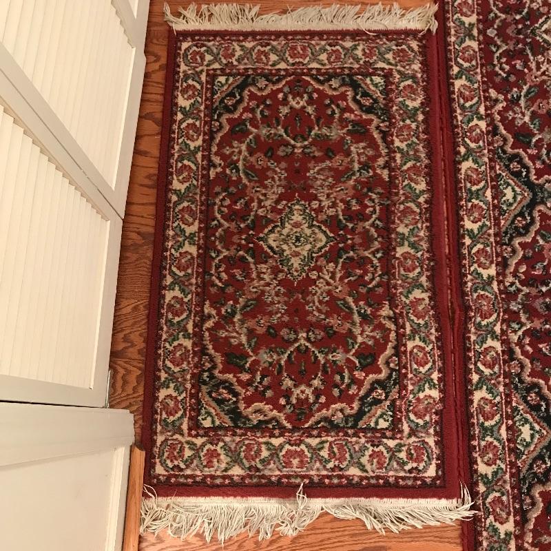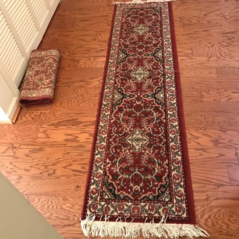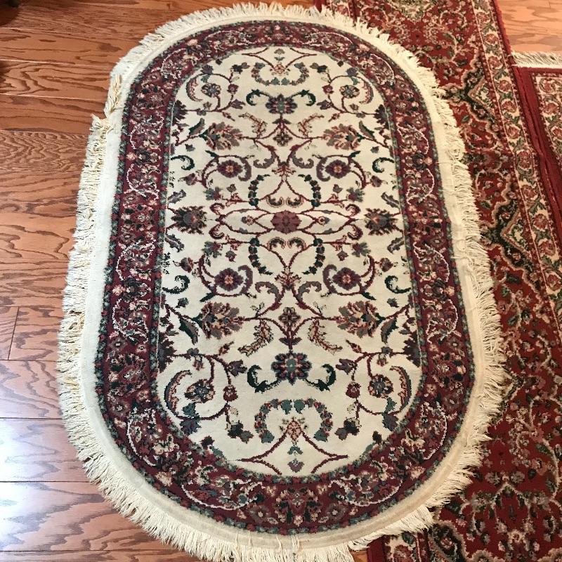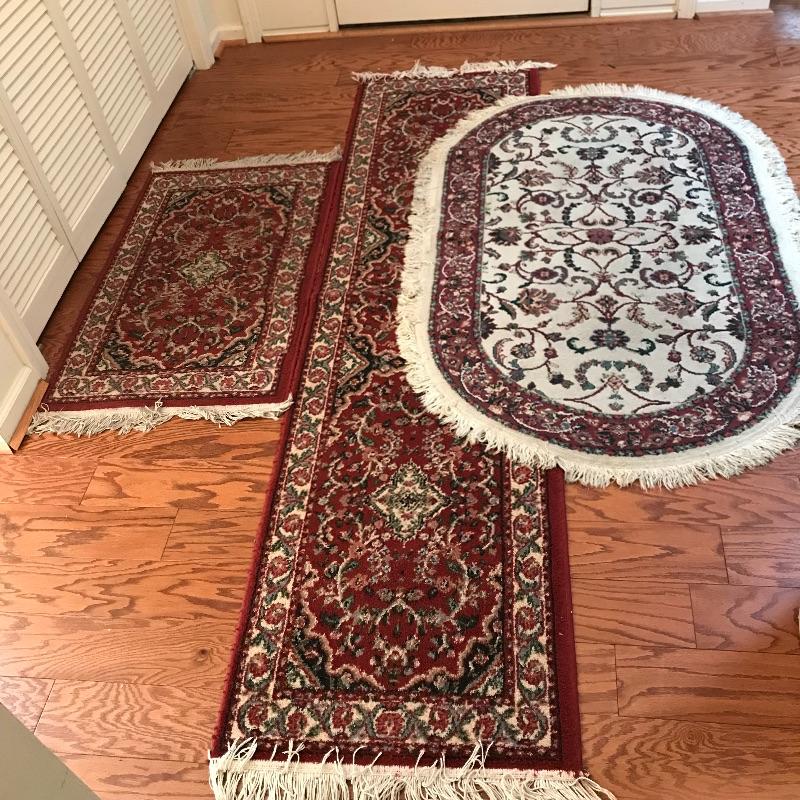 Three rugs here to add some color and pop to any room. The red accent rug comes with a matching runner both with rich, bold colors. The smaller rug is approximately 40” x 23.5” while the larger runner rug is about 91” x 24”. Lot also includes an oblong mauve and ivory small area rug measuring approximately 59” x 36”. Rugs appear in good shape, but need some cleaning. The fringe appears darker than it should be, but should be able to come clean. Local Pickup Only.