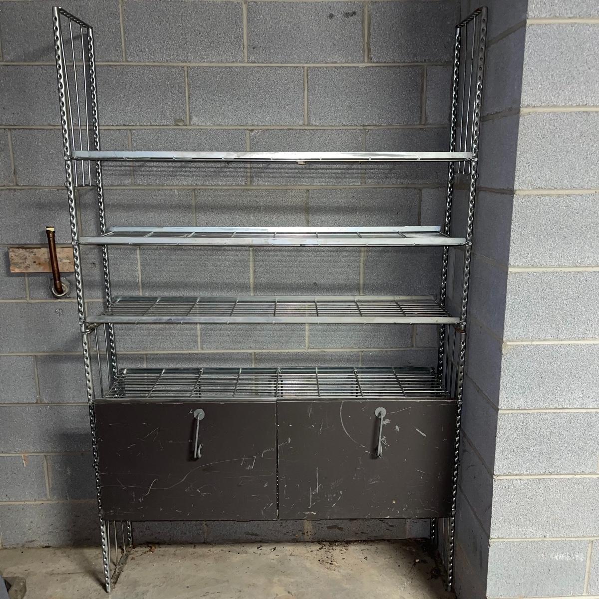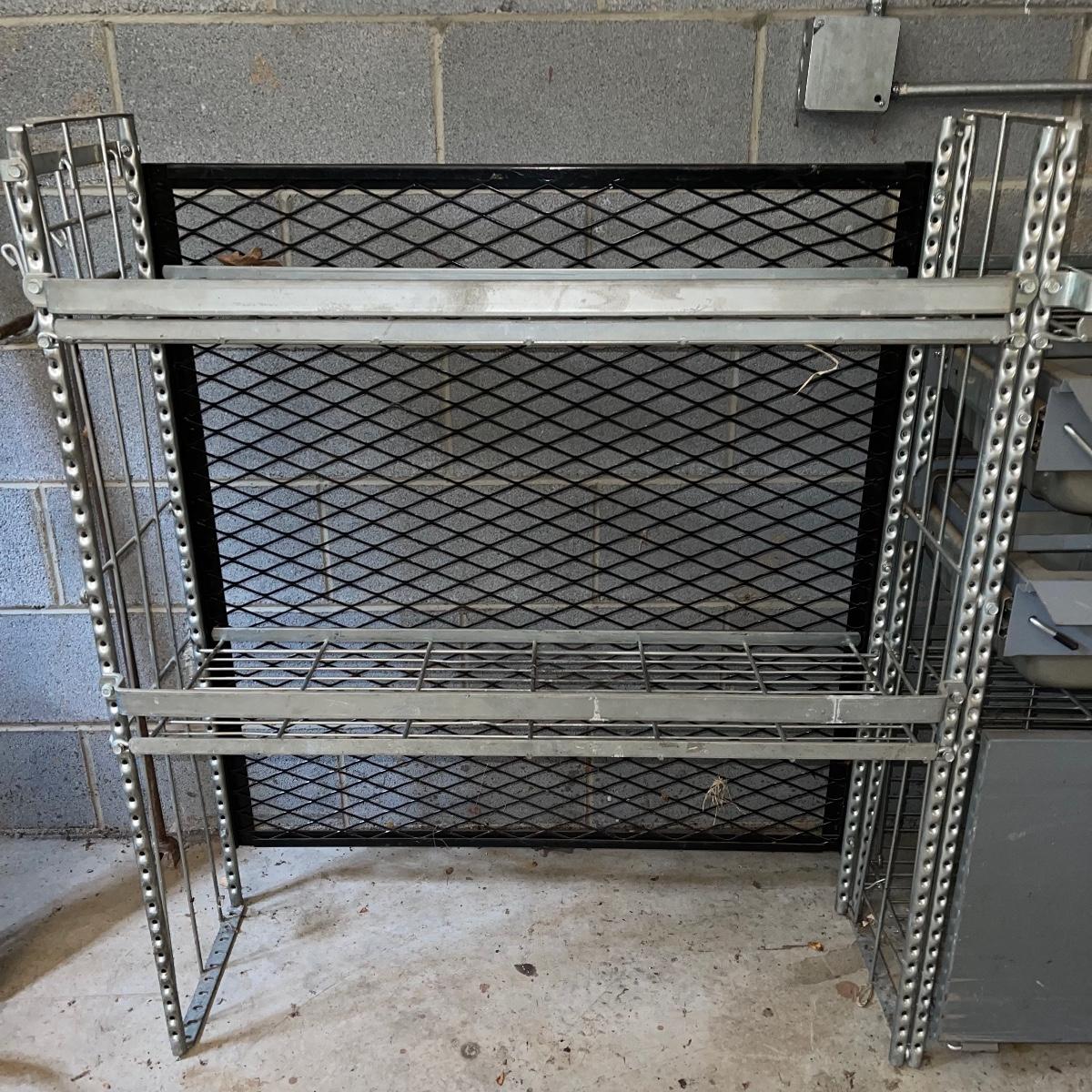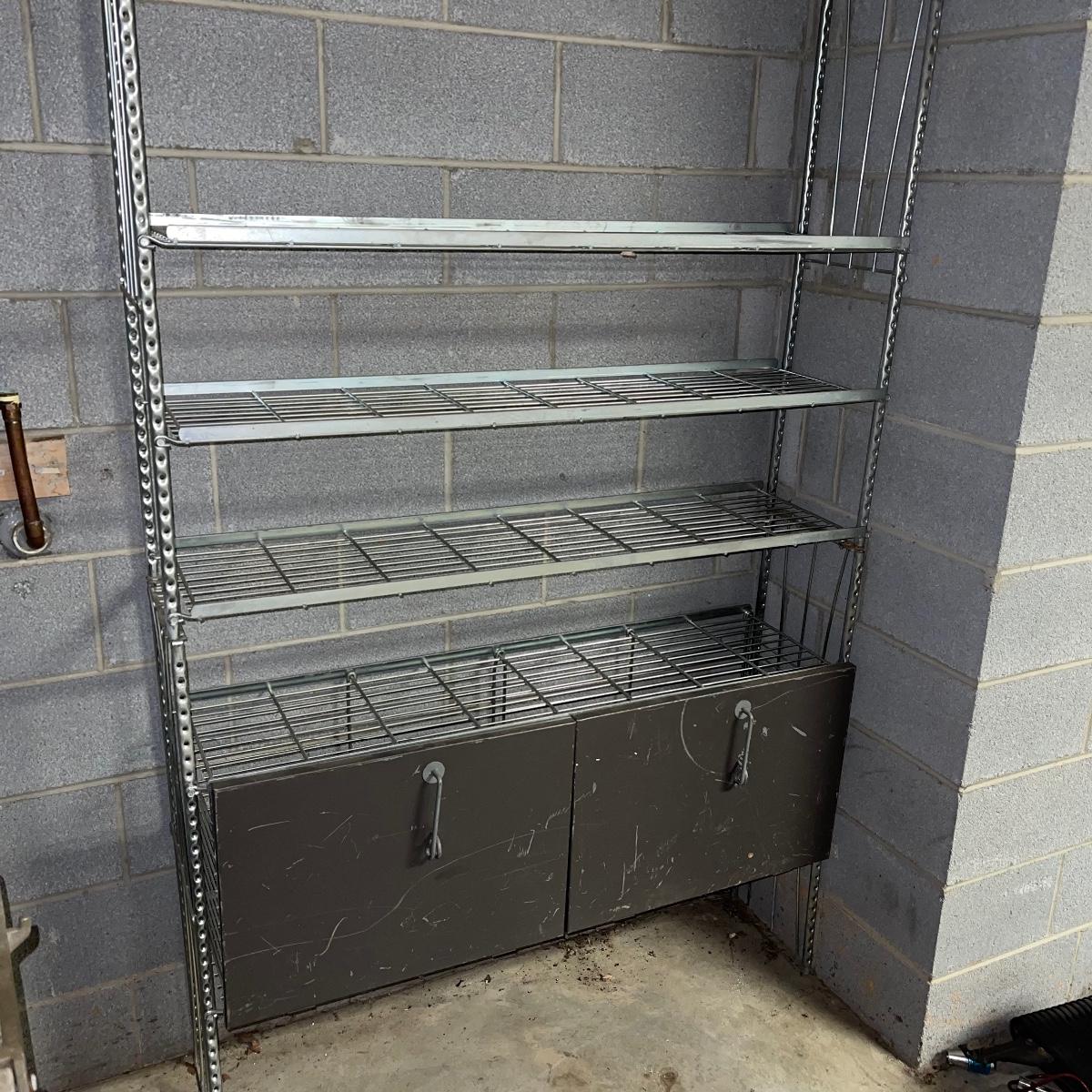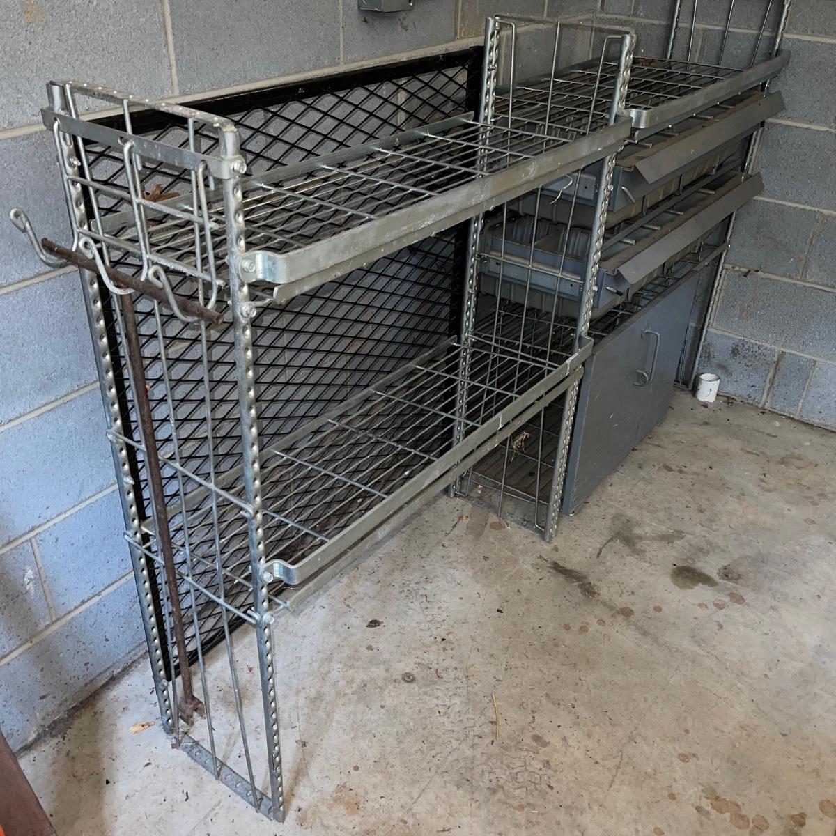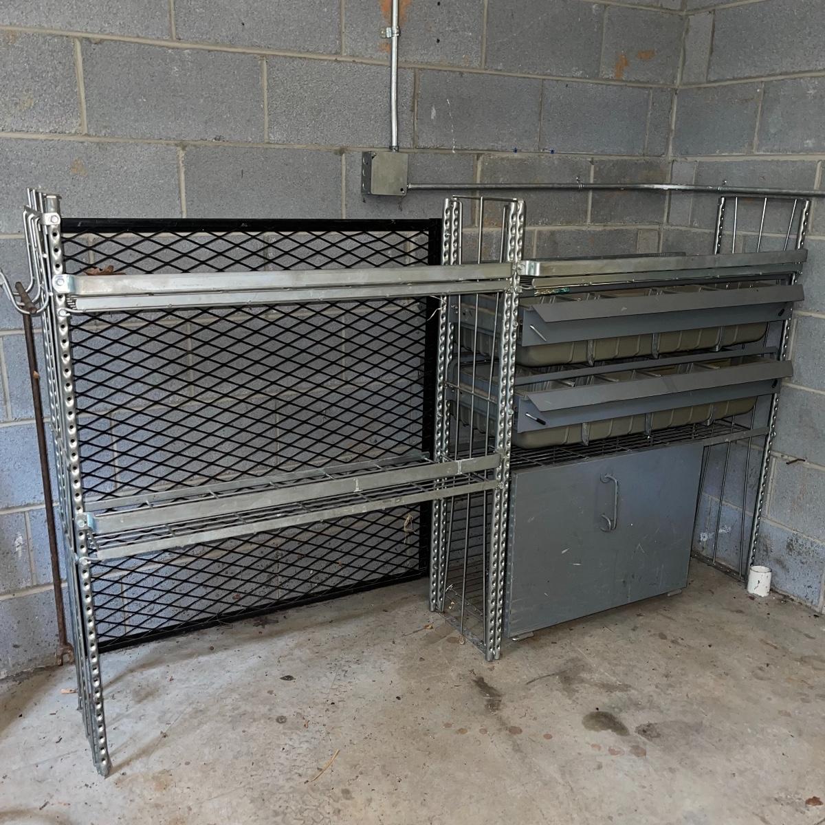 Looking for more storage shelves? Look no further. These metal shelving units include a 49” wide x 12.5” deep x 75.5” tall five shelf unit with two metal cabinet doors. The next units are 37” wide x 44.5” tall, the unit with drawers is 21” deep due to the drawers and the other is 13.5” deep. These two shelves are connected and they appear to be welded together. One of the two has two large plastic drawers with various compartments and a metal cabinet door, the other just has two metal shelves. All three shelving units are slightly worn from use as garage storage but with a good dusting can be cleaned up nicely.