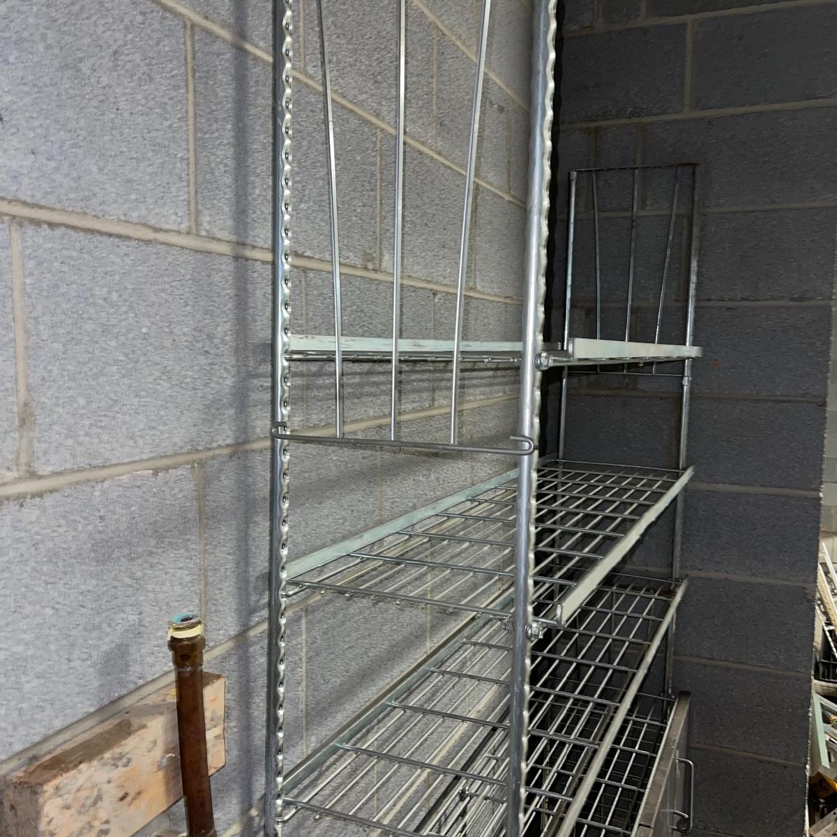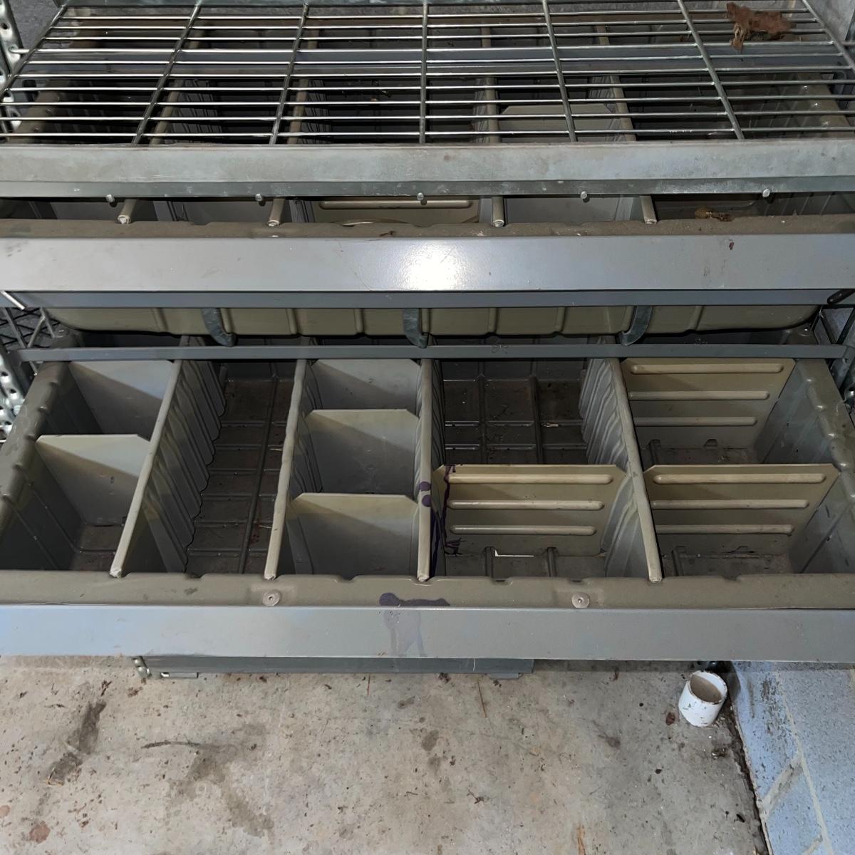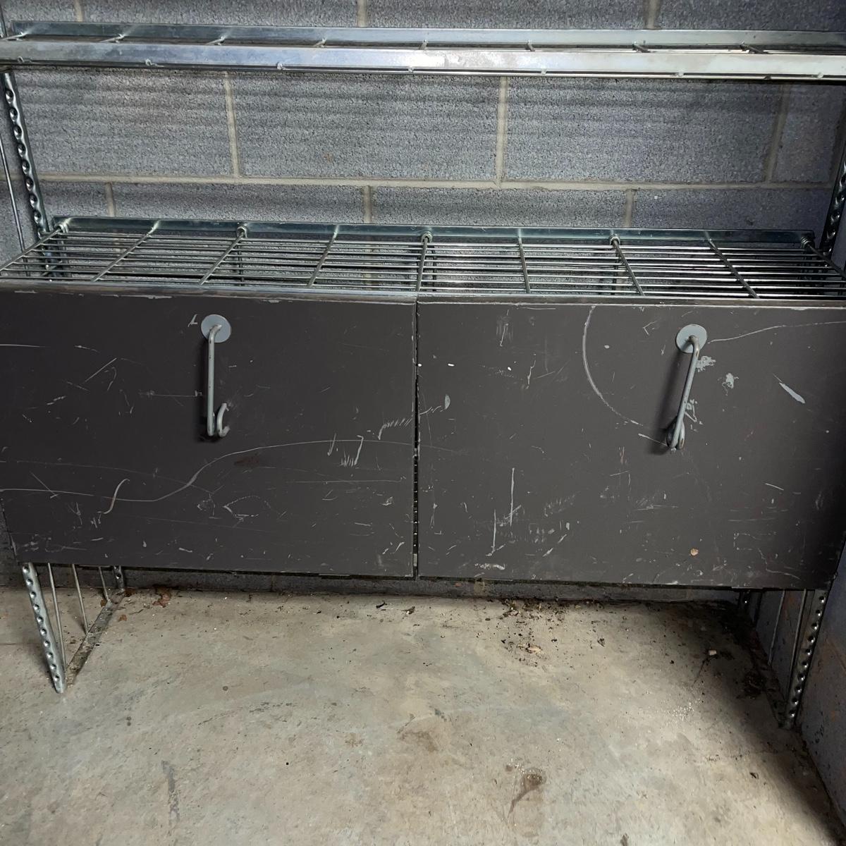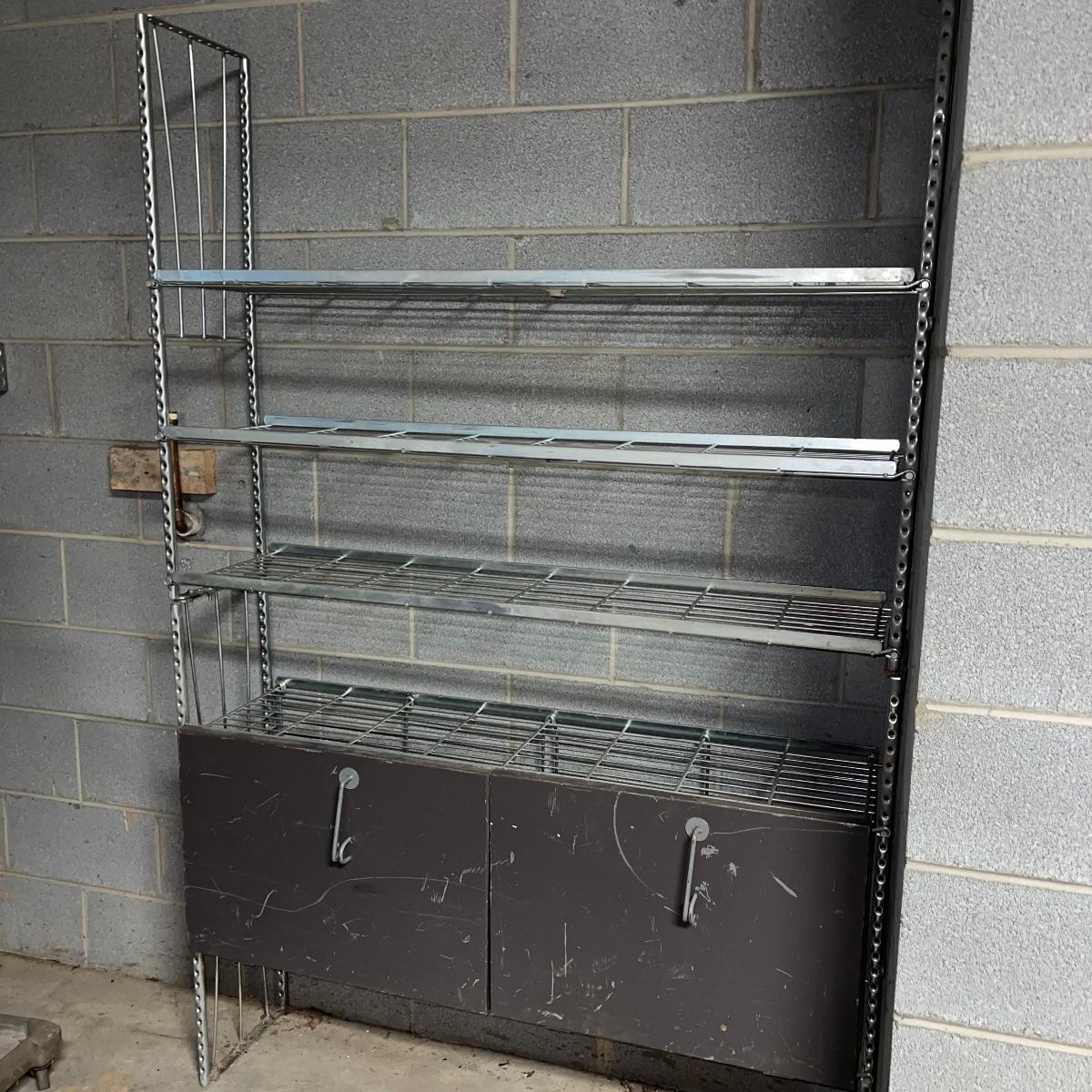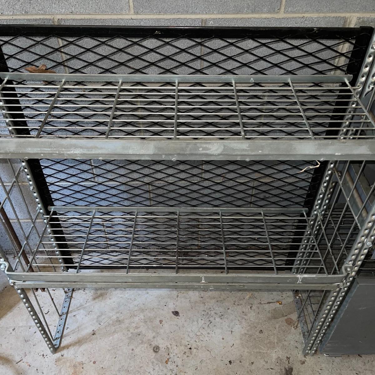 Looking for more storage shelves? Look no further. These metal shelving units include a 49” wide x 12.5” deep x 75.5” tall five shelf unit with two metal cabinet doors. The next units are 37” wide x 44.5” tall, the unit with drawers is 21” deep due to the drawers and the other is 13.5” deep. These two shelves are connected and they appear to be welded together. One of the two has two large plastic drawers with various compartments and a metal cabinet door, the other just has two metal shelves. All three shelving units are slightly worn from use as garage storage but with a good dusting can be cleaned up nicely.