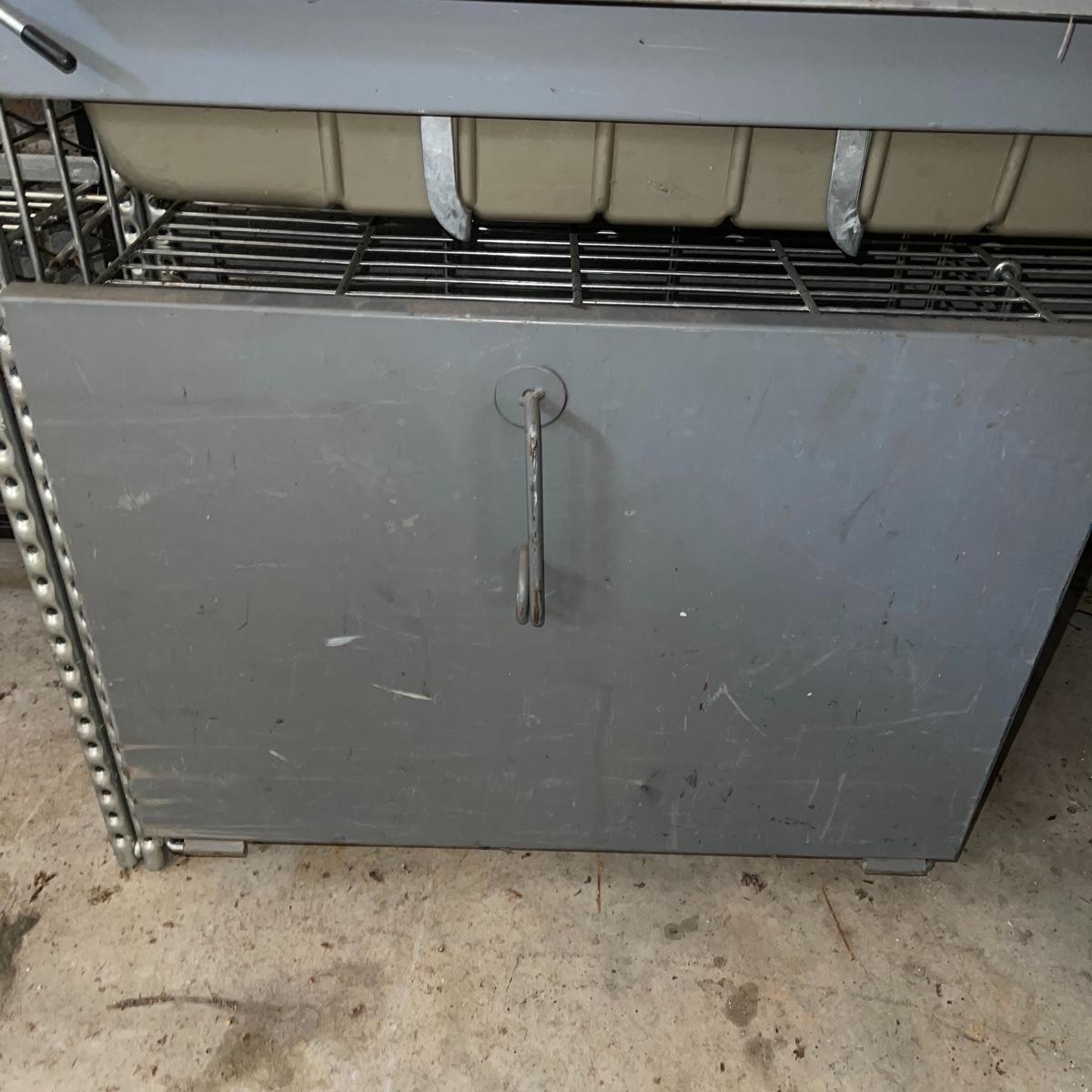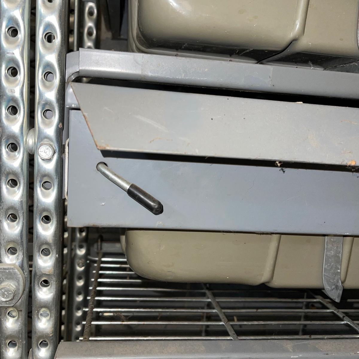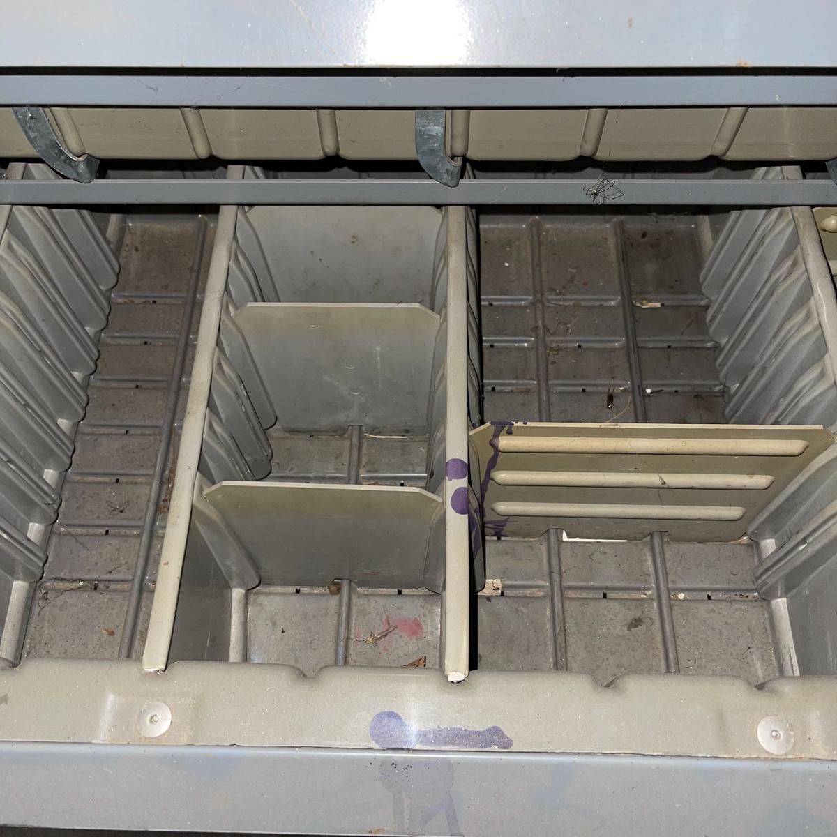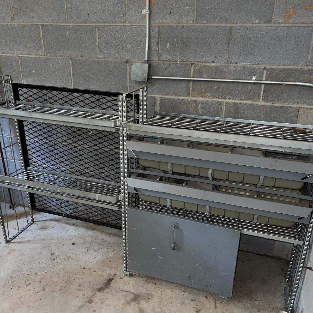 Looking for more storage shelves? Look no further. These metal shelving units include a 49” wide x 12.5” deep x 75.5” tall five shelf unit with two metal cabinet doors. The next units are 37” wide x 44.5” tall, the unit with drawers is 21” deep due to the drawers and the other is 13.5” deep. These two shelves are connected and they appear to be welded together. One of the two has two large plastic drawers with various compartments and a metal cabinet door, the other just has two metal shelves. All three shelving units are slightly worn from use as garage storage but with a good dusting can be cleaned up nicely.