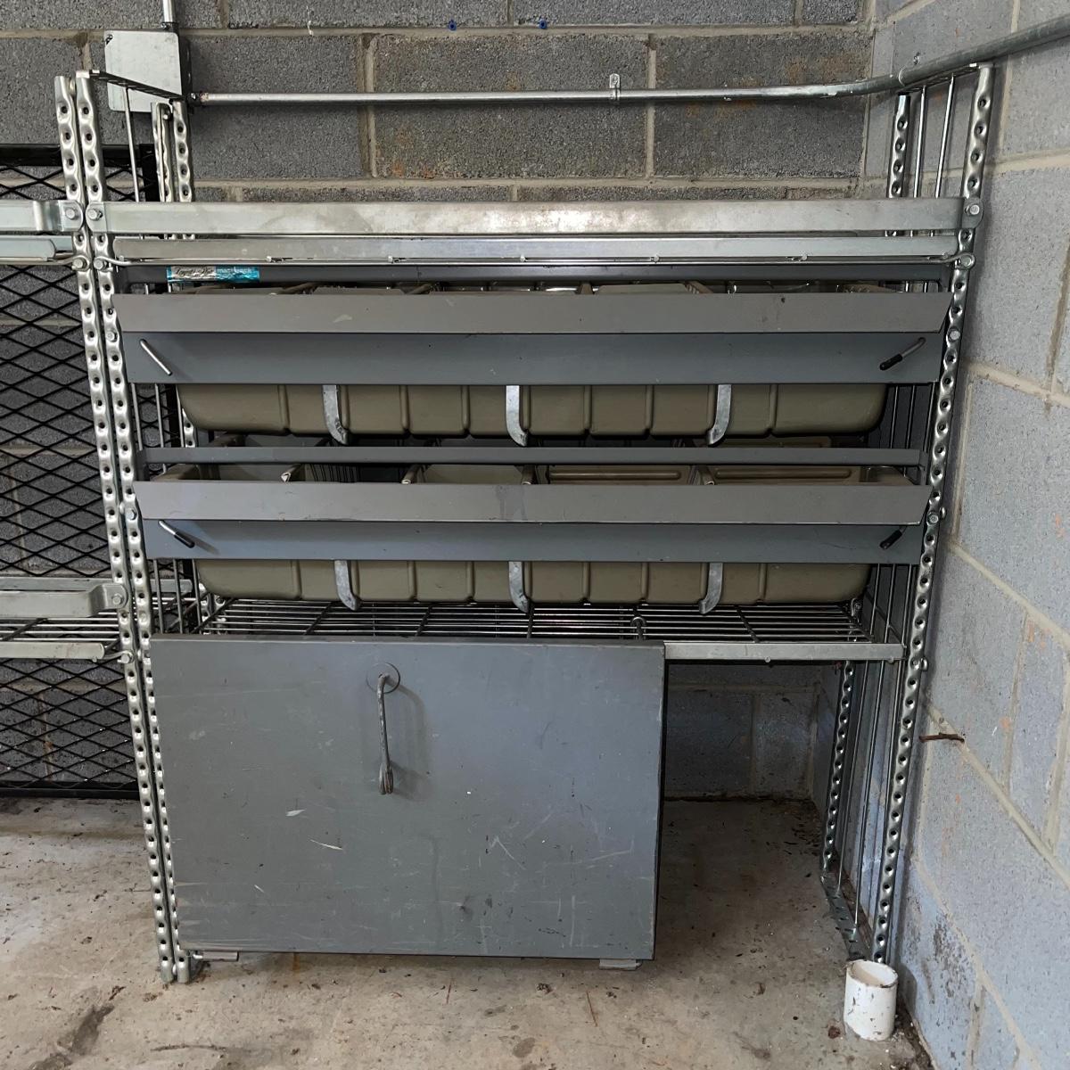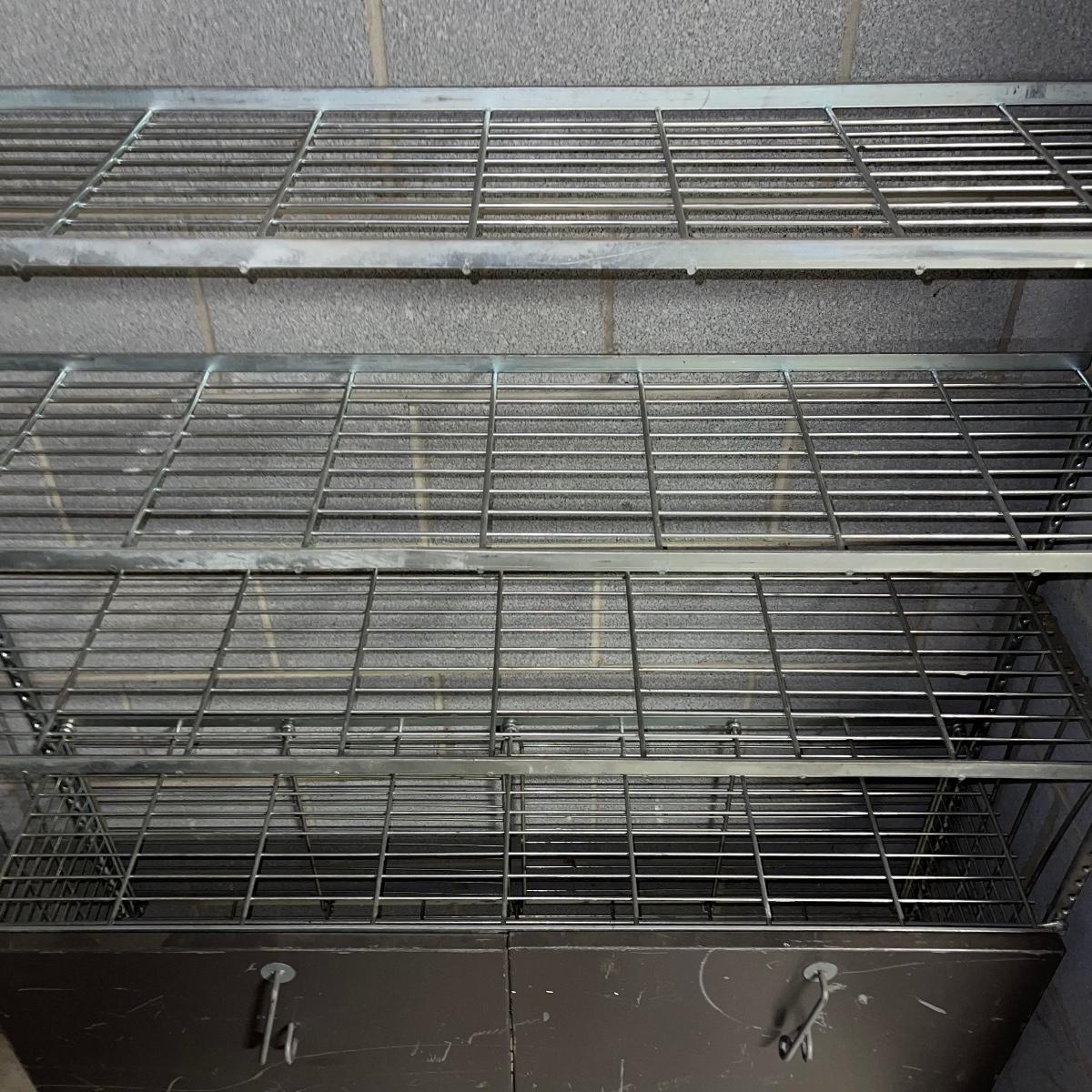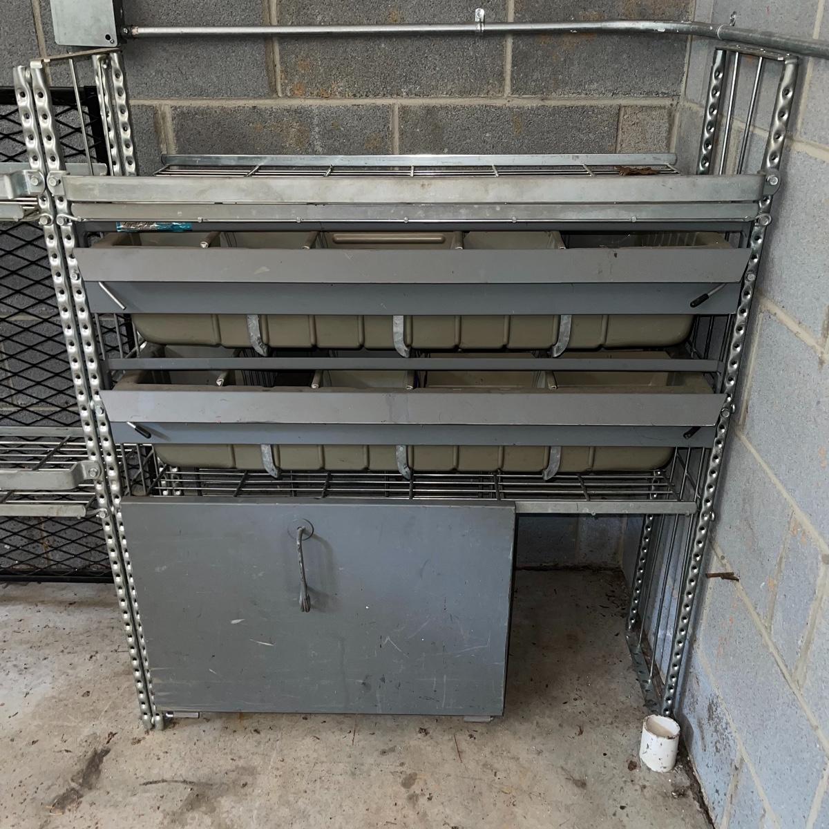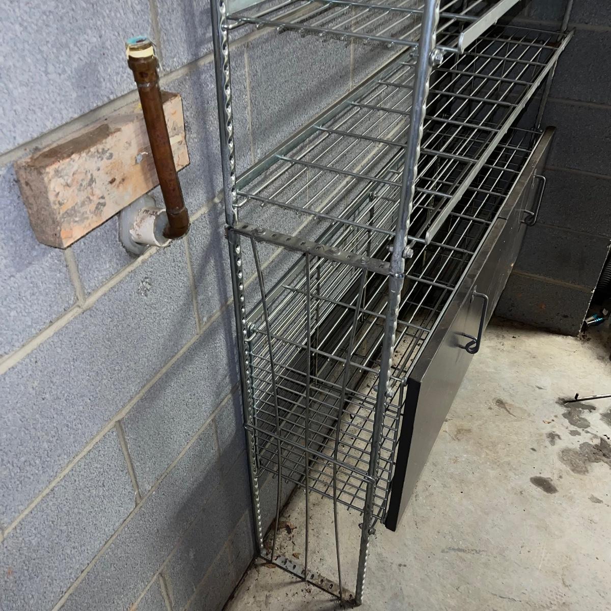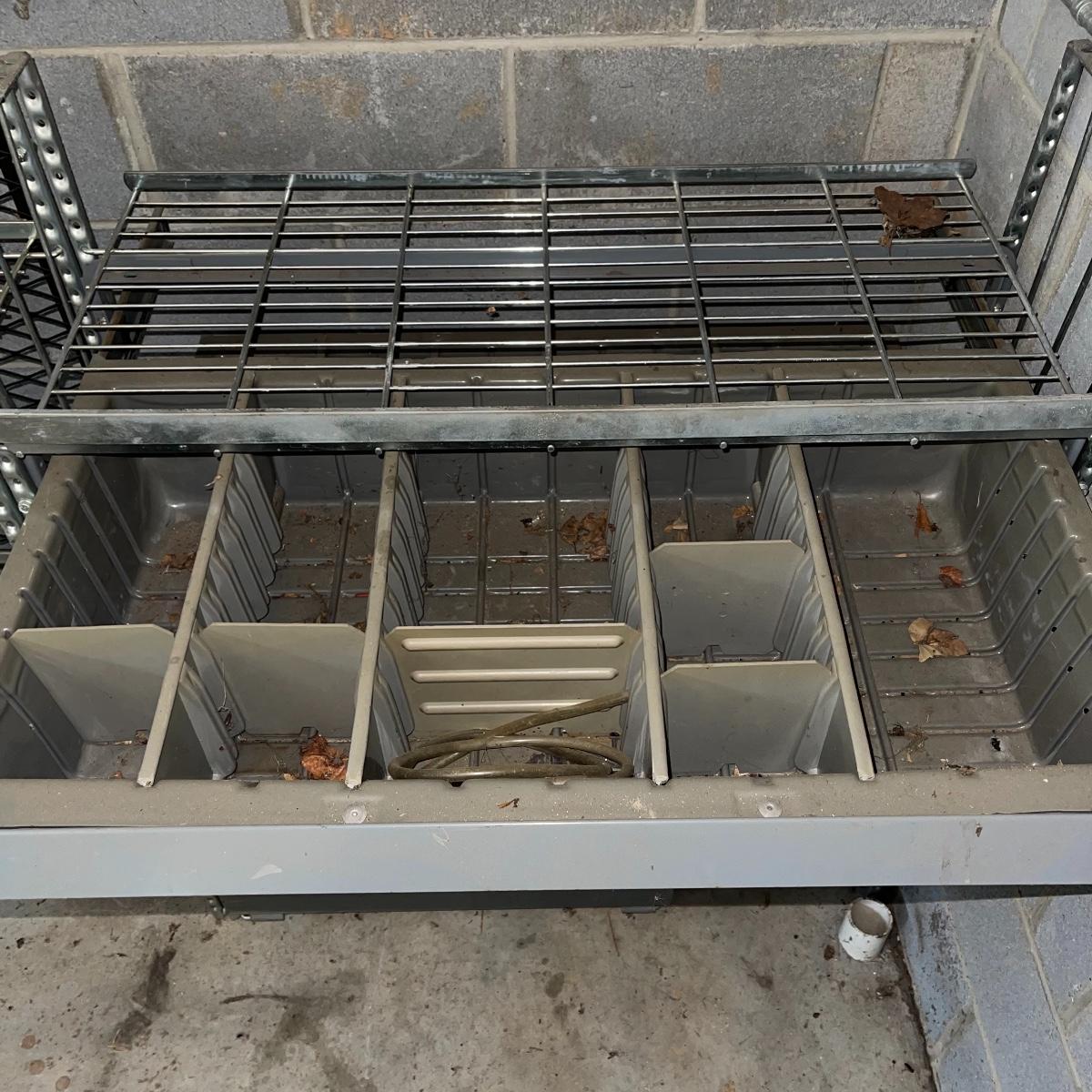 Looking for more storage shelves? Look no further. These metal shelving units include a 49” wide x 12.5” deep x 75.5” tall five shelf unit with two metal cabinet doors. The next units are 37” wide x 44.5” tall, the unit with drawers is 21” deep due to the drawers and the other is 13.5” deep. These two shelves are connected and they appear to be welded together. One of the two has two large plastic drawers with various compartments and a metal cabinet door, the other just has two metal shelves. All three shelving units are slightly worn from use as garage storage but with a good dusting can be cleaned up nicely.