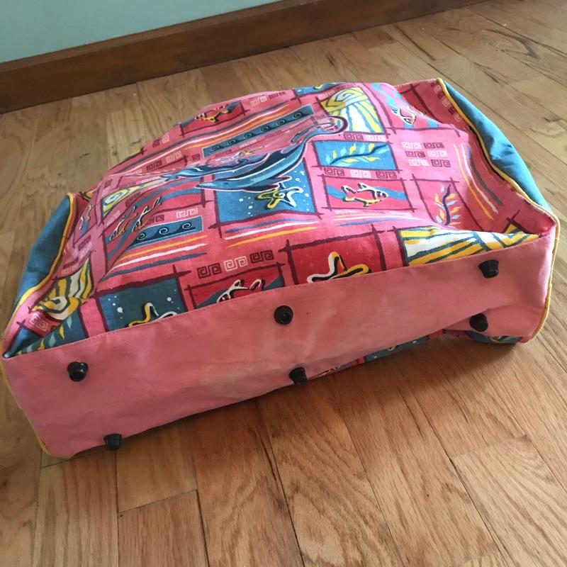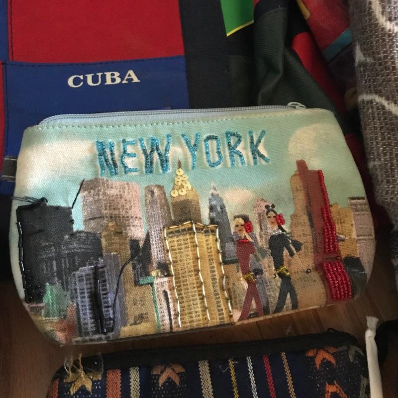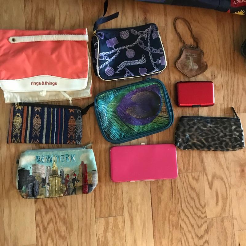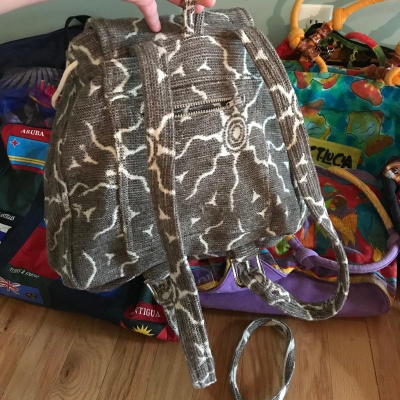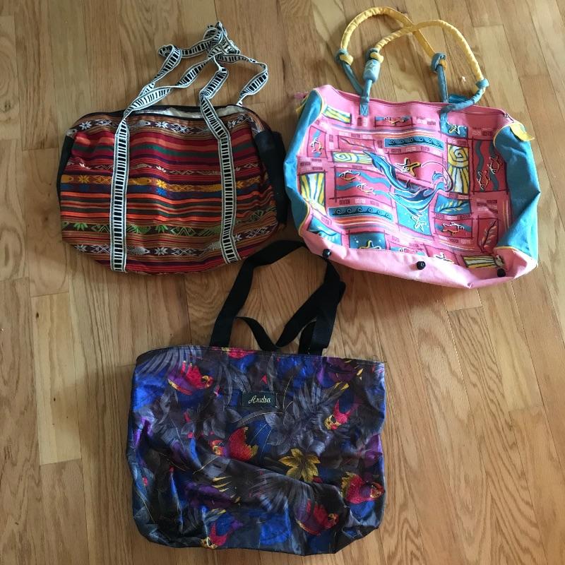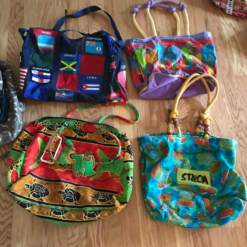 Neat collection of totes and bags from across the globe. Lot includes sizes from a hard plastic red card carrier to 42” wide navy tote with Velcro closure. Lot also features a small Dooney & Burke clutch and smaller bags for keeping organized during your adventures. The pink dolphin Crazy Bags tote has a plastic coated inner lining, perfect for a pool or beach bag. See photos. Local pick up only.