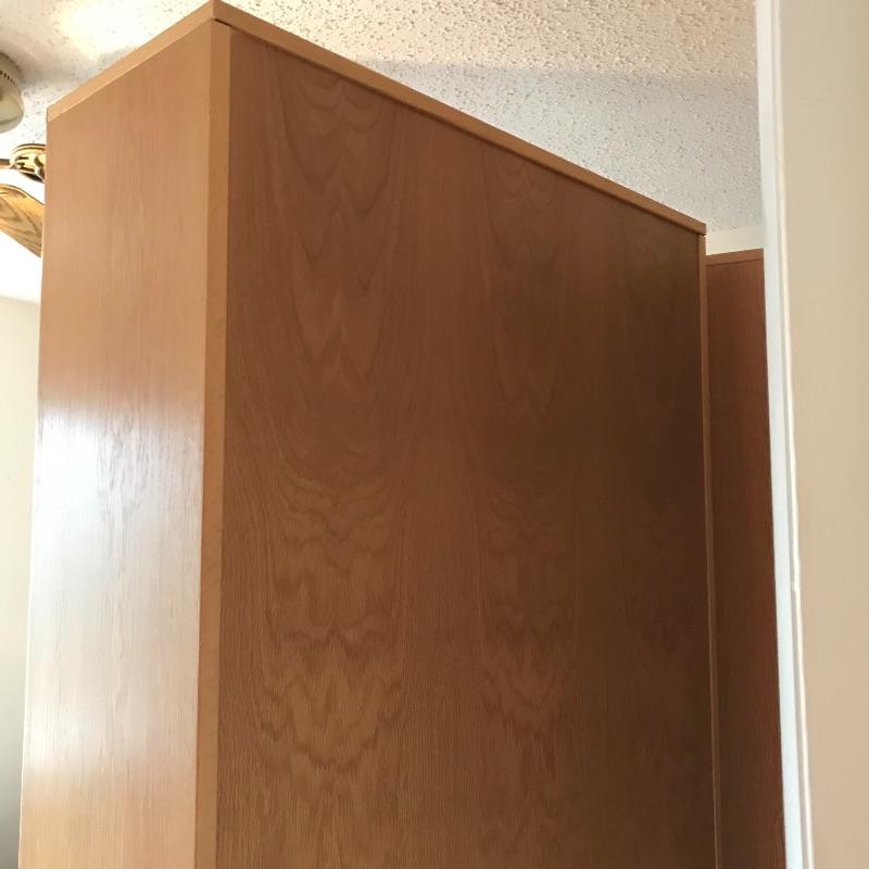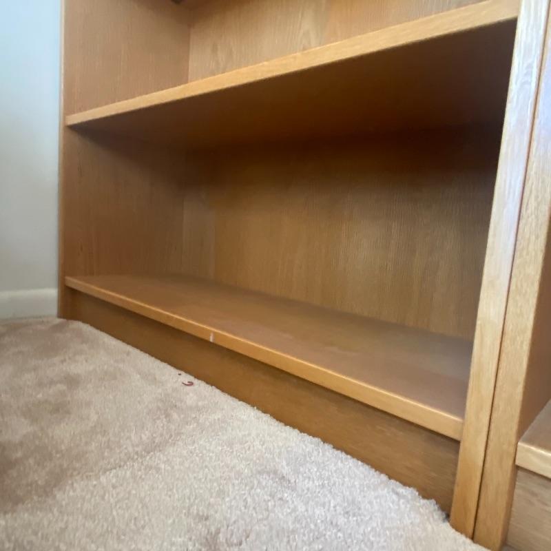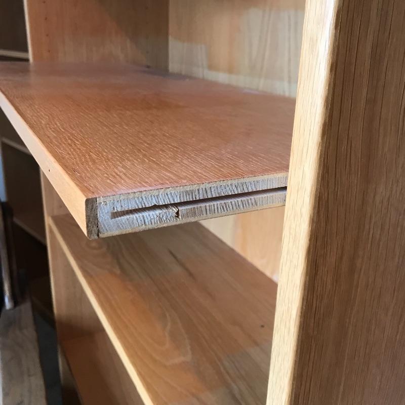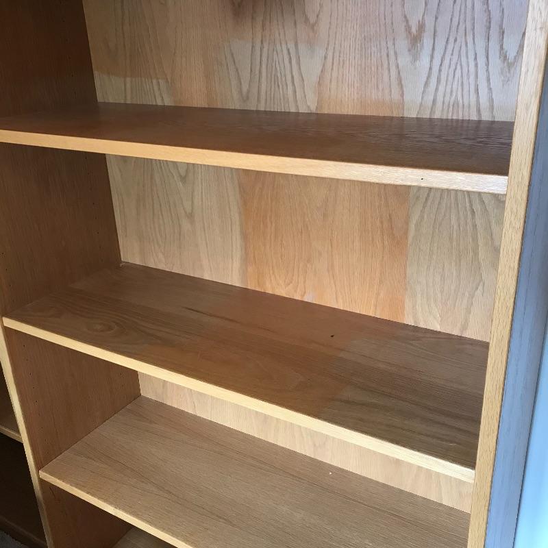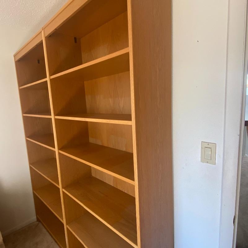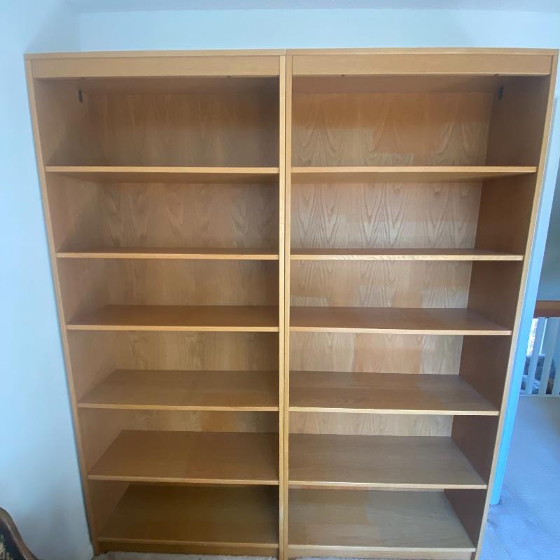 Brighten up your office space with these sturdy, light colored pressed wood bookcases. Two permanent shelves and two adjustable, per unit. Good condition with some spots of sun bleaching. Some shelves on both units are screwed into place with brackets. The other shelves are uniquely placed with wire racks. 35.5x13x83 Local pickup only. Please bring help to load, both are heavy and require transport downstairs.
