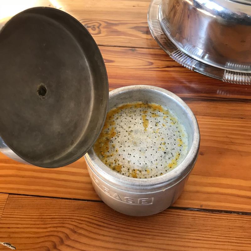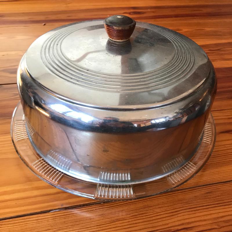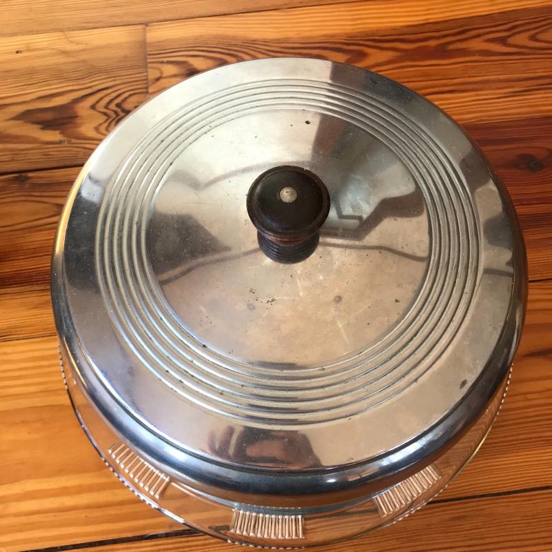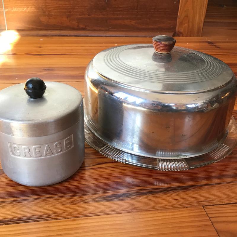 Covered vintage cake stand with floral glass plate is in great shape. Aluminum grease can is in good shape and contains grease. Shipping available or local pickup in Asheville, NC.