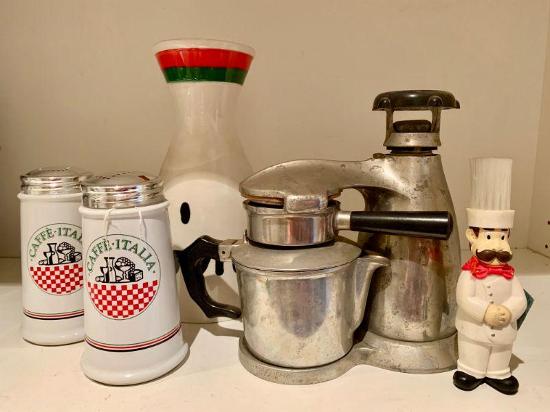Vintage expresso maker, made in Italy. Other Italian theme kitchen items, carafe, salt & pepper, and chef pasty brush