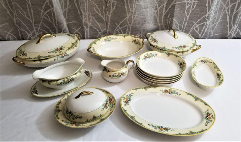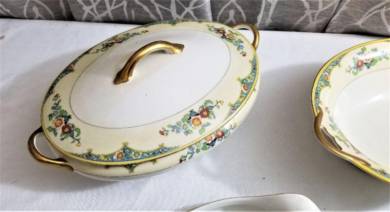 Nice grouping of vintage Japan serving pieces, etc. You get everything you see here: 2 covered bowls, 1 Sauce boat, covered butter dish, creamer, serving dish, oval platter, 5 soup bowls, small curved dish. Good condition. 13 pieces in all.