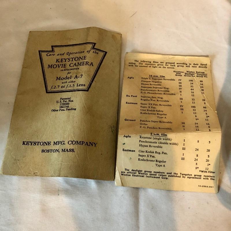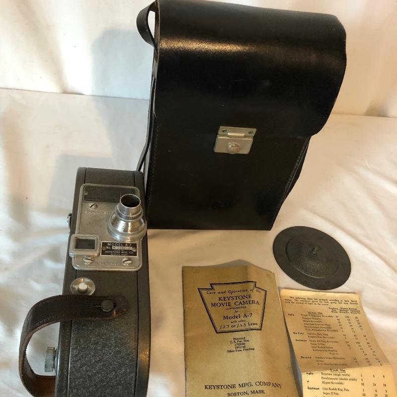 This great vintage camera comes with its original manual and carrying case. A Keystone movie camera Model A - 7, 16mm, that appears to be in great shape. It has not been tested. Case stitching is coming apart on one side, see images.