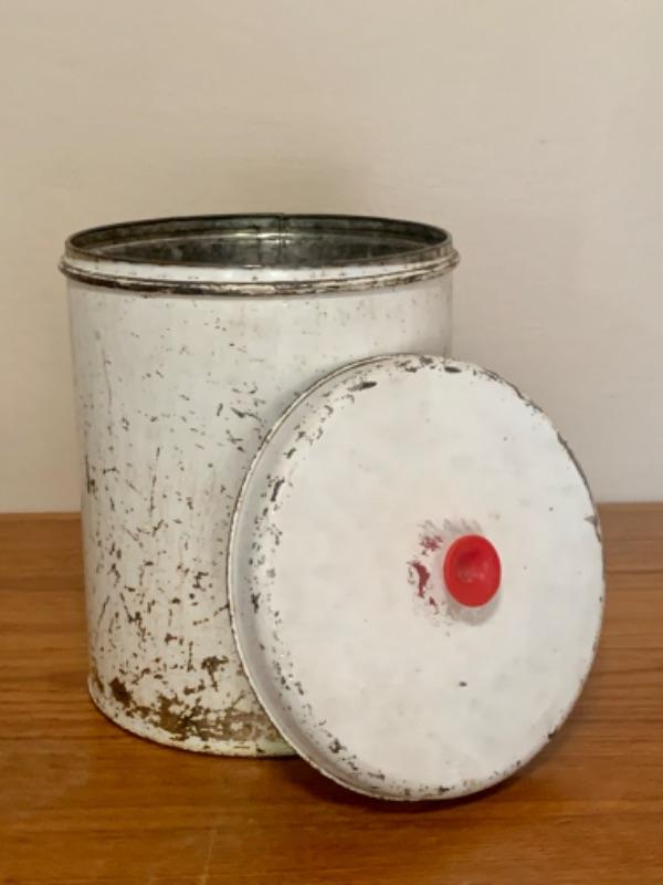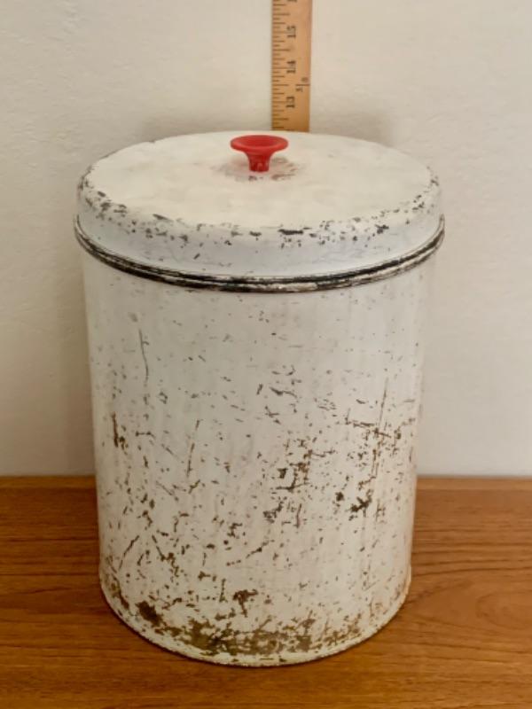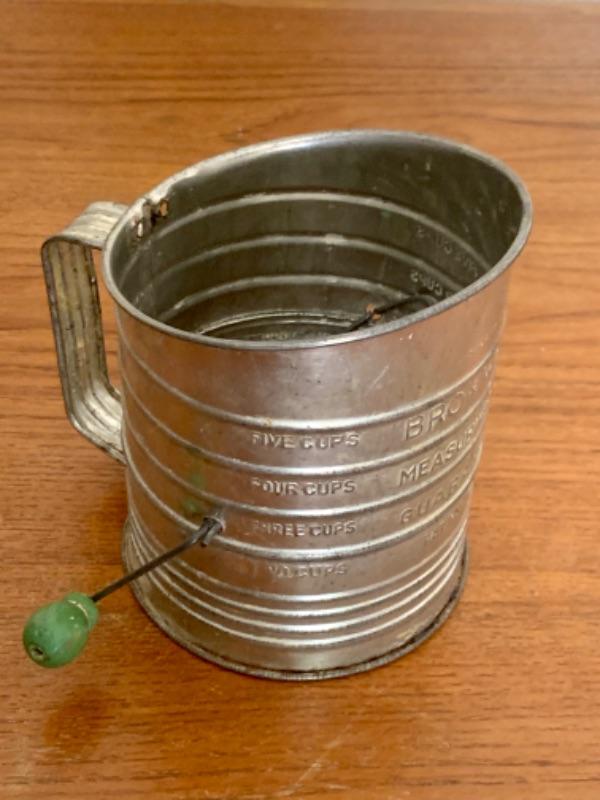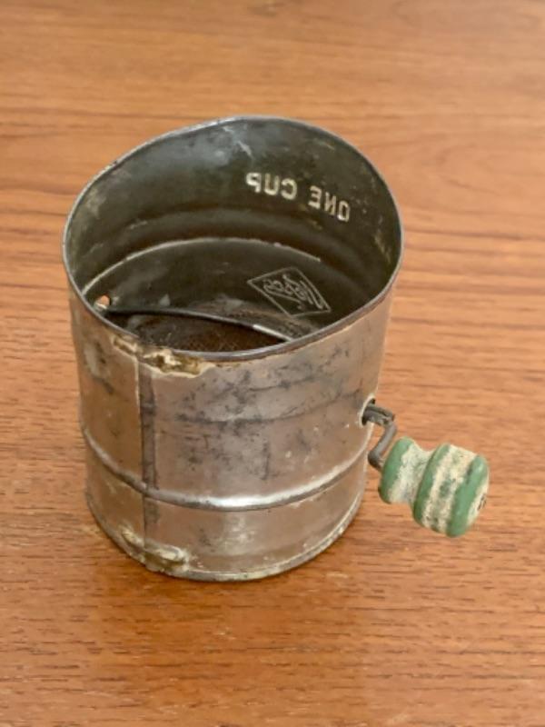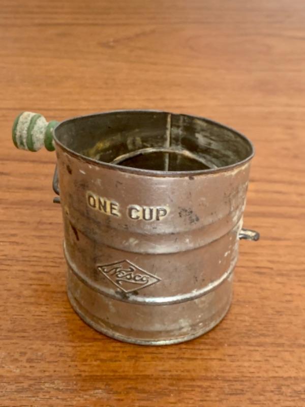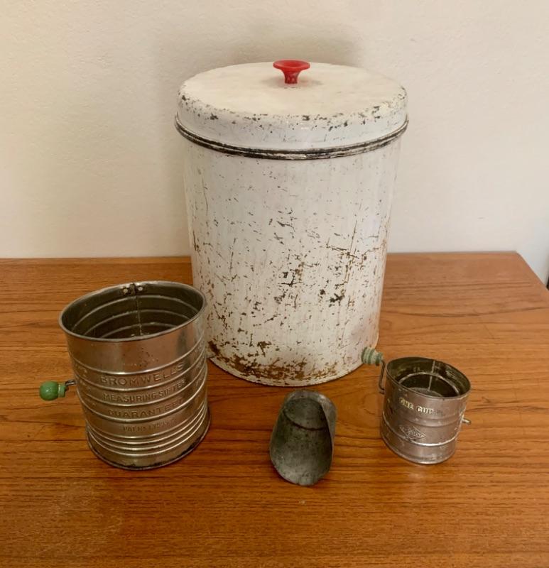 Beautiful, rustic /primitive farmhouse kitchen decor, includes Mercantile Metal Flour Canister with red Bakelite knob. Measures 13” tall, 9 1/2” diameter. Bromwell 5c sifter with green wood knob, Nesco 1c sifter with green wood knob and very primitive handmade metal dry scoop.