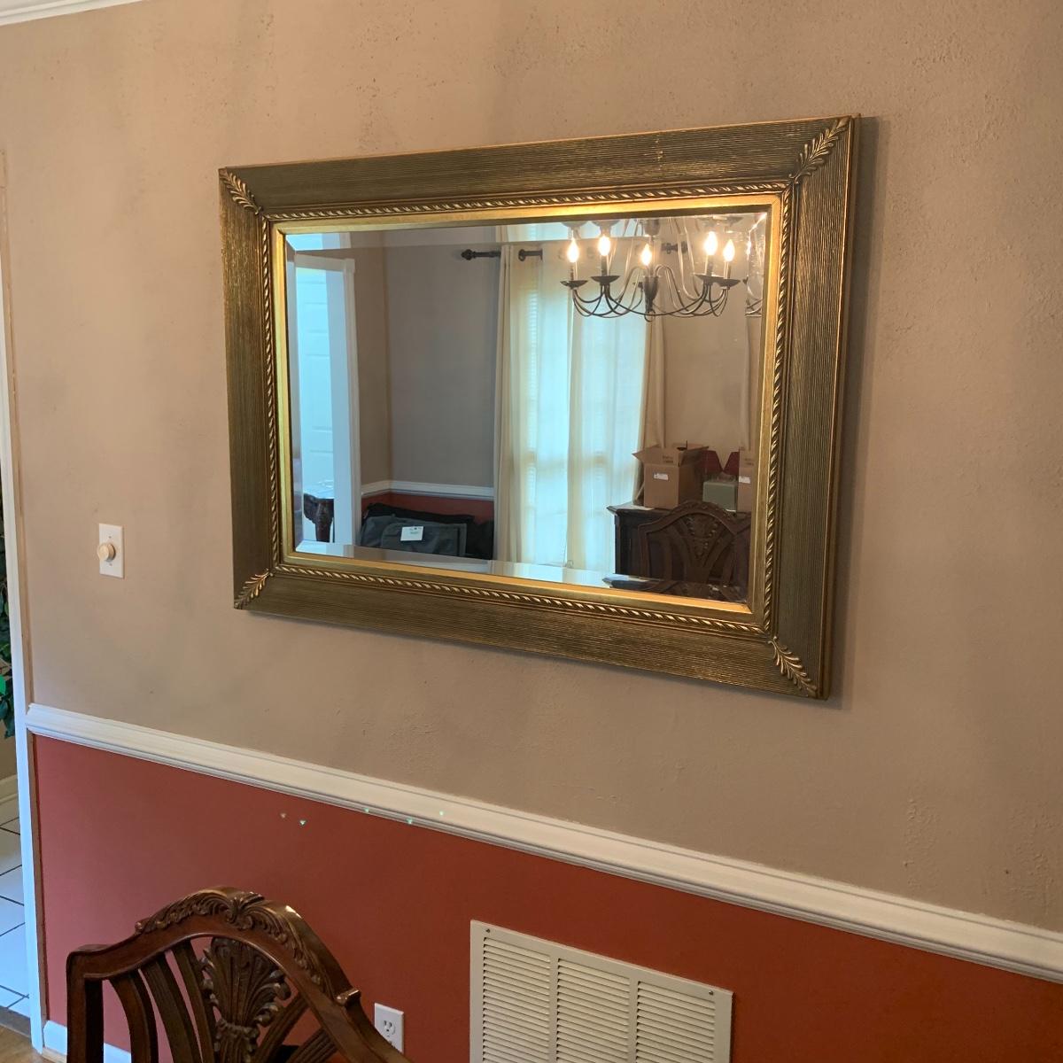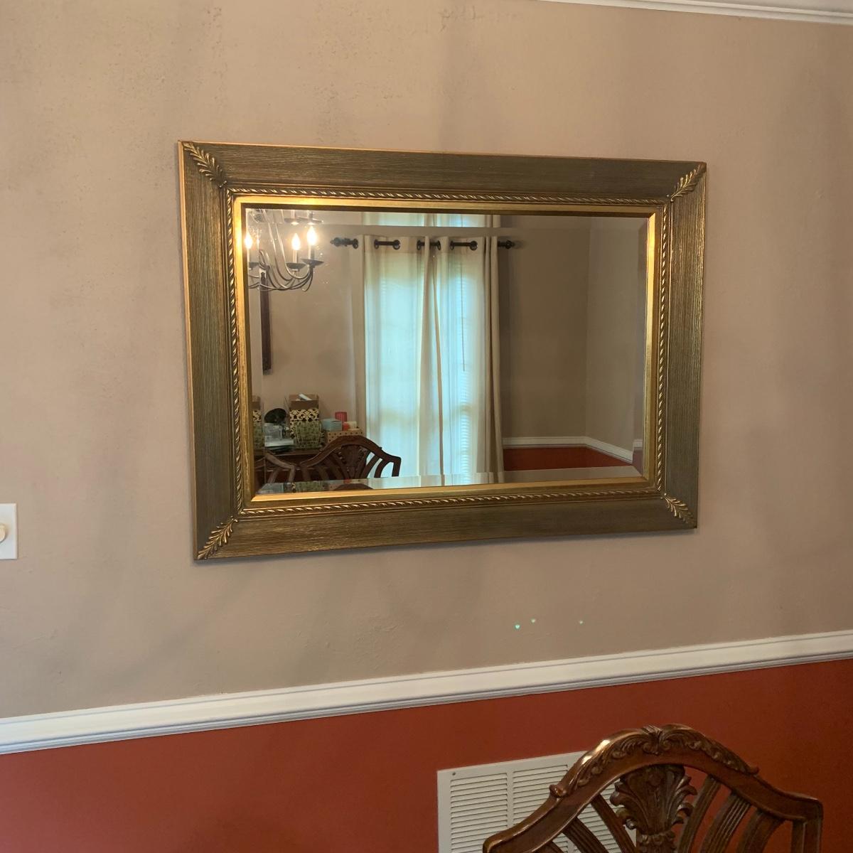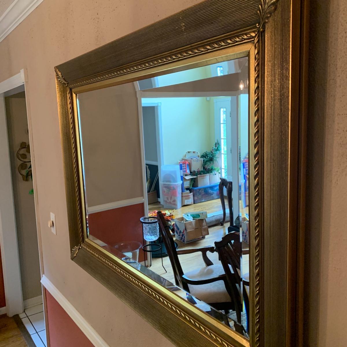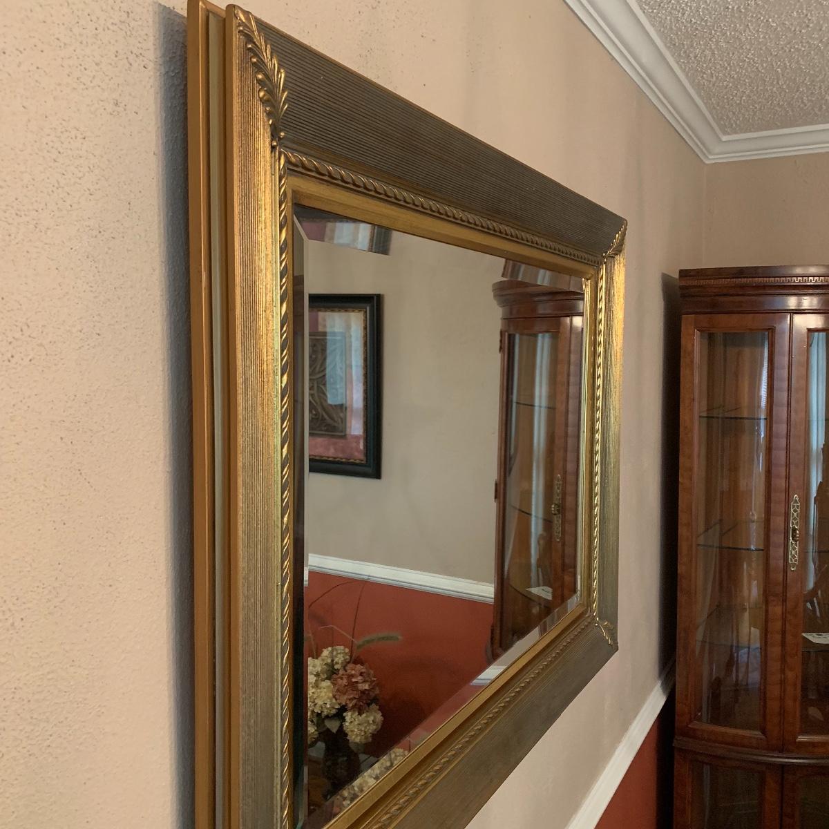 This elegant mirror will bring a touch of class to any room that it resides in. It features beveled glass, and a beautiful detailed wood tame that is painted gold. Mirror is in good condition and is fairly heavy but with good sturdy hanging hardware, see images. This piece measures 43” X 33”. Local pickup only.