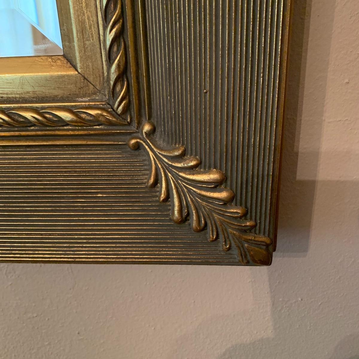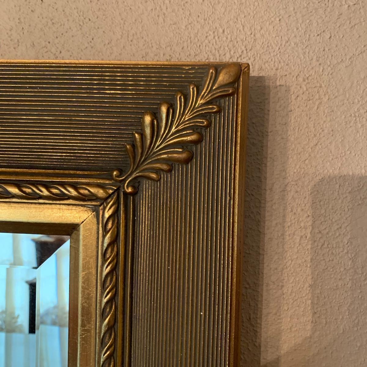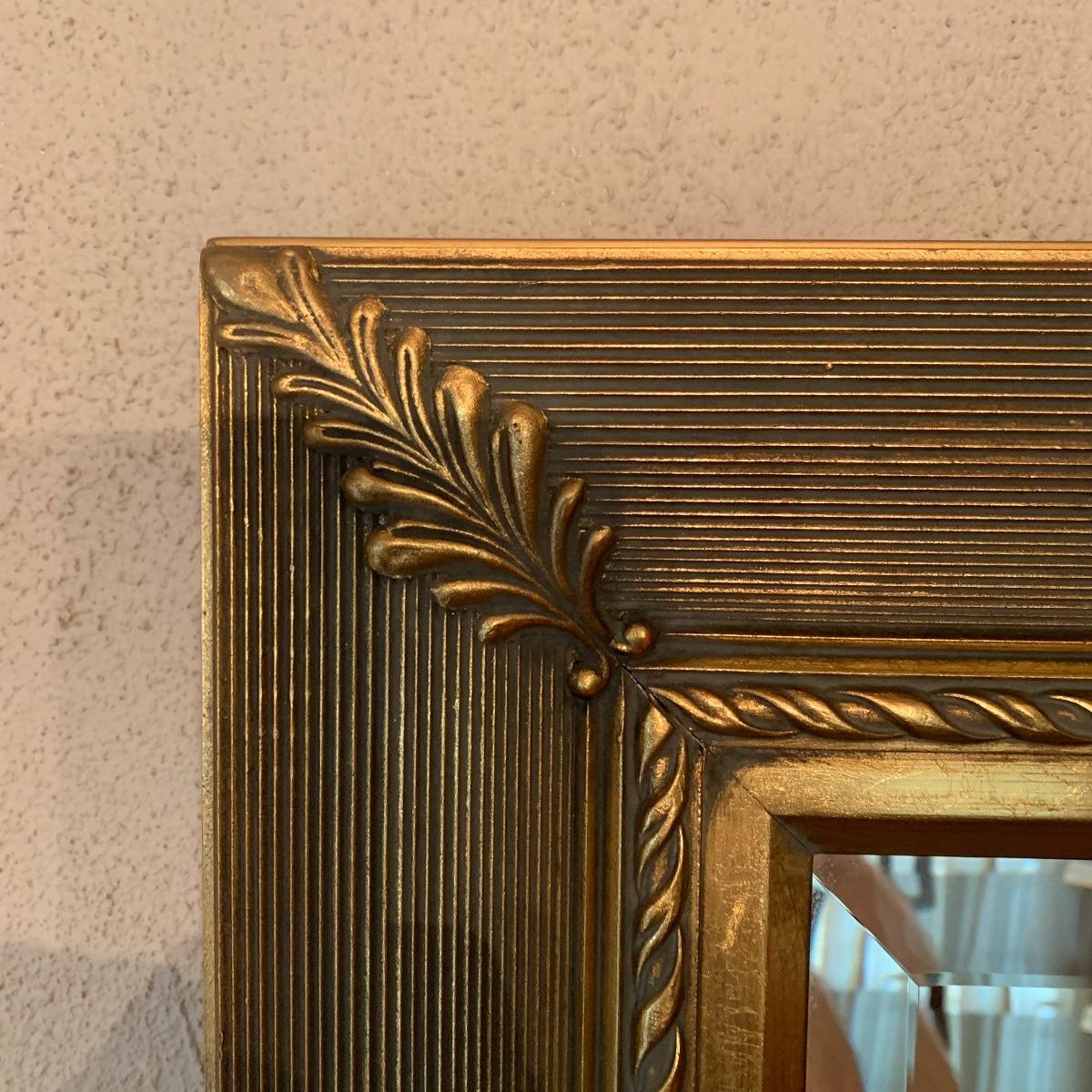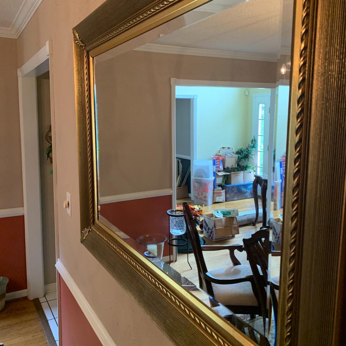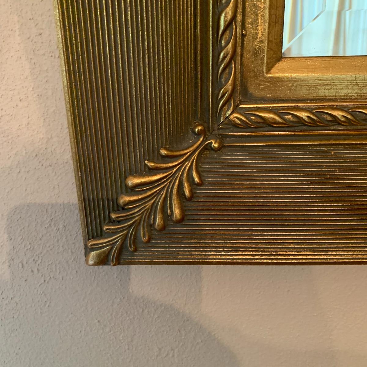 This elegant mirror will bring a touch of class to any room that it resides in. It features beveled glass, and a beautiful detailed wood tame that is painted gold. Mirror is in good condition and is fairly heavy but with good sturdy hanging hardware, see images. This piece measures 43” X 33”. Local pickup only.