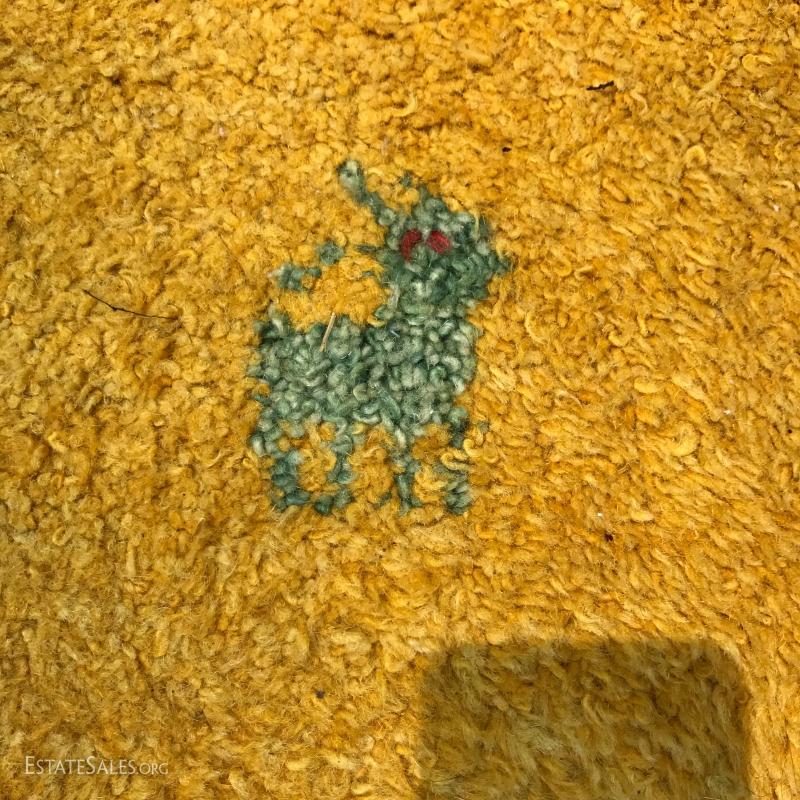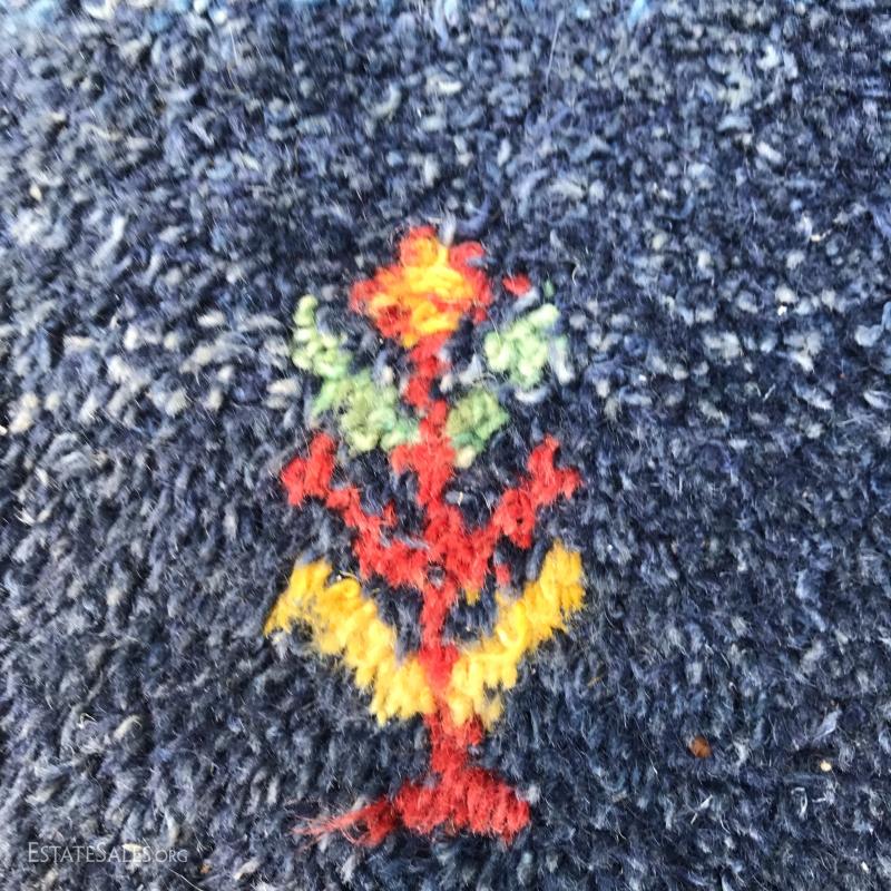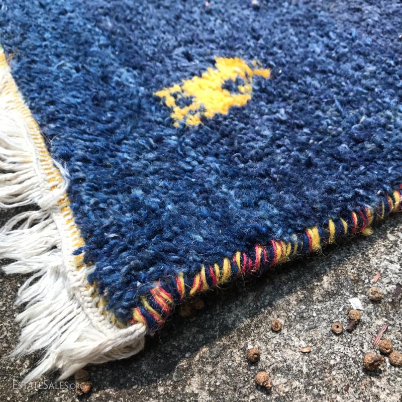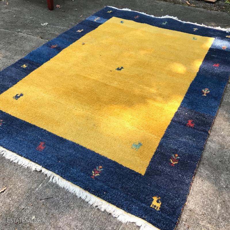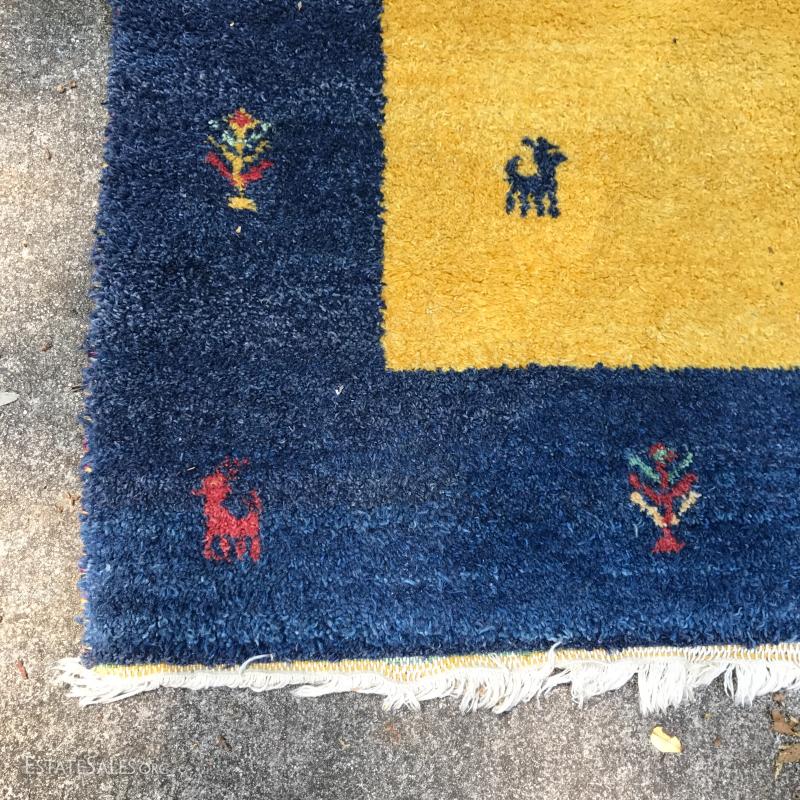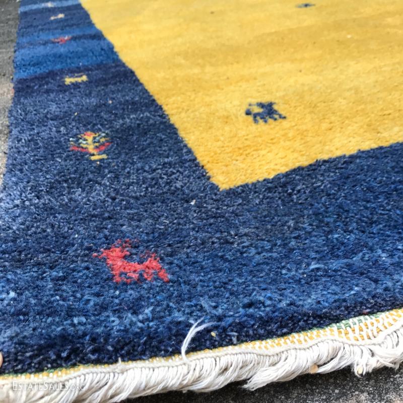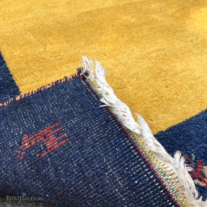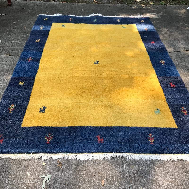 Shades of blue and yellow make up this wool rug. Made in India. Great condition. Photos taken outside created shadows on rug. Not stained. 98" x 88". Please note Rug is heavy so be aware if you are shipping.