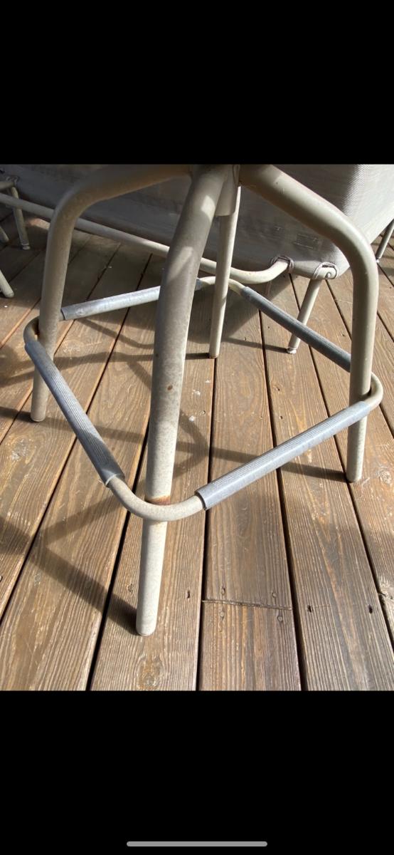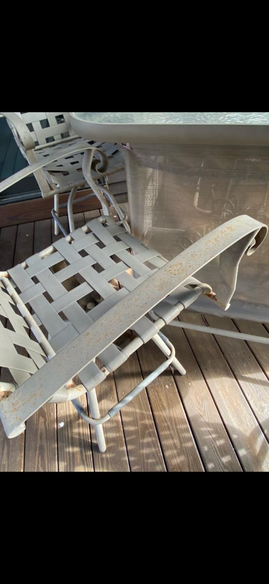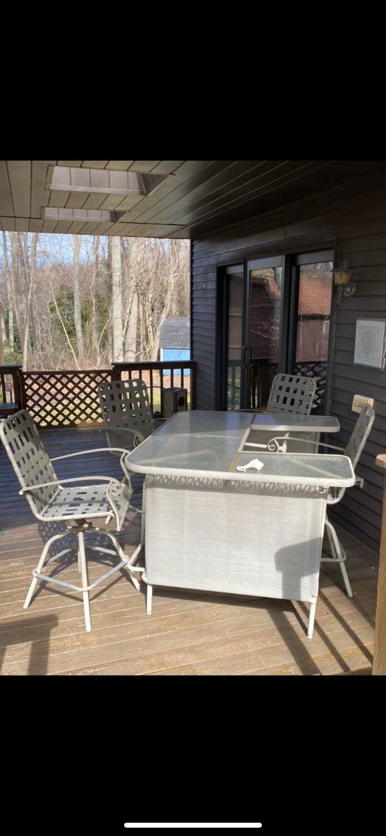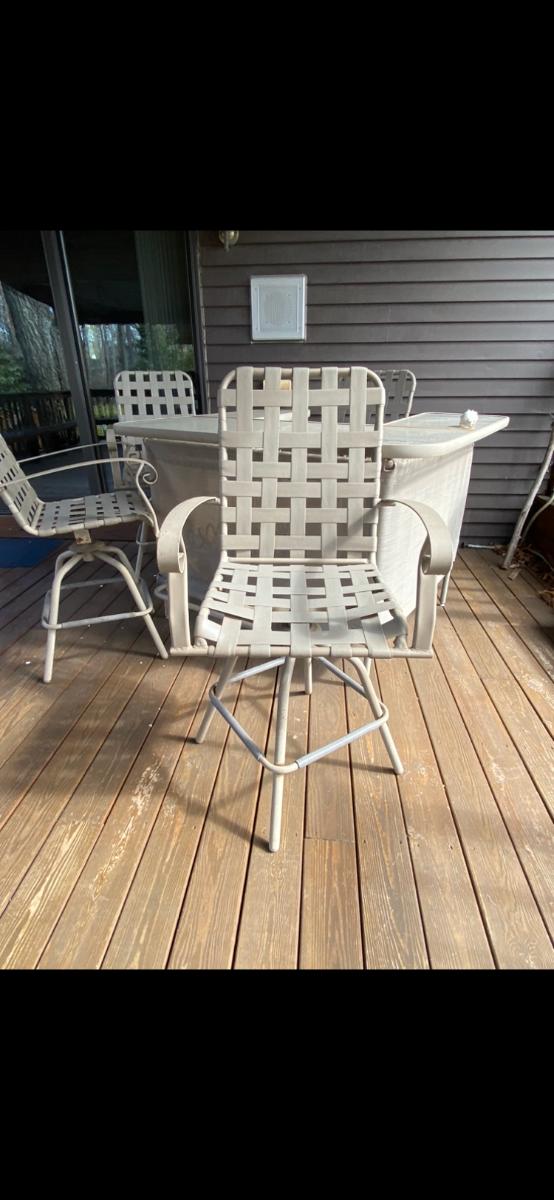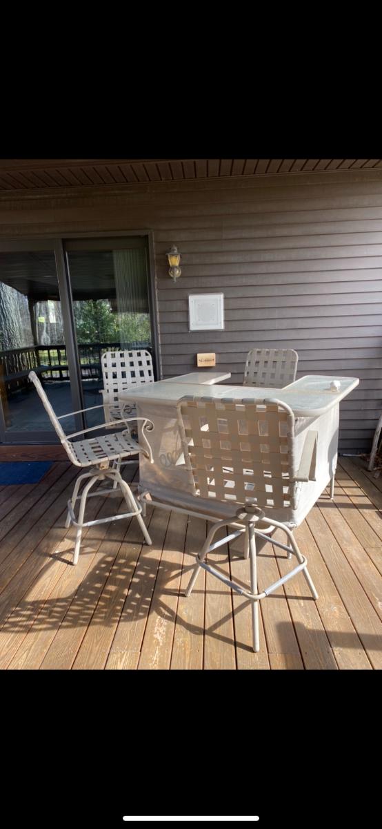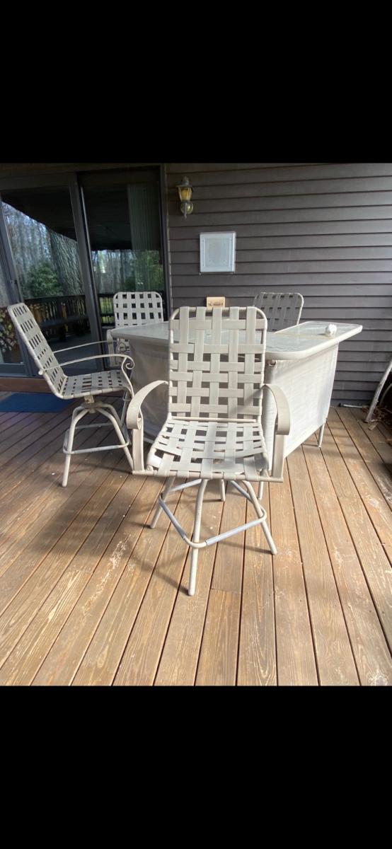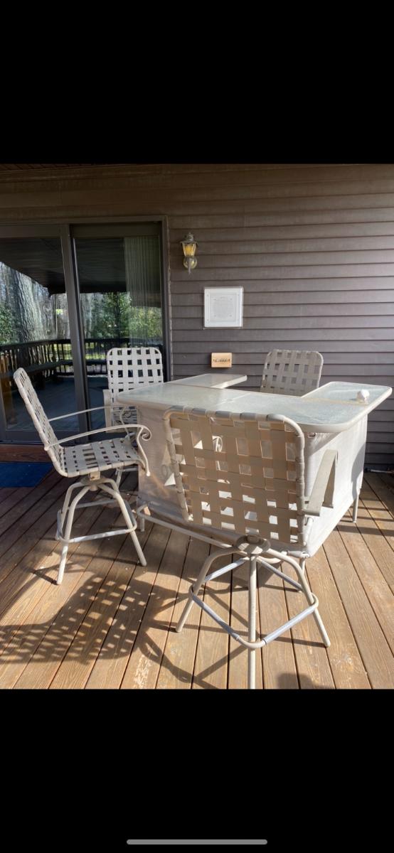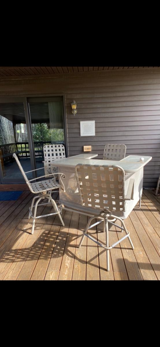 This set is in used but good condition. It does have rust from outdoor elements. Chair’s Swivel, glass top bar and shelves. The pictures show condition, measurements if taken, and what is included in the lot. Due to the large amount that we photograph and the time frame, we are not always able to take measurements. All items unless noted, are pre-owned and have been used. If you purchased furniture, you must bring help. We do not allow one person to carry large furniture out on their own. Bring help, tools and a truck for the safety of our client’s homes, and your personal safety. Any damages that result to the property including walls, and floors due to moving of the furniture will be charged to the buyer. Company policy. Thank you.