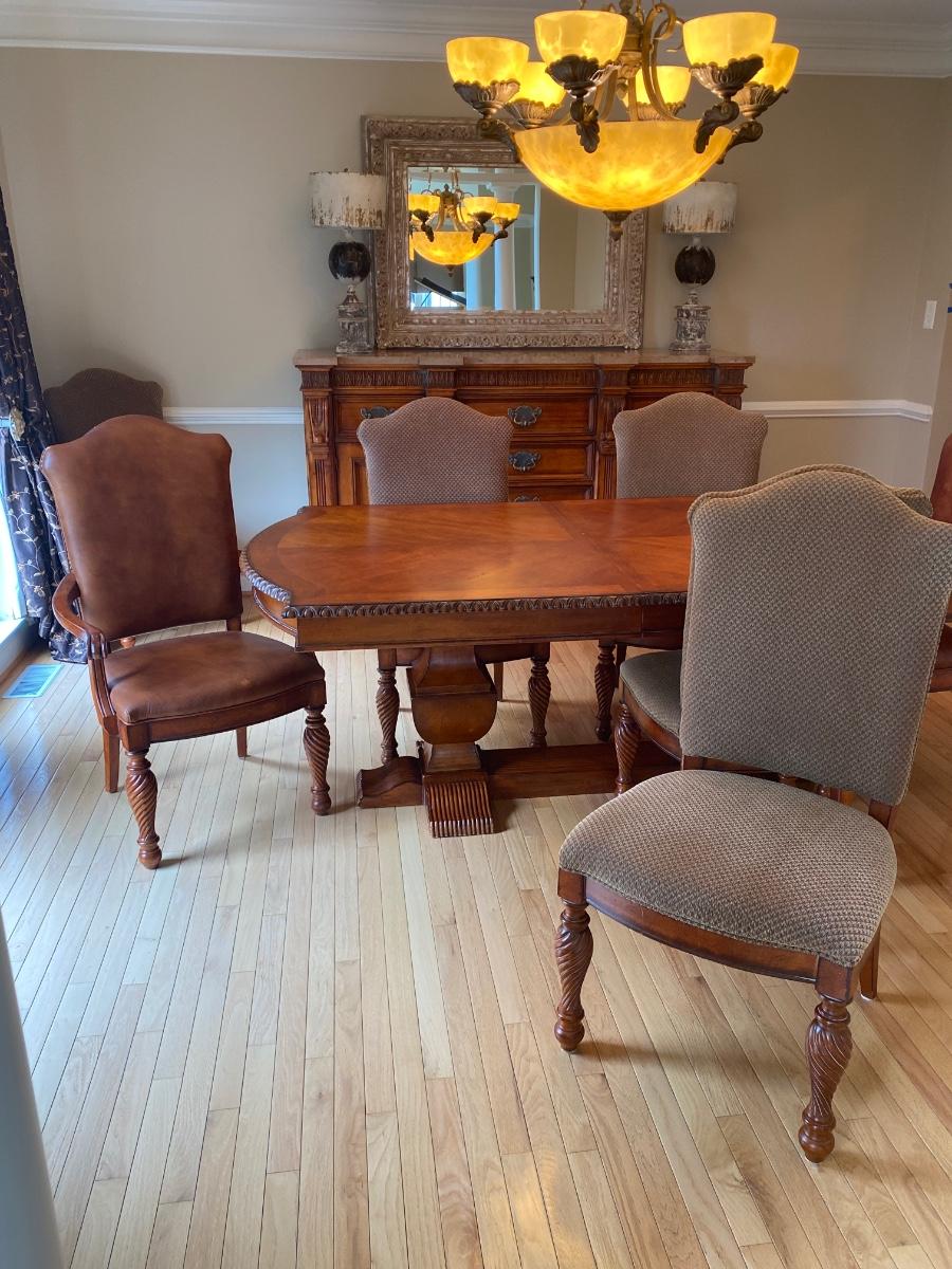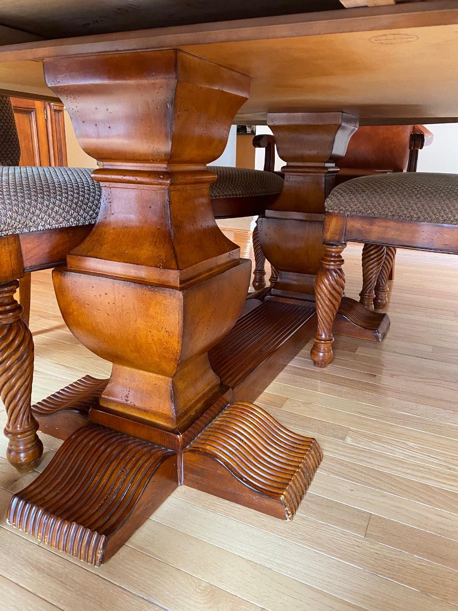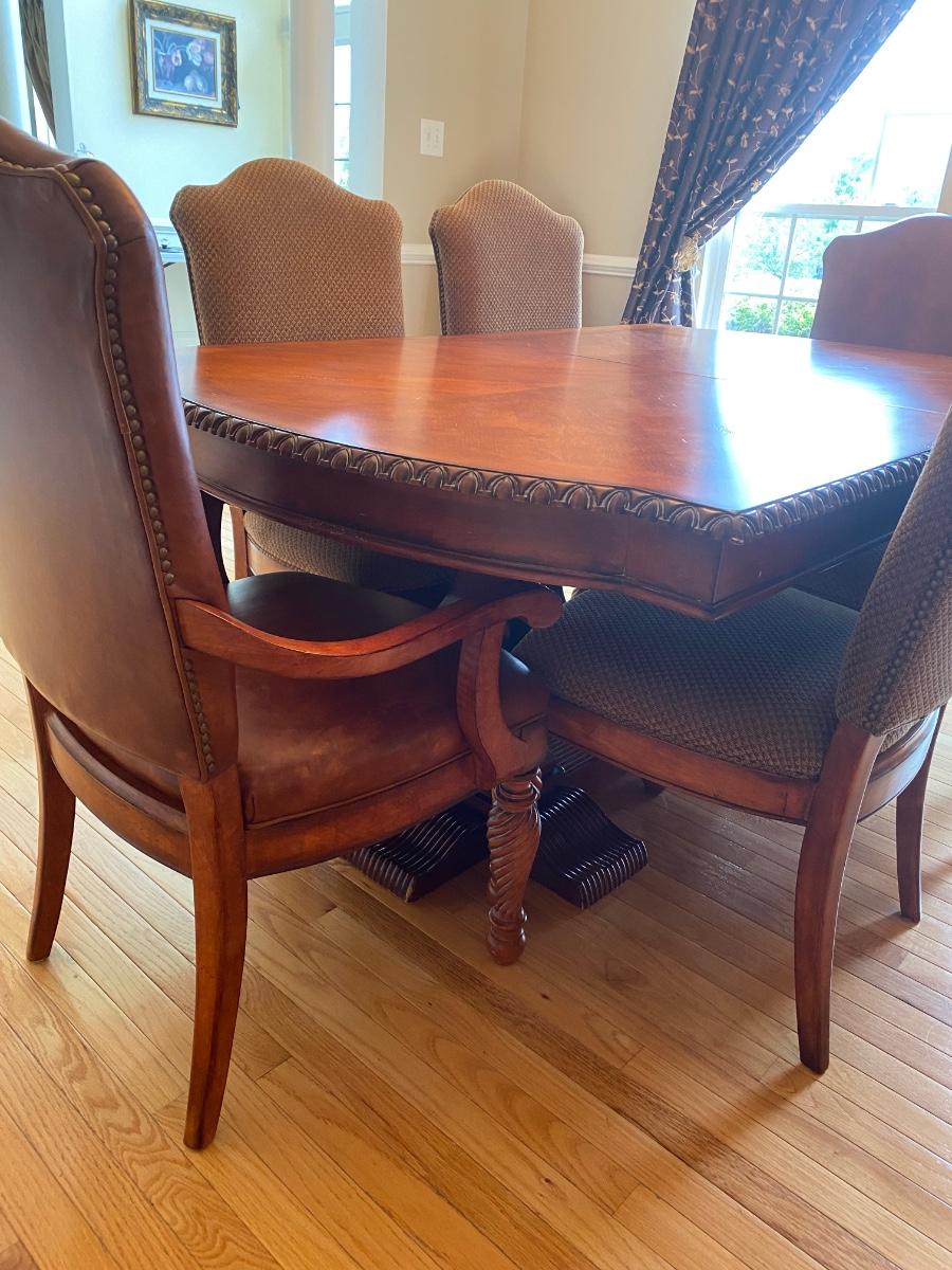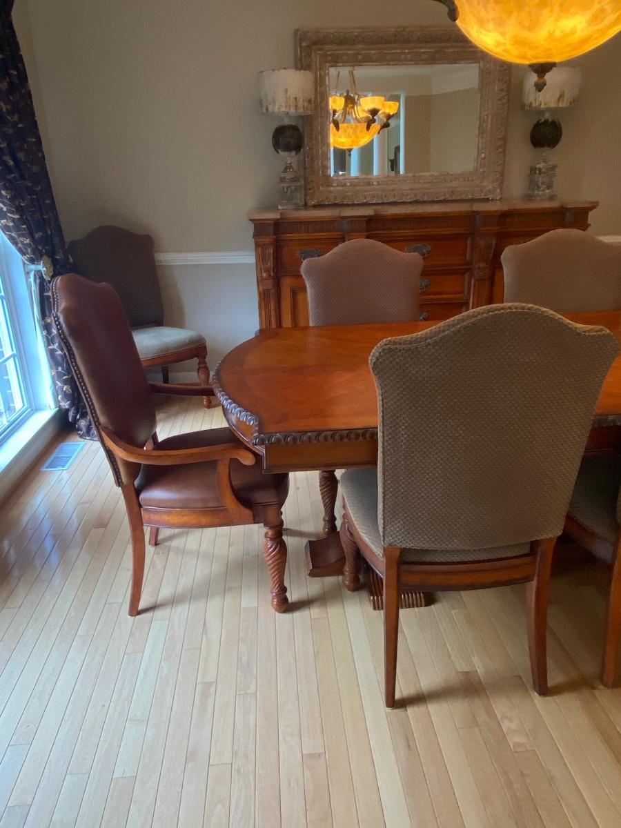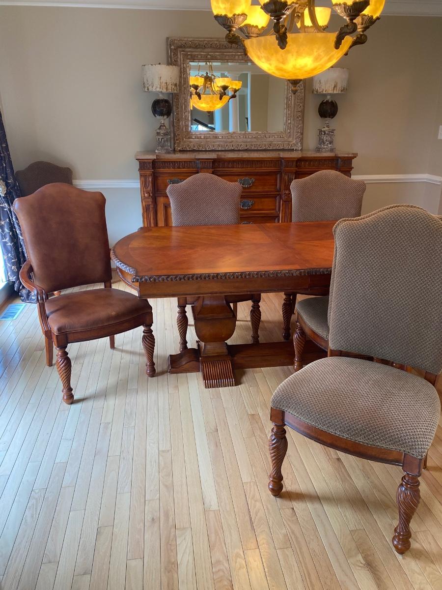 Hickory White by Owen Starnes solid wood dinning table. Six Plush chairs and two leather chairs. Large beautiful dinning piece.