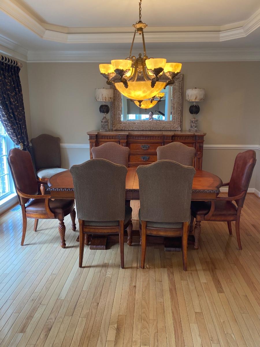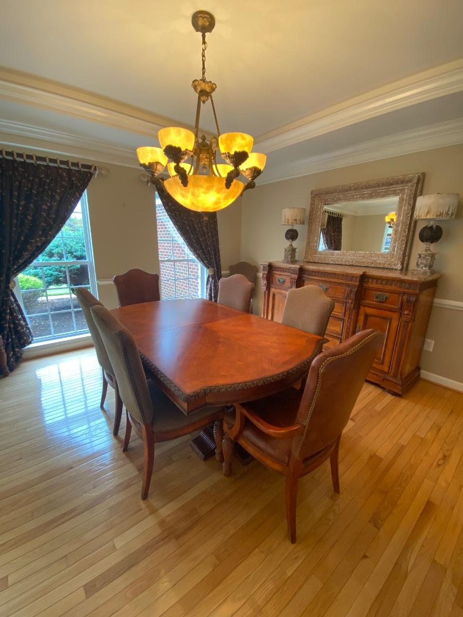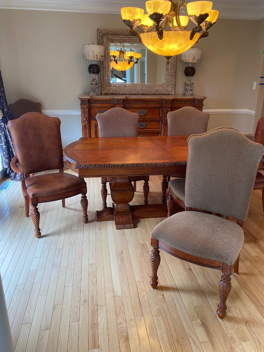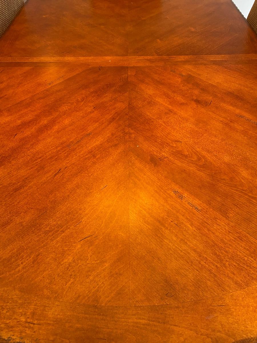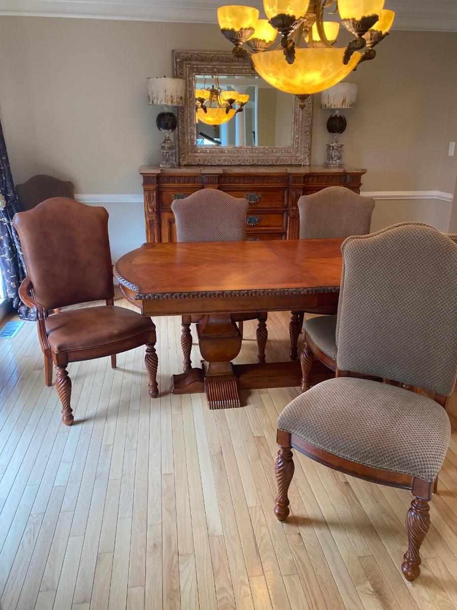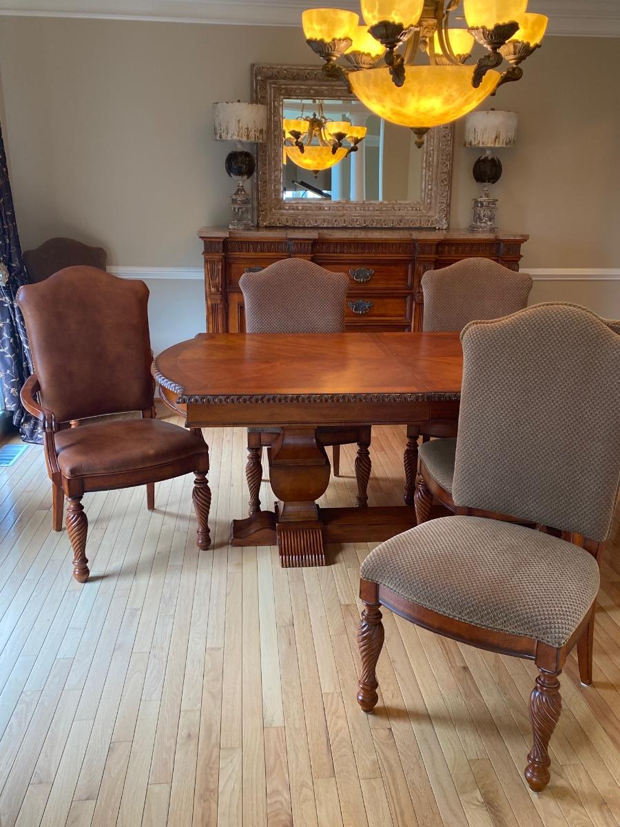 Hickory White by Owen Starnes solid wood dinning table. Six Plush chairs and two leather chairs. Large beautiful dinning piece.