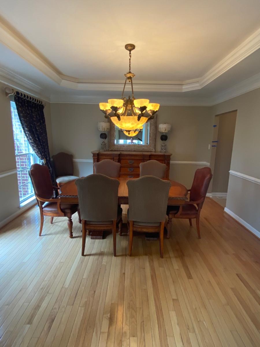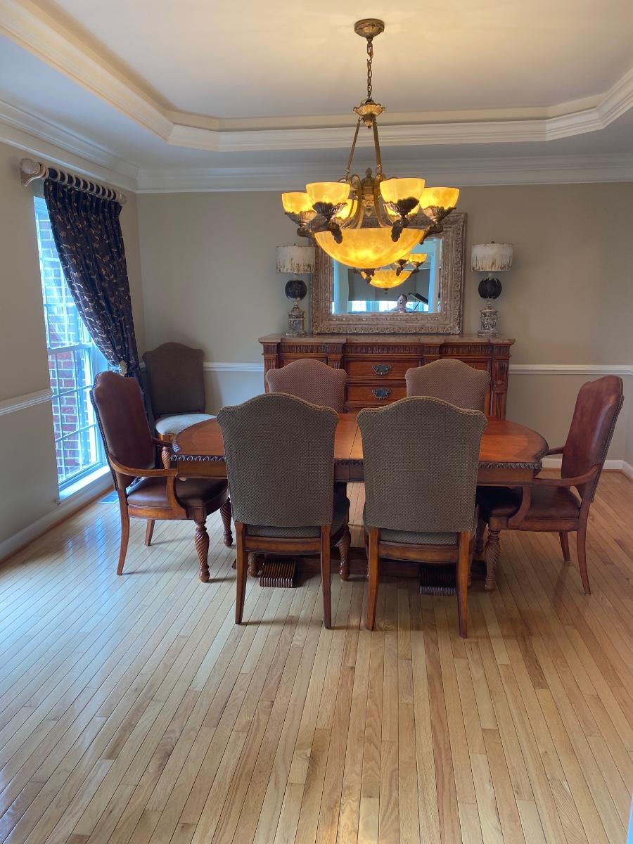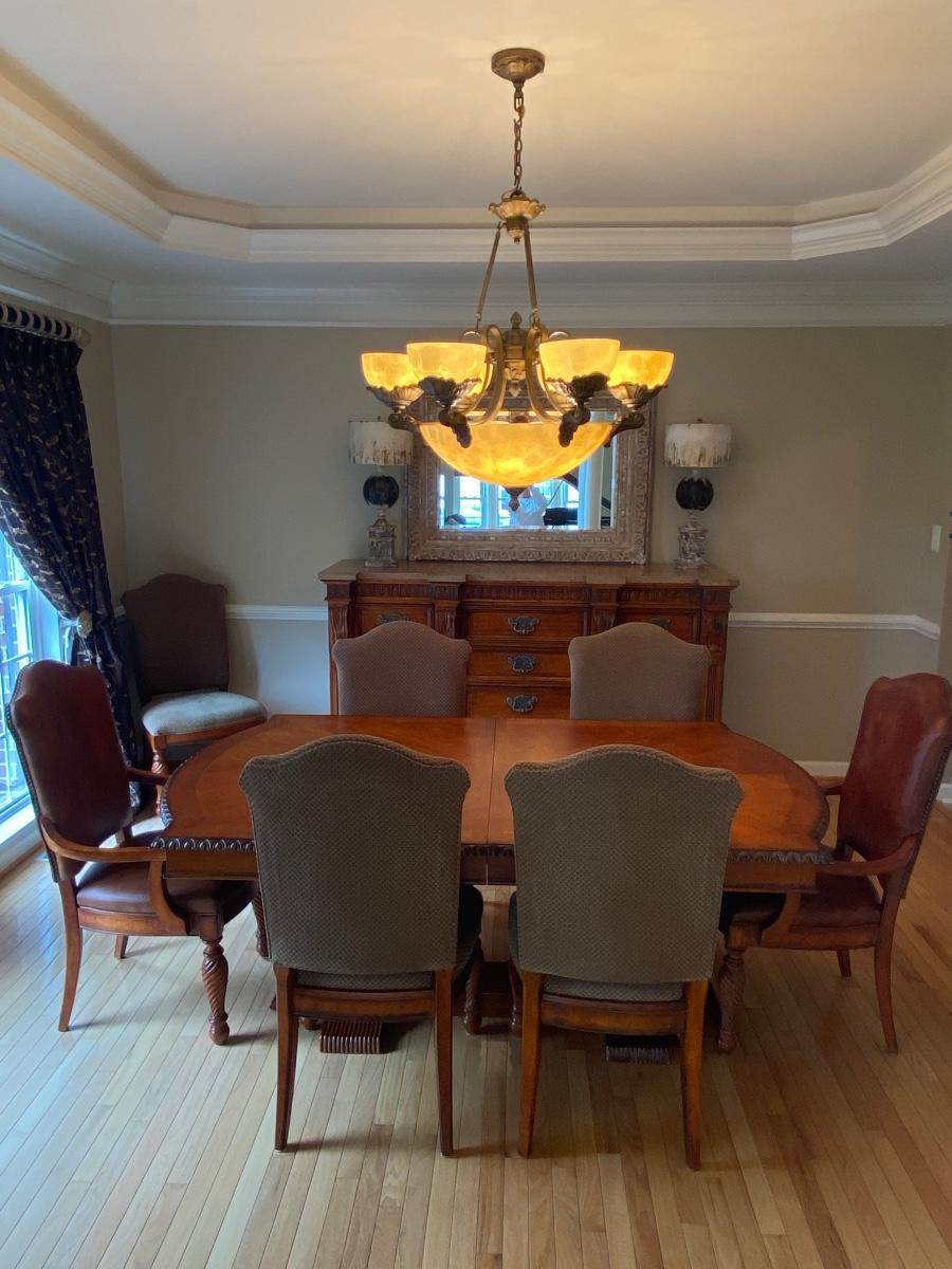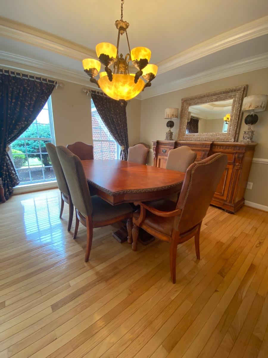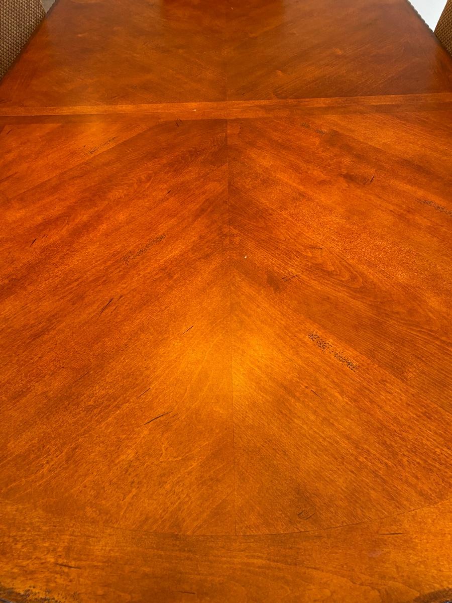 Hickory White by Owen Starnes solid wood dinning table. Six Plush chairs and two leather chairs. Large beautiful dinning piece.