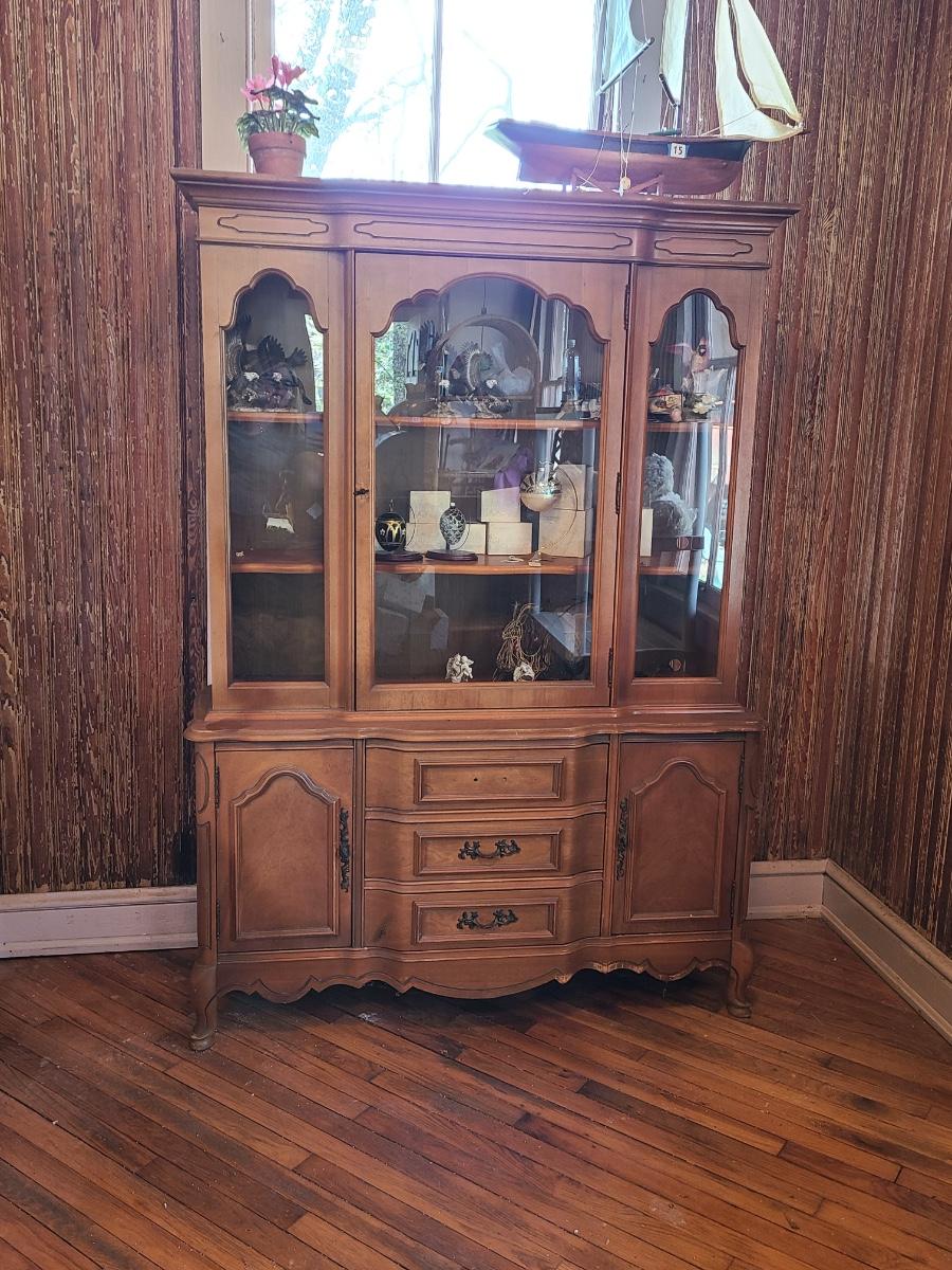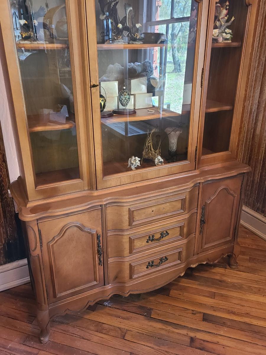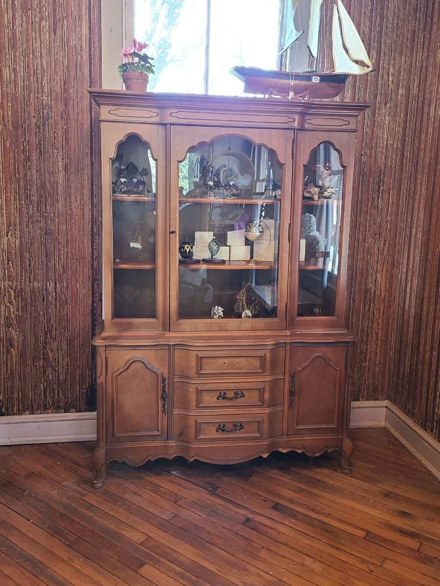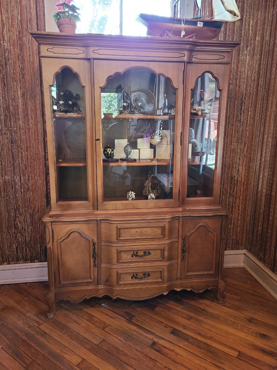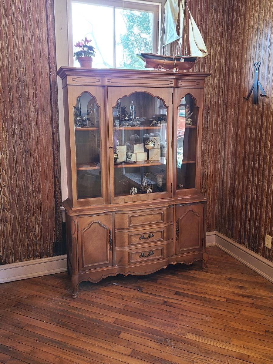 This is for the cabinet only. Solid wood, shows wear due to age. Perfect for home or store. Needs dusting. Is one solid piece. It was used in store for displaying merchandise. Please see all pictures as they are the best representation of the items. The pictures show condition, measurements if taken, and what is included in the lot. Due to the large amount that we photograph and the time frame, we are not always able to take measurements. All items unless noted, are pre-owned and have been used. If you purchased furniture, you must bring help. We do not allow one person to carry large furniture out on their own. Bring help, tools and a truck for the safety of our client’s homes, and your personal safety. Any damages that result to the property including walls, and floors due to moving of the furniture will be charged to the buyer. Company policy. Thank you.