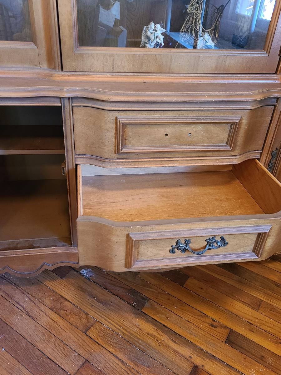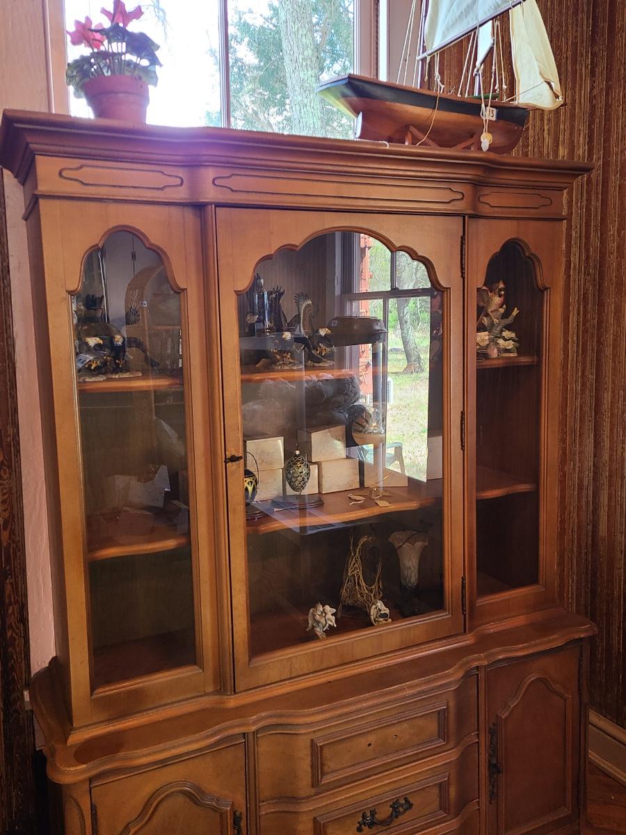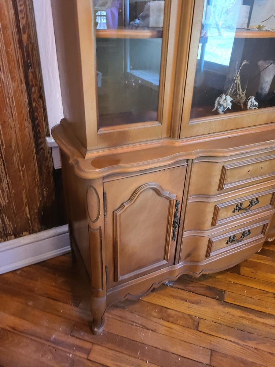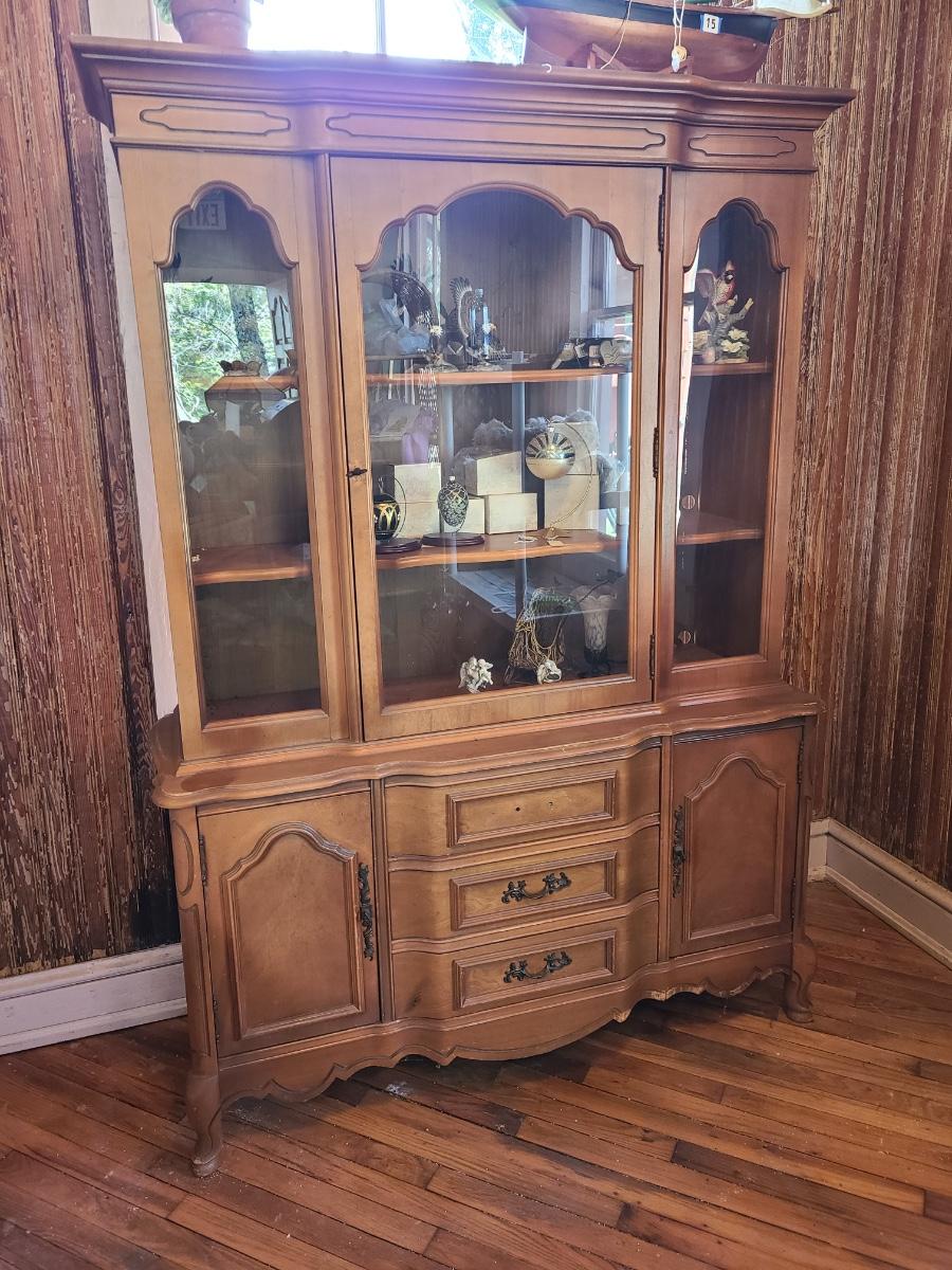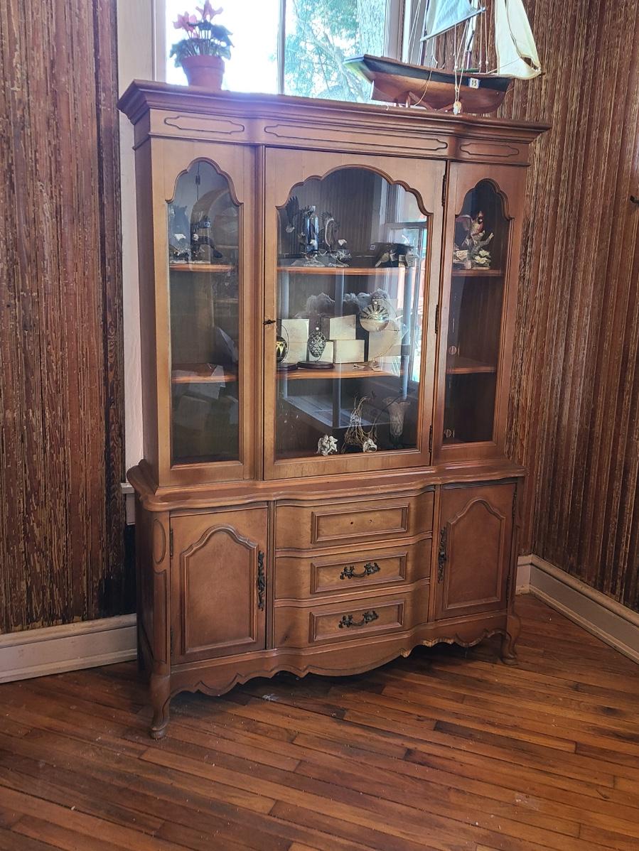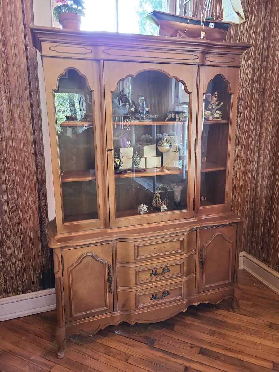 This is for the cabinet only. Solid wood, shows wear due to age. Perfect for home or store. Needs dusting. Is one solid piece. It was used in store for displaying merchandise. Please see all pictures as they are the best representation of the items. The pictures show condition, measurements if taken, and what is included in the lot. Due to the large amount that we photograph and the time frame, we are not always able to take measurements. All items unless noted, are pre-owned and have been used. If you purchased furniture, you must bring help. We do not allow one person to carry large furniture out on their own. Bring help, tools and a truck for the safety of our client’s homes, and your personal safety. Any damages that result to the property including walls, and floors due to moving of the furniture will be charged to the buyer. Company policy. Thank you.