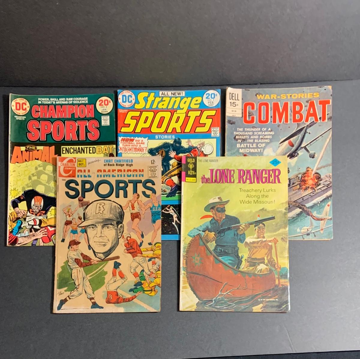LOT:60: Lot of 5 Comic Books- DC Strange Sports; DC Champion Sports; Dell War Stories Combat; CharIton Comics All American Sports;  Gold Key Lone Ranger