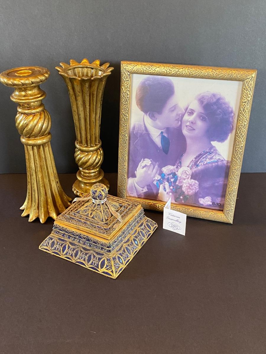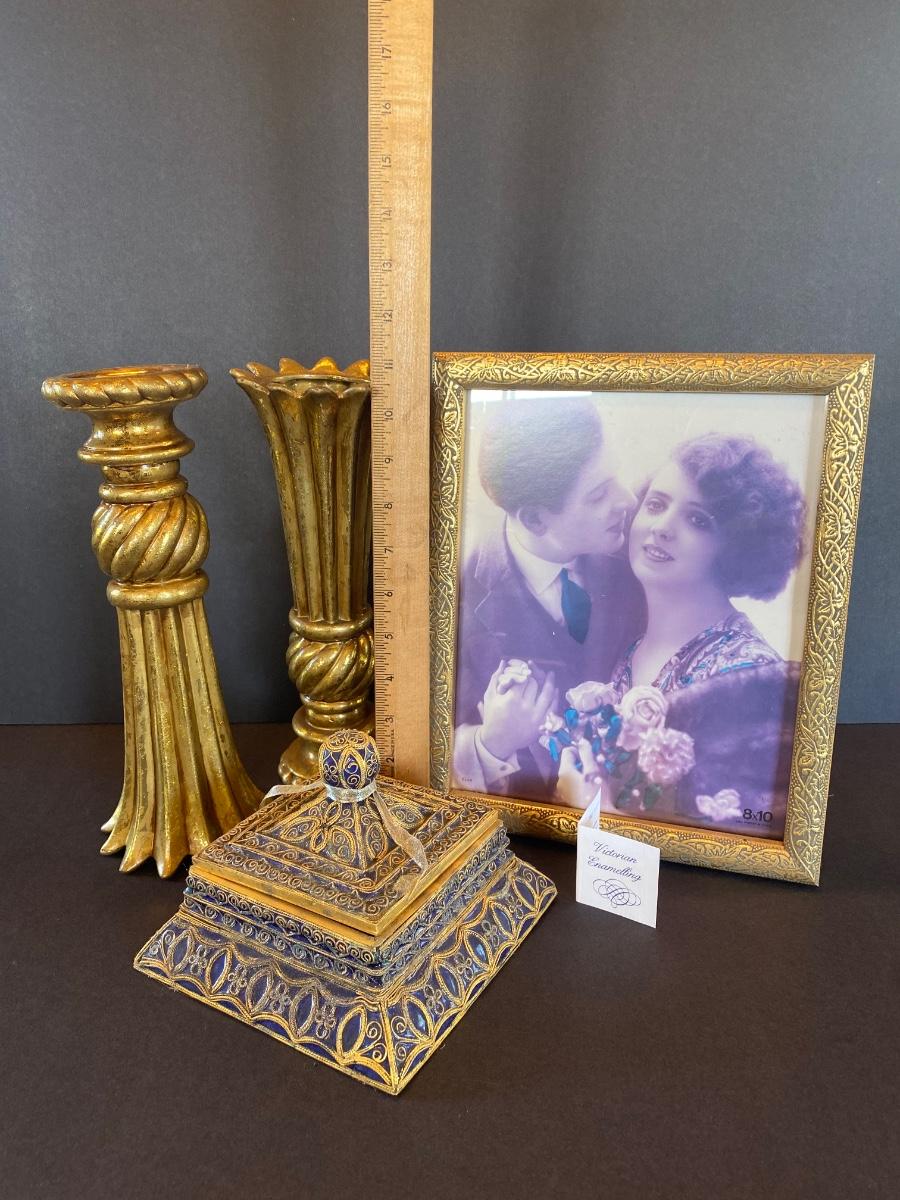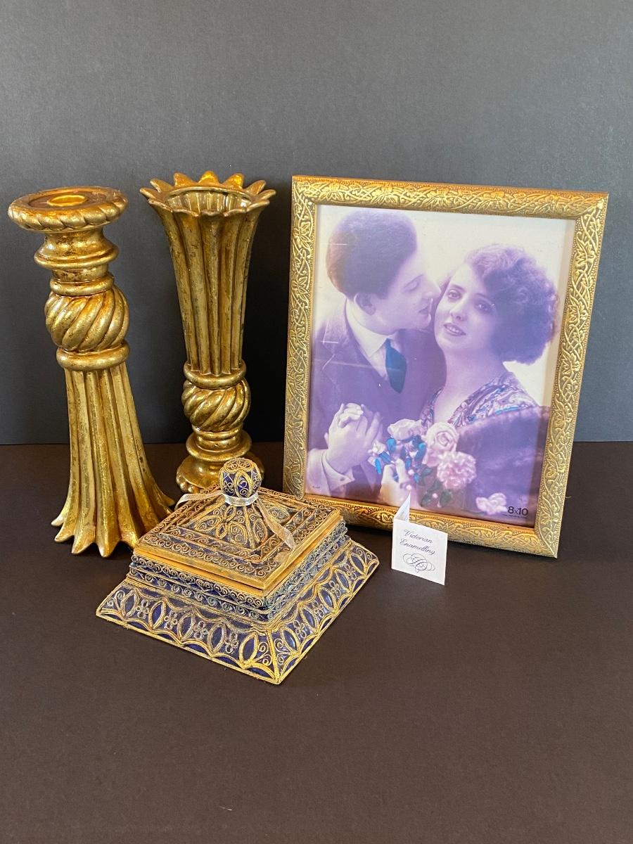 LOT 1G: Gold and Blue Keepsake Box, Vase/Candlesticks  and more