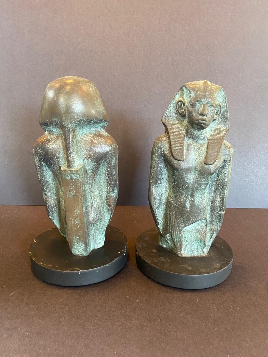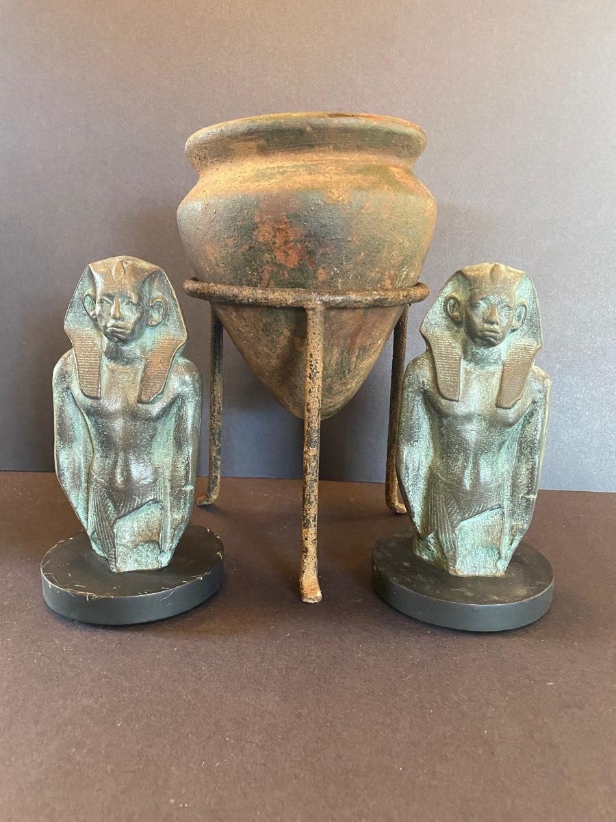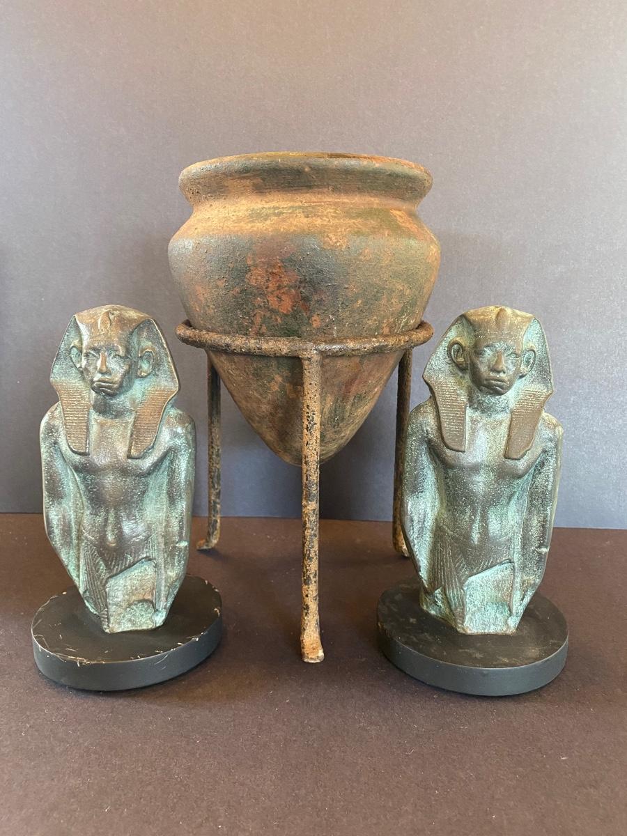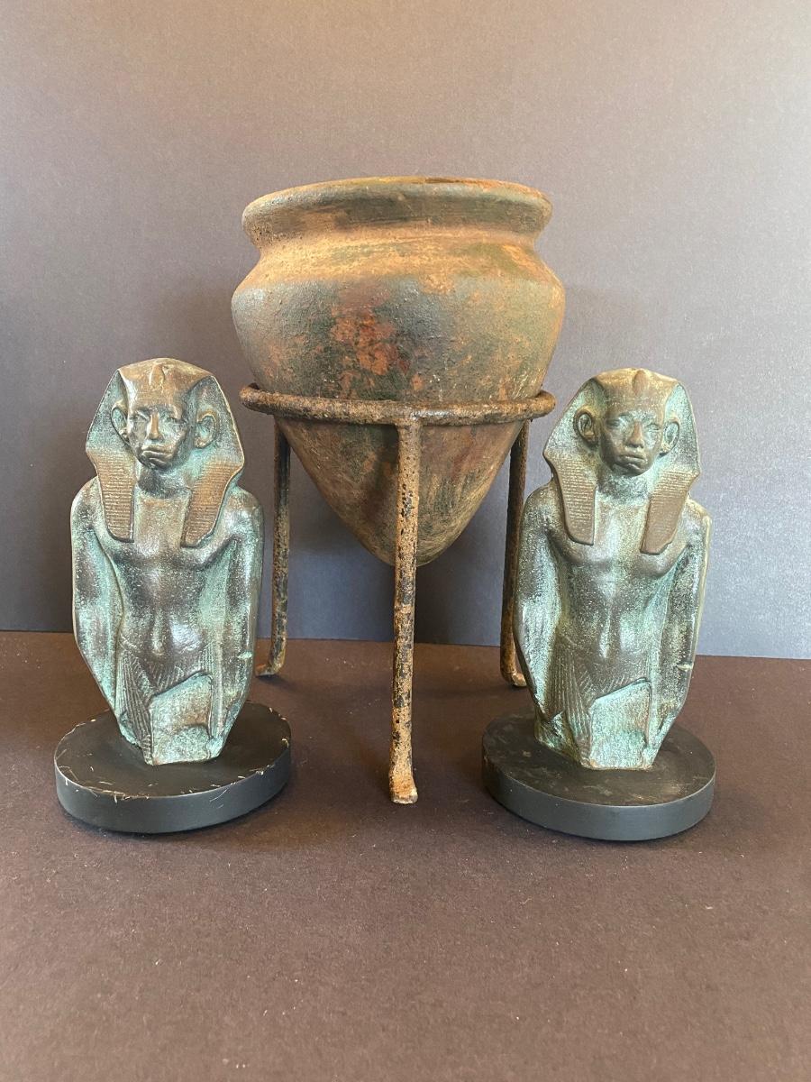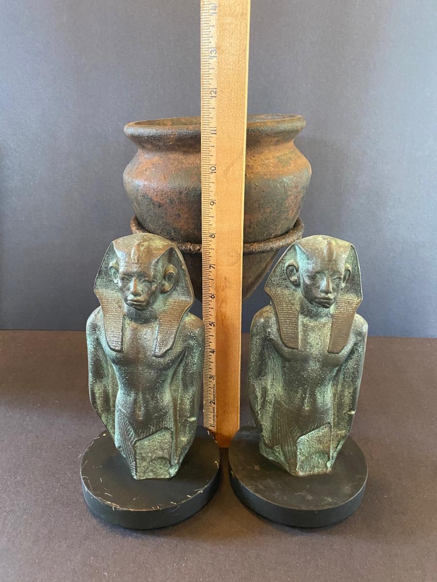 Set of two matching brass statues and a decorative clay urn on metal stand. Please see all pictures as they are the best representation of the items. The pictures show condition, measurements if taken, and what is included in the lot. Due to the large amount that we photograph and the time frame, we are not always able to take measurements. All items unless noted, are pre-owned and have been used. If you purchased furniture, you must bring help. We do not allow one person to carry large furniture out on their own. Bring help, tools and a truck for the safety of our client’s homes, and your personal safety. Any damages that result to the property including walls, and floors due to moving of the furniture will be charged to the buyer. Company policy. Thank you.