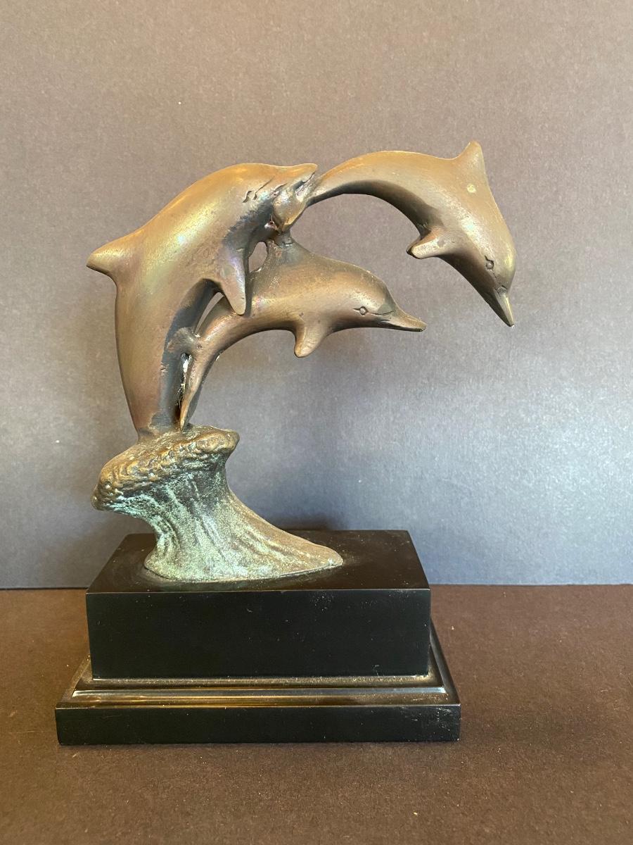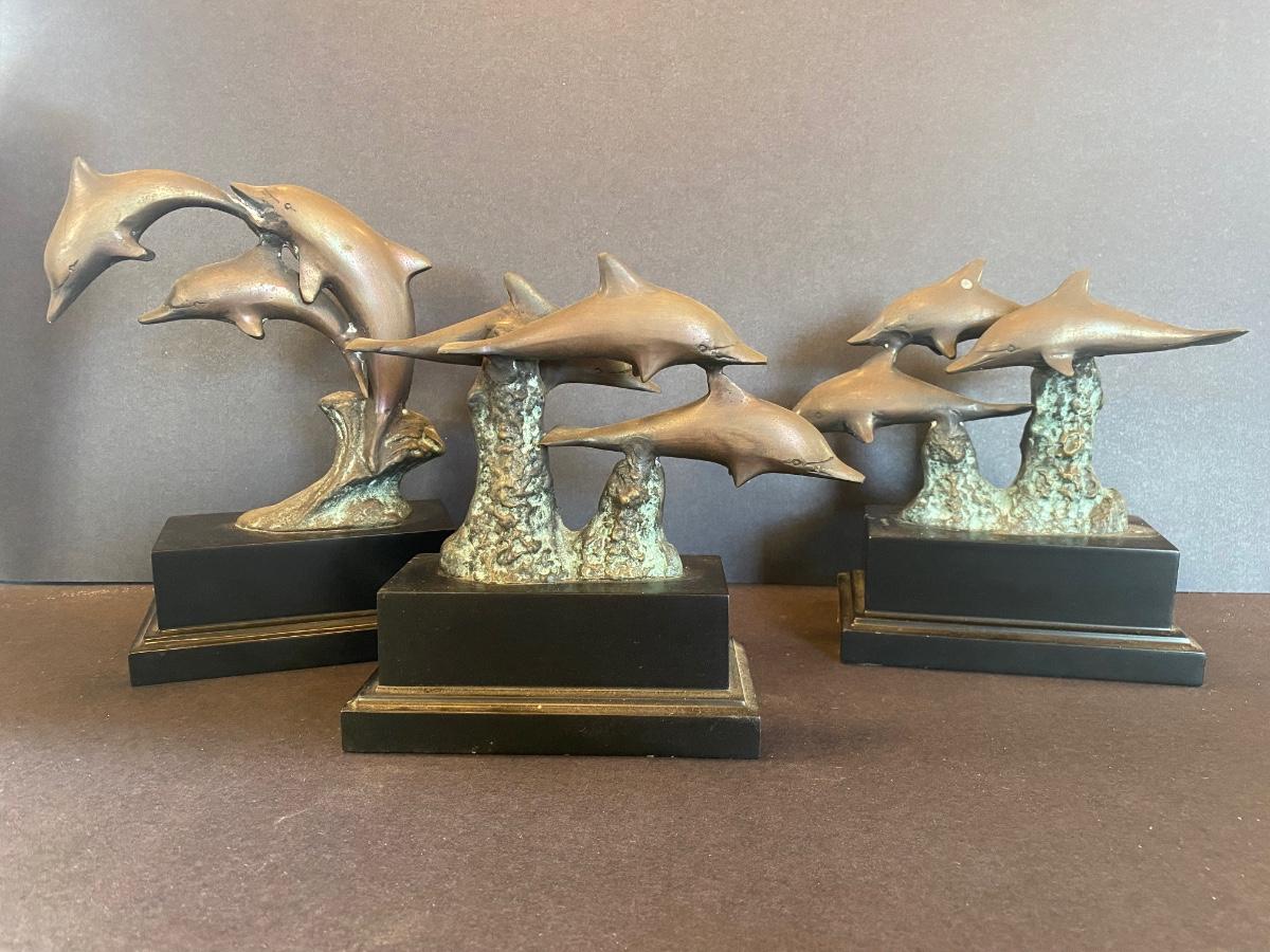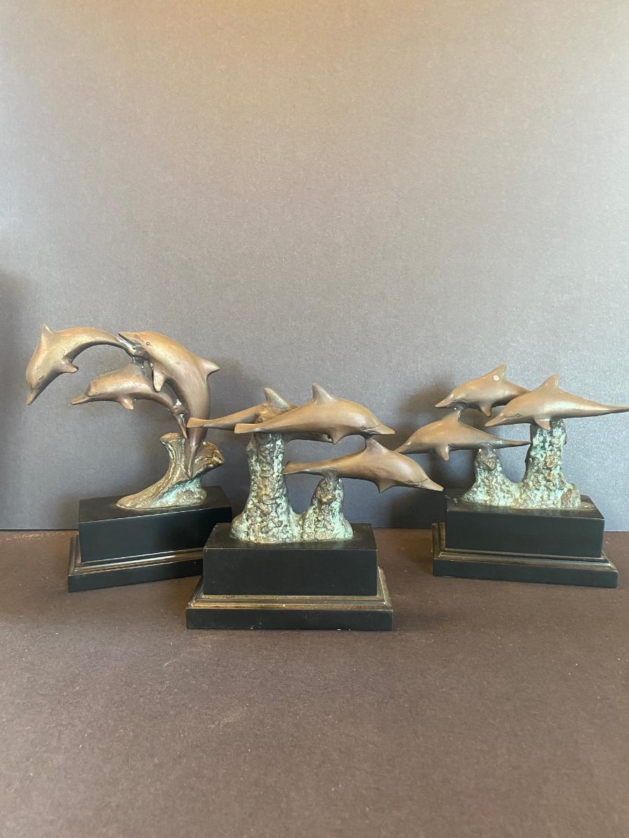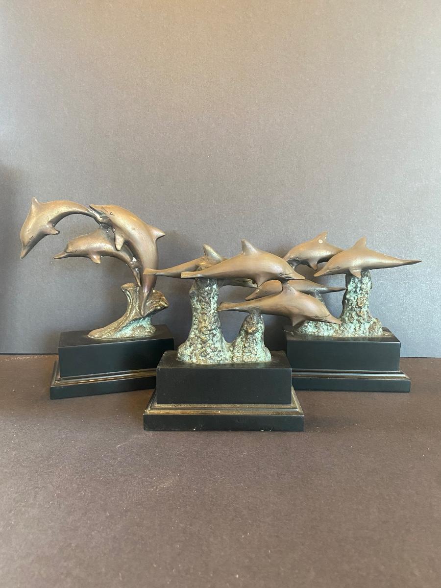 Three statues of dolphins. These were purchased wholesale for resale. The dolphins are brass. Please see all pictures as they are the best representation of the items. The pictures show condition, measurements if taken, and what is included in the lot. Due to the large amount that we photograph and the time frame, we are not always able to take measurements. All items unless noted, are pre-owned and have been used. If you purchased furniture, you must bring help. We do not allow one person to carry large furniture out on their own. Bring help, tools and a truck for the safety of our client’s homes, and your personal safety. Any damages that result to the property including walls, and floors due to moving of the furniture will be charged to the buyer. Company policy. Thank you.