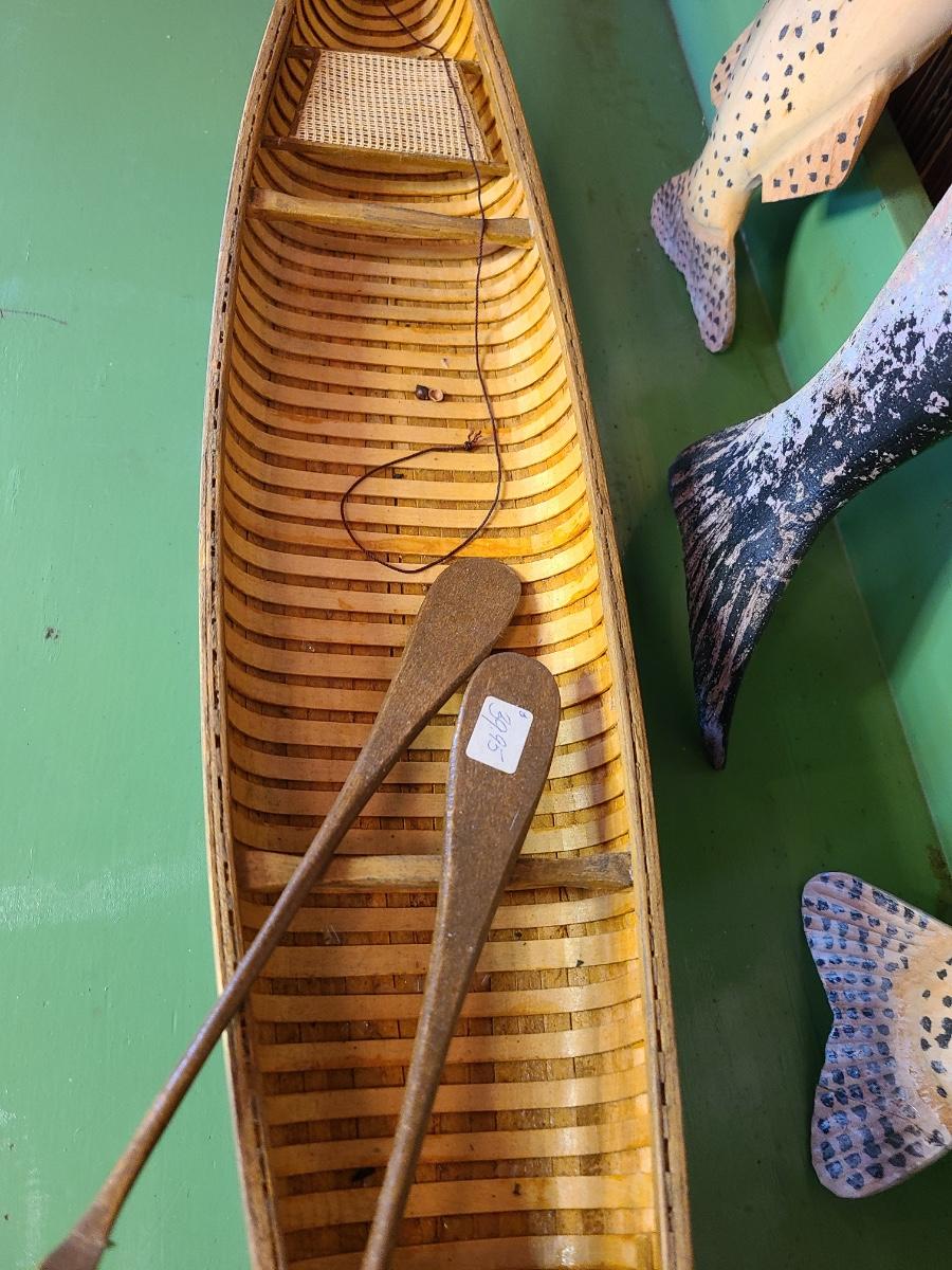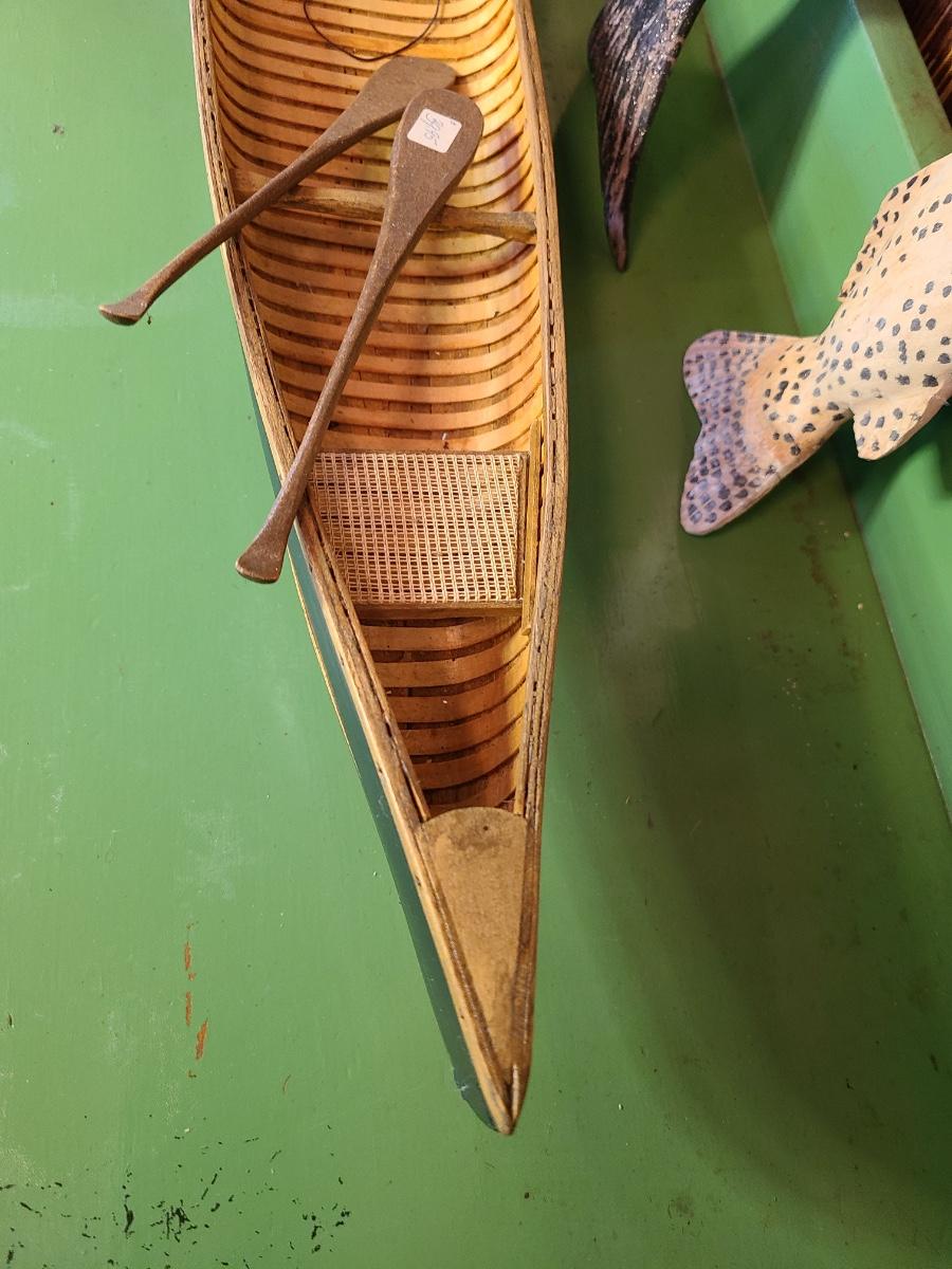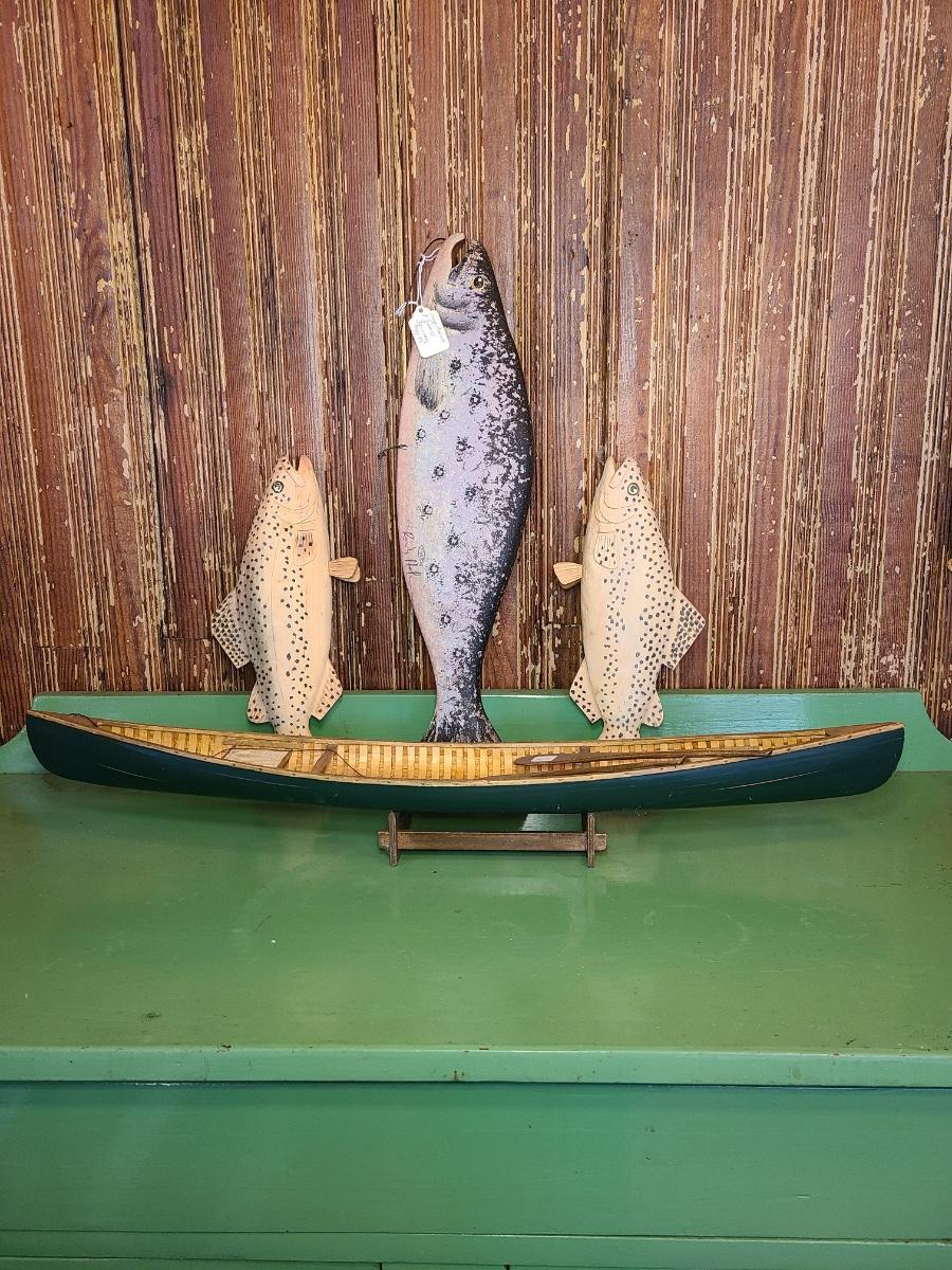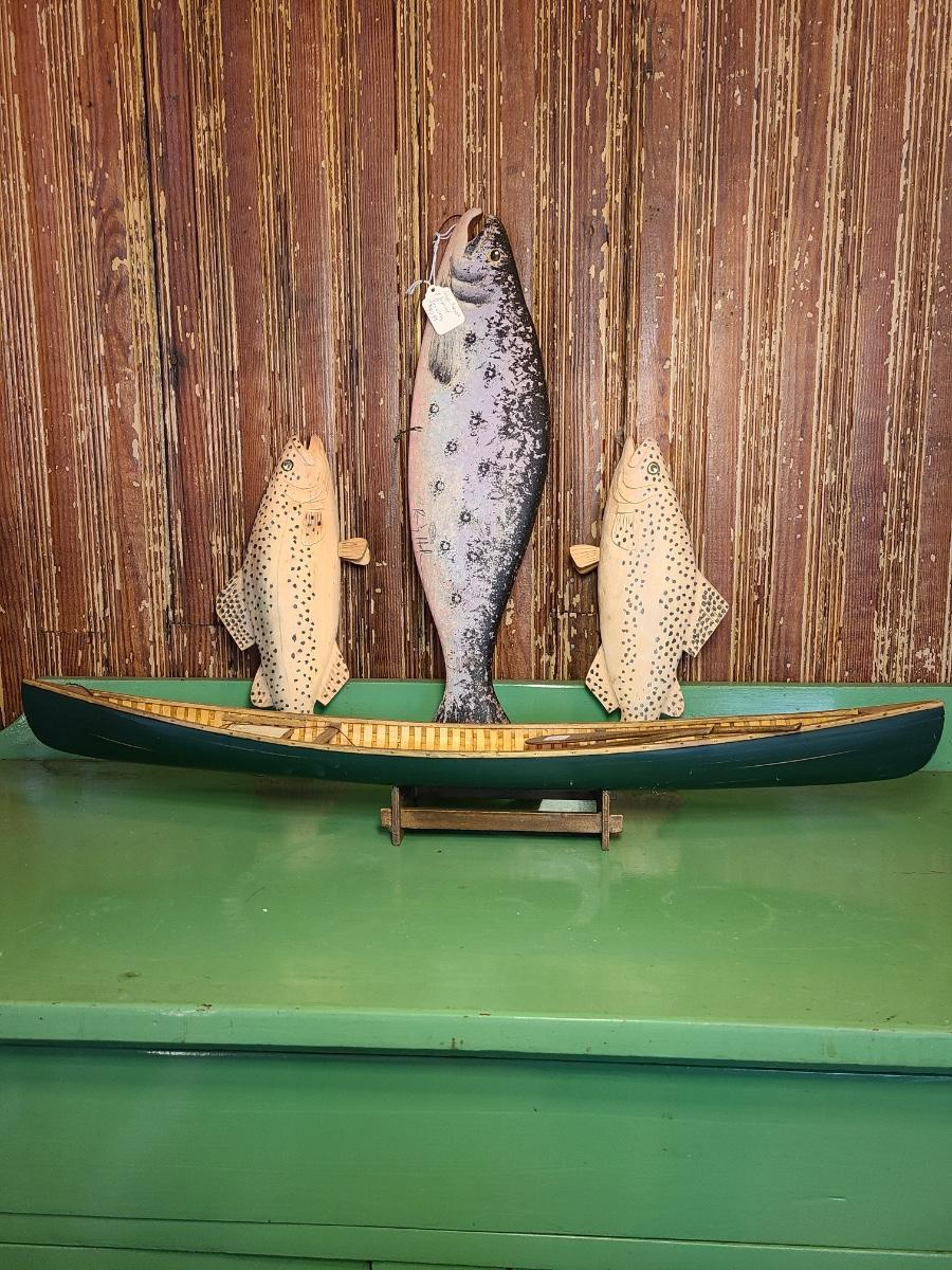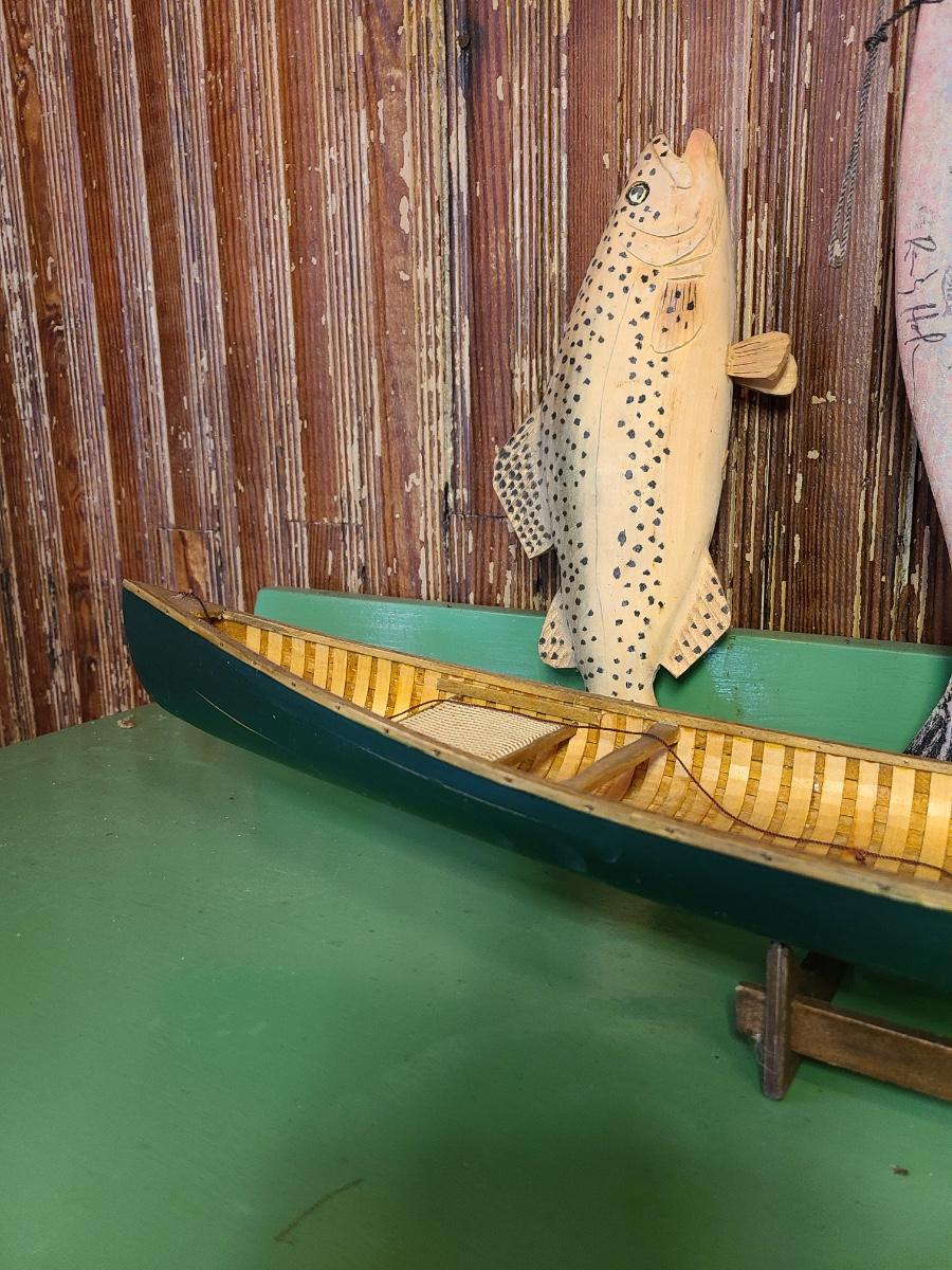 LOT 29: Wood Carved Long Model Canoe, and Carved Wood Art Fish (One Artist Signed)