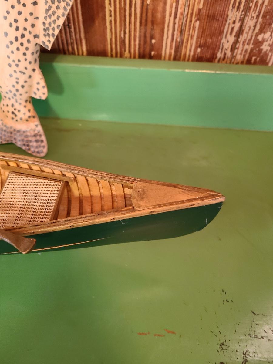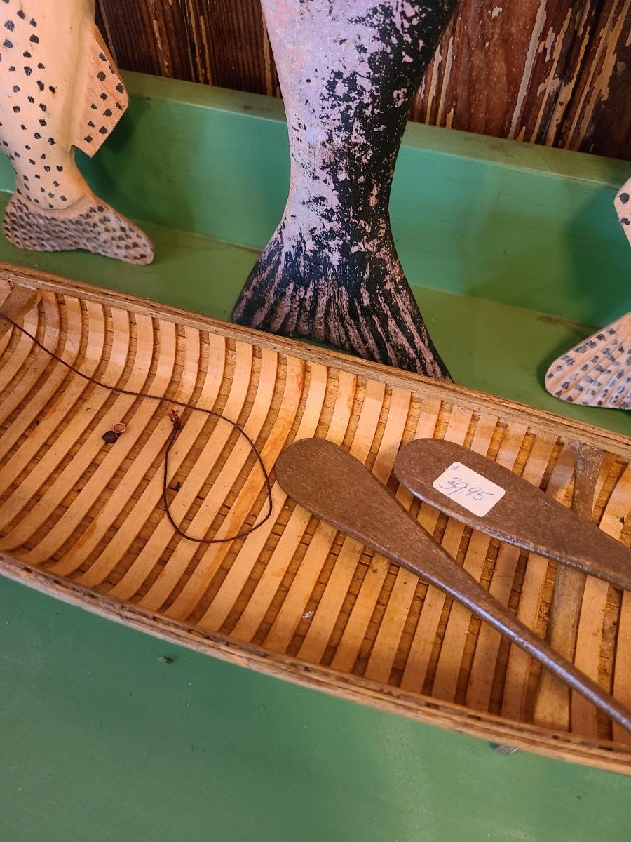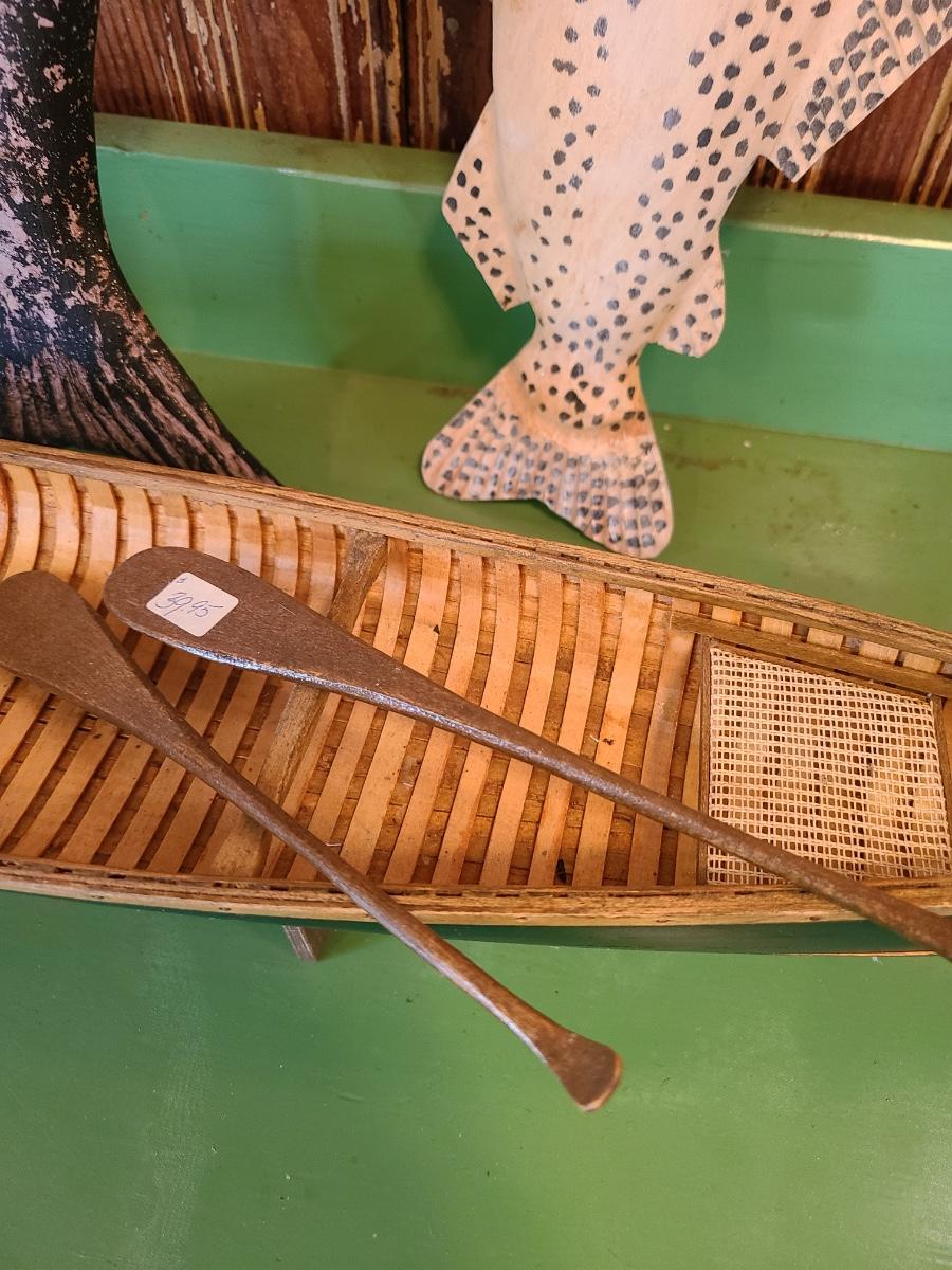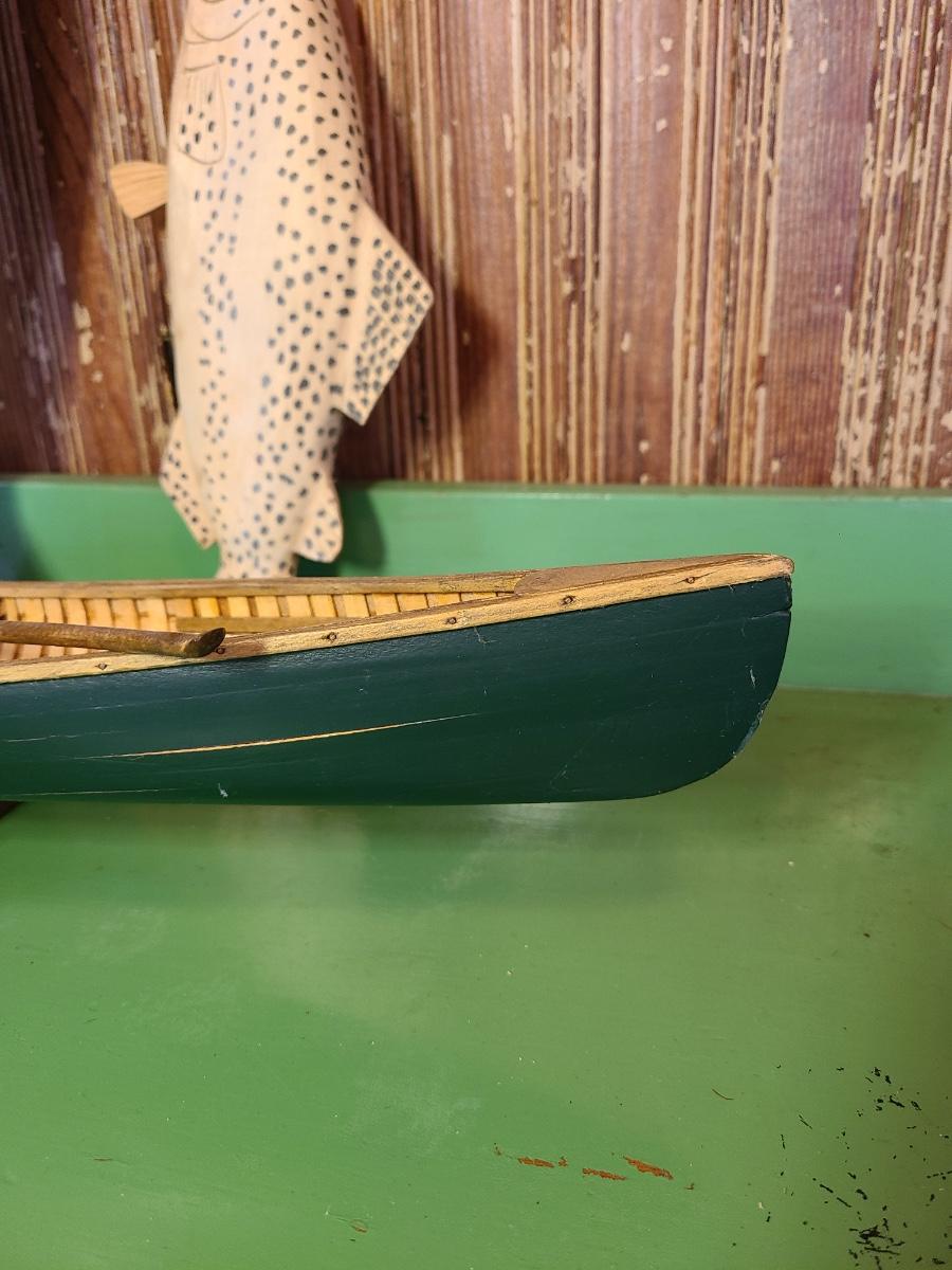LOT 29: Wood Carved Long Model Canoe, and Carved Wood Art Fish (One Artist Signed)