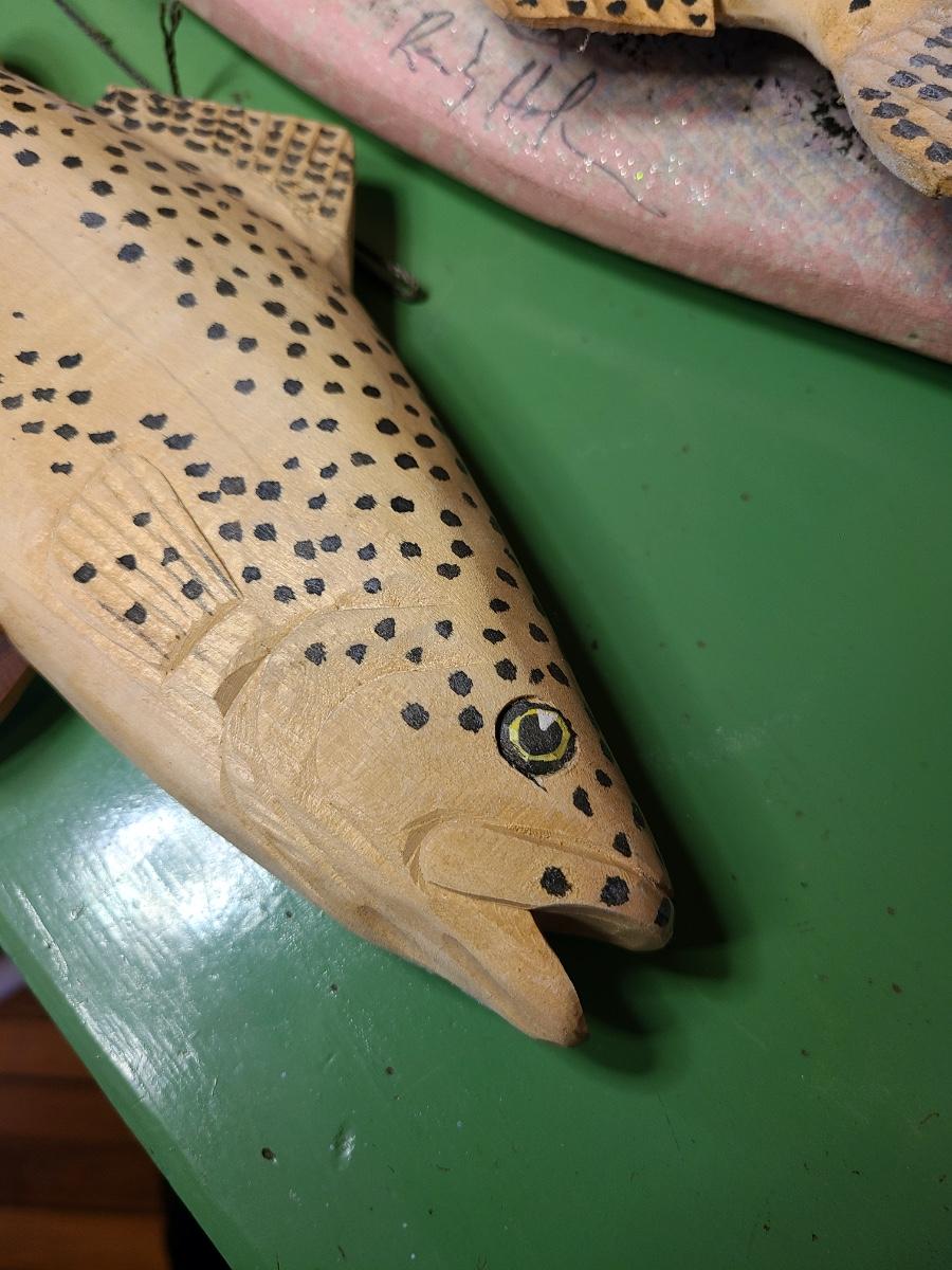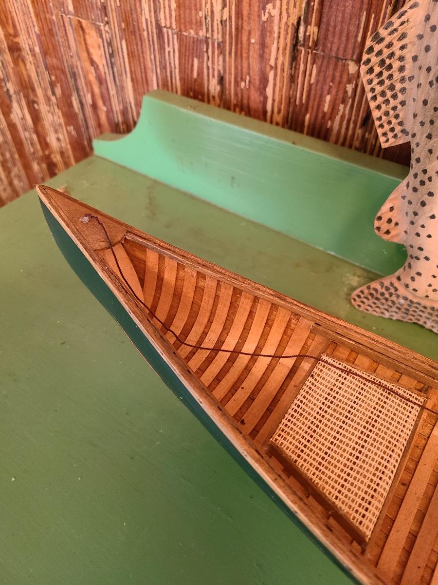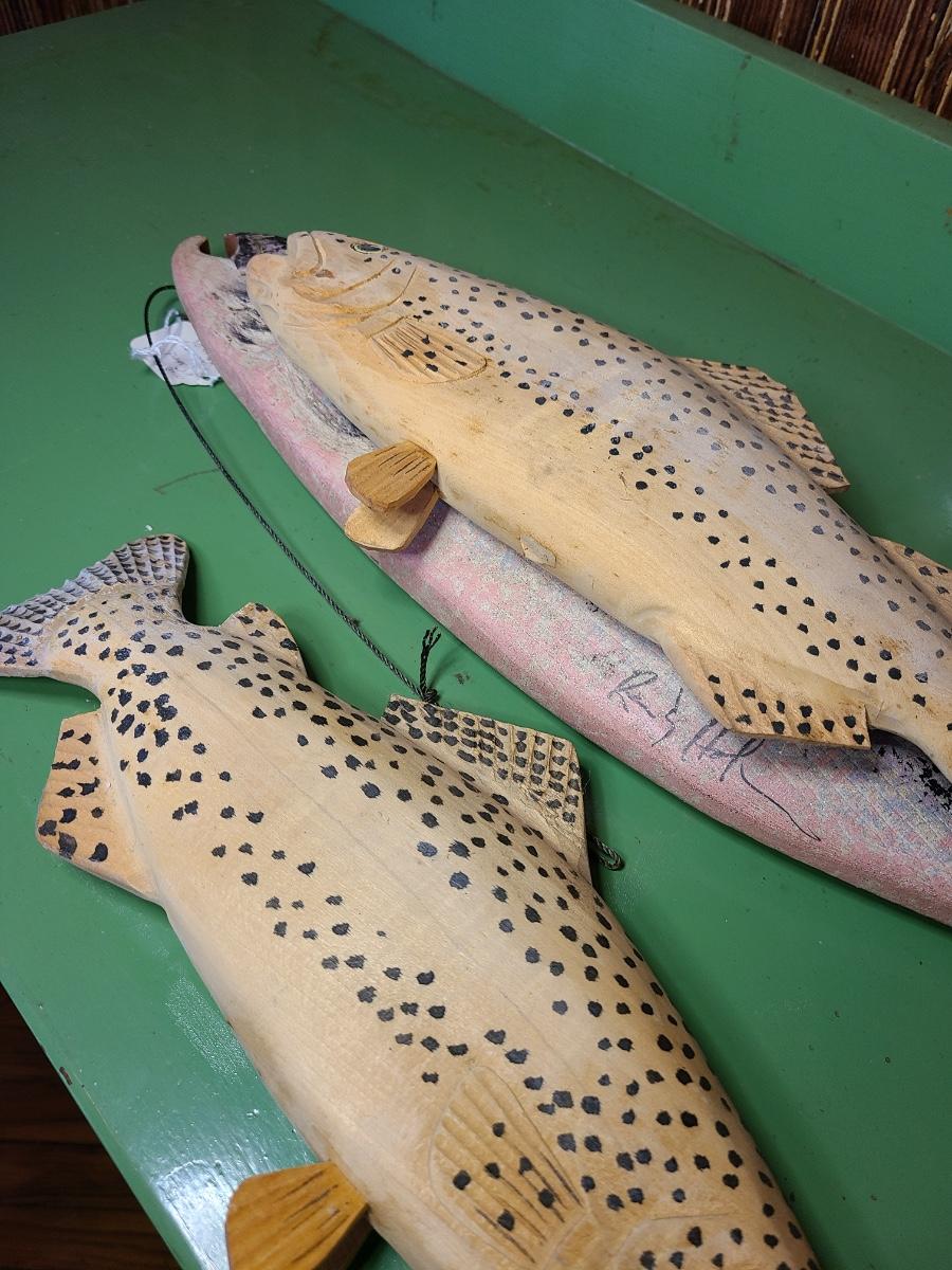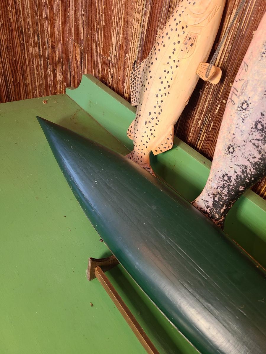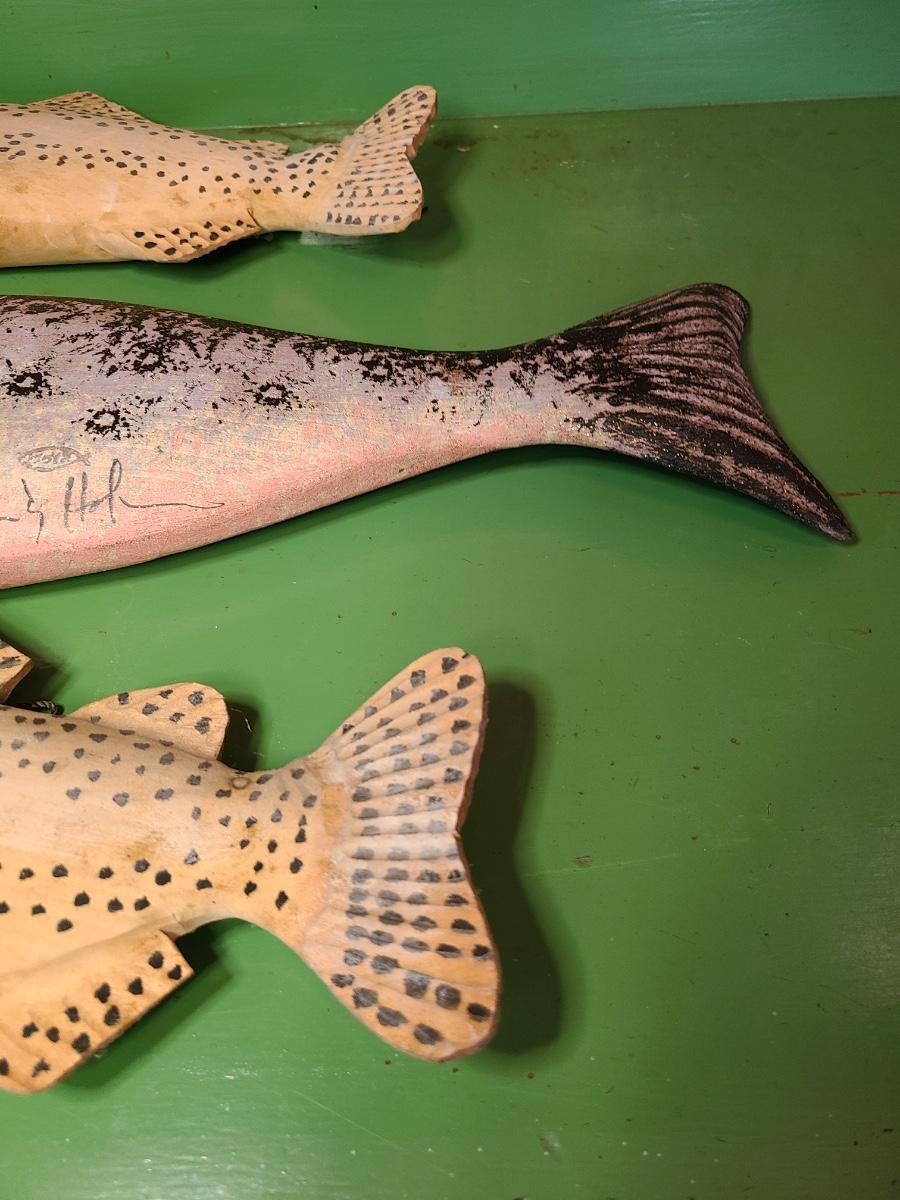 LOT 29: Wood Carved Long Model Canoe, and Carved Wood Art Fish (One Artist Signed)
