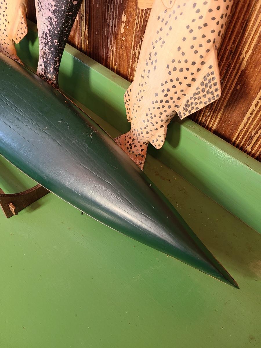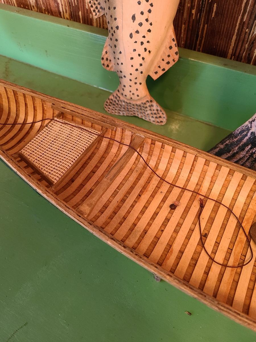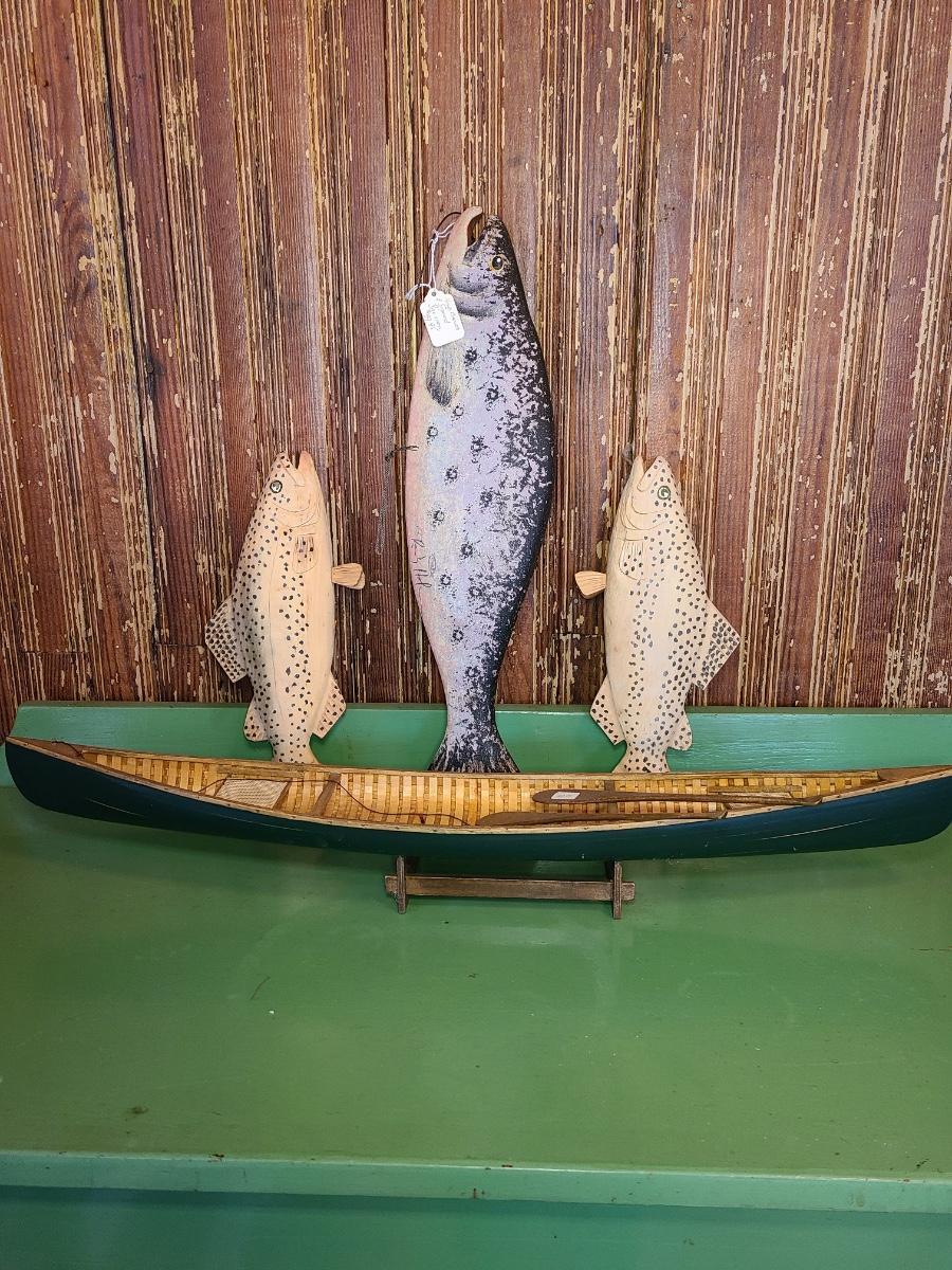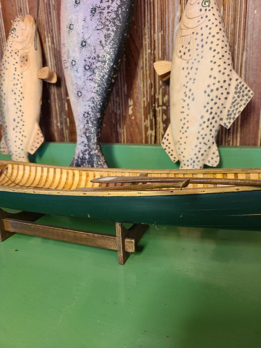 The craftsmanship on the canoe is amazing. Comes with two paddles and stand. The fish were hanging on the wall and looked so cool together. The larger fish is artist signed. It does not come with the paperwork that is shown, that is just to give you the details of the artist. That paperwork is attached to another of the same kind of fish in a different auction. Please see all pictures as they are the best representation of the items. The pictures show condition, measurements if taken, and what is included in the lot. Due to the large amount that we photograph and the time frame, we are not always able to take measurements. All items unless noted, are pre-owned and have been used. If you purchased furniture, you must bring help. We do not allow one person to carry large furniture out on their own. Bring help, tools and a truck for the safety of our client’s homes, and your personal safety. Any damages that result to the property including walls, and floors due to moving of the furniture will be charged to the buyer. Company policy. Thank you.